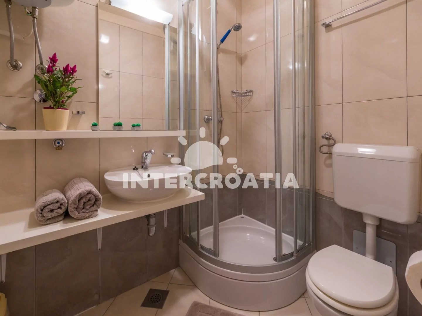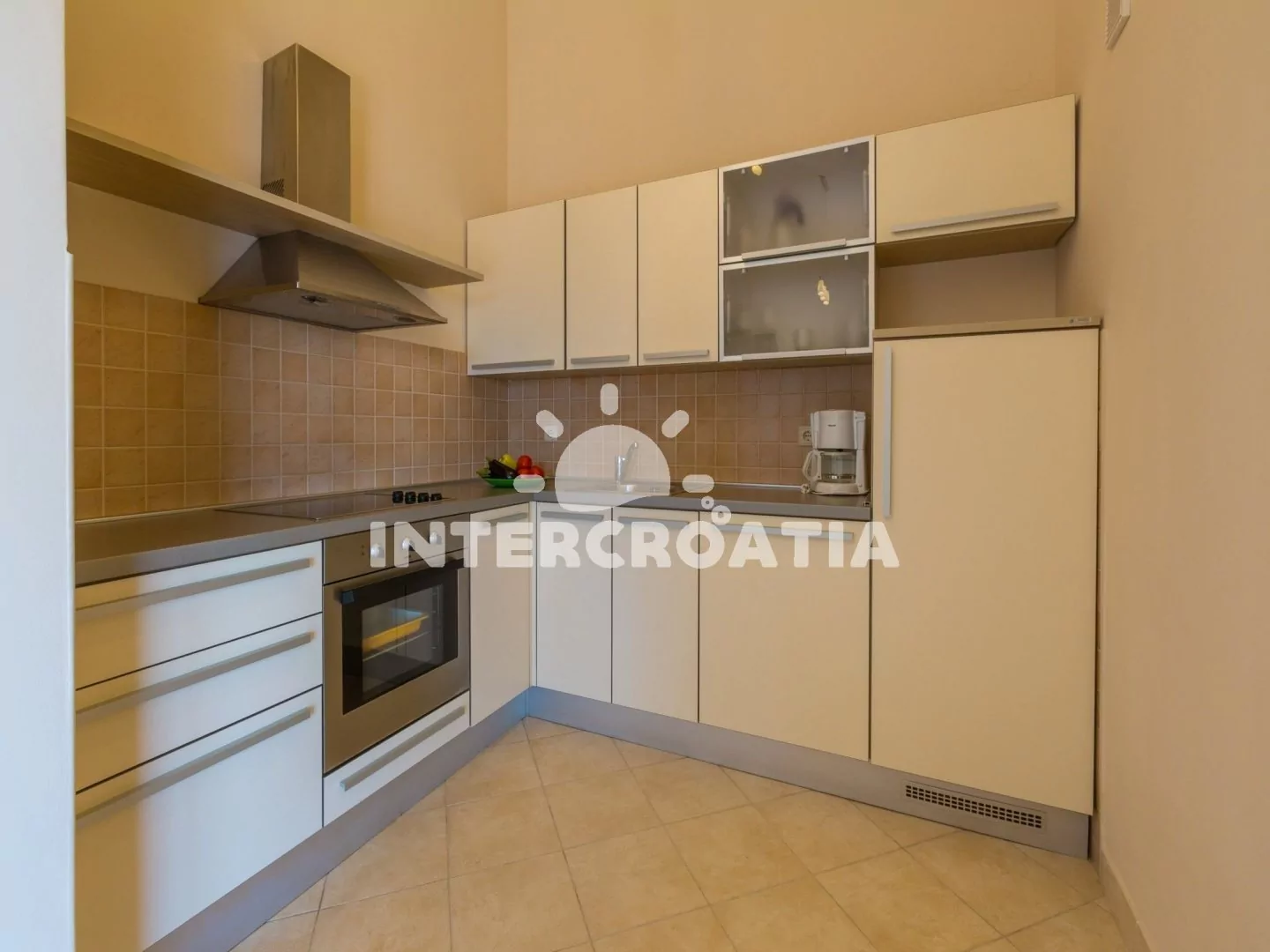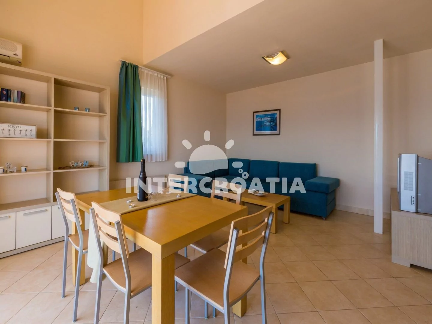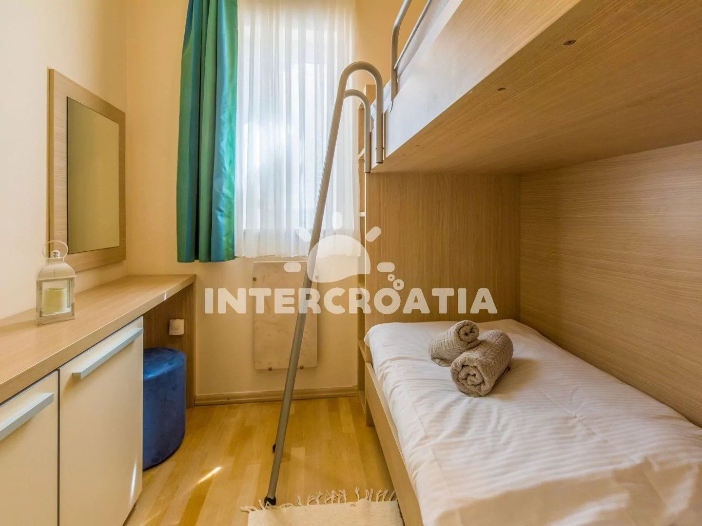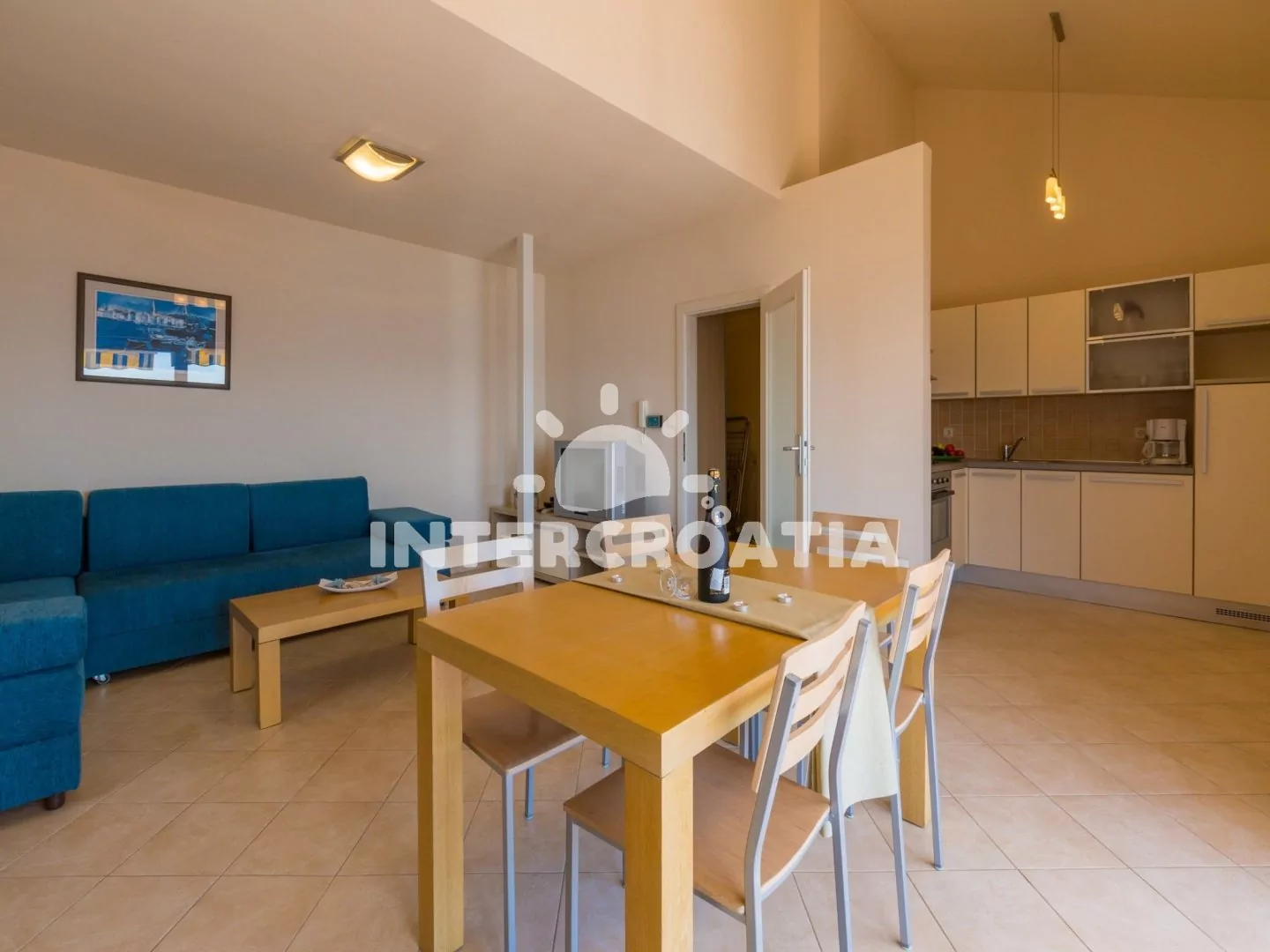 Apartmán (65 m2) s terasou a výhledem na moře, se nachází v 3. patře domu. Apartmán má 3 pokoje a je vhodný pro 4 až 6 osob. Obývací pokoj je spojený s kuchyní. Kuchyňská linka je vybavena sklokeramickou varnou deskou, digestoří, vestavěnou troubou, rychlovarnou konvicí, kávovarem, toustovačem, nádobím a lednicí s mrazákem. Obývací pokoj s jídelním stolem pro 5 osob, rohovou pohovkou (rozložitelná na extra lůžko pro 2 osoby), televizí se satelitním programem, klimatizací a vstupem na terasu. První ložnice s dvoulůžkem, klimatizací a vstupem na terasu. Druhá ložnice s dvěma jednolůžky (patrová postel). Koupelna se sprchovým koutem, umyvadlem, fénem a wc. Hostům je k dispozici parkování u objektu zdarma.