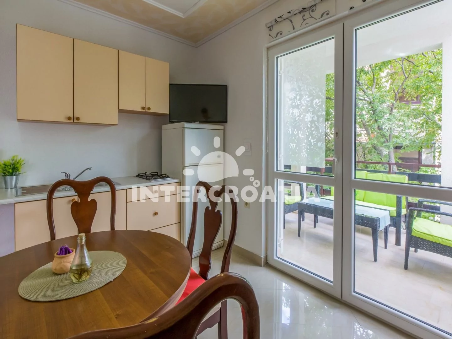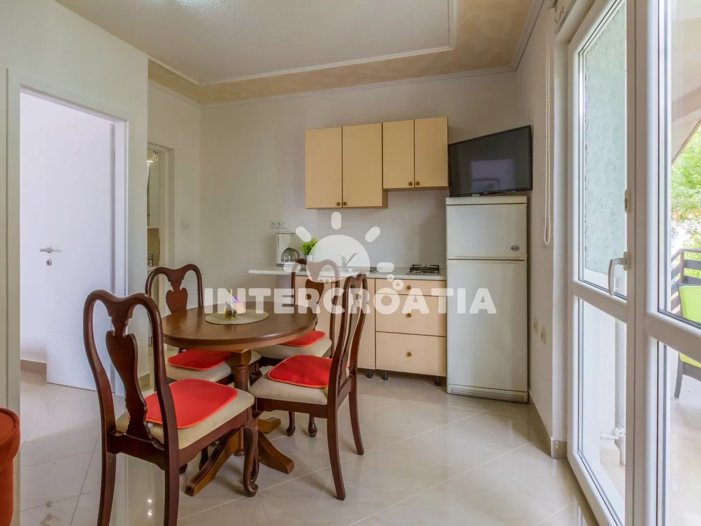 Apartmán s terasou se nachází v 1. patře domu a je vhodný pro 2 až 4 osoby. Obývací pokoj je spojený s kuchyní. Kuchyňská linka s dvouplotýnkovým vařičem, rychlovarnou konvicí, kávovarem, toustovačem…