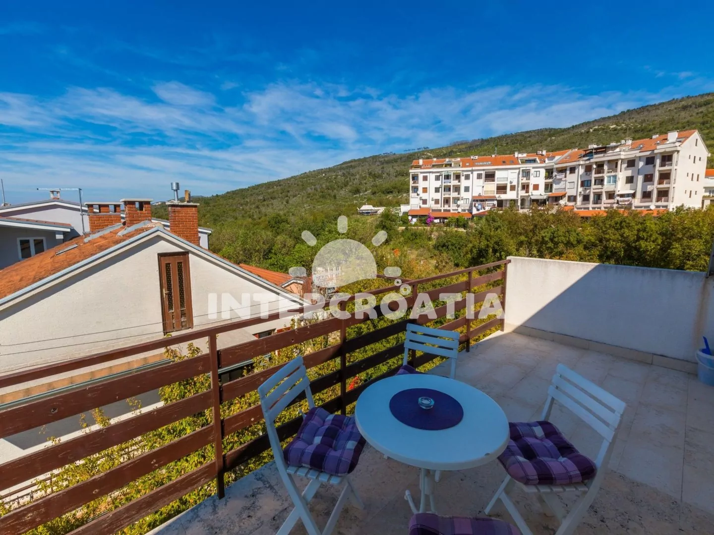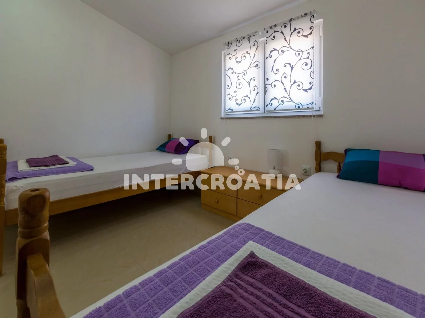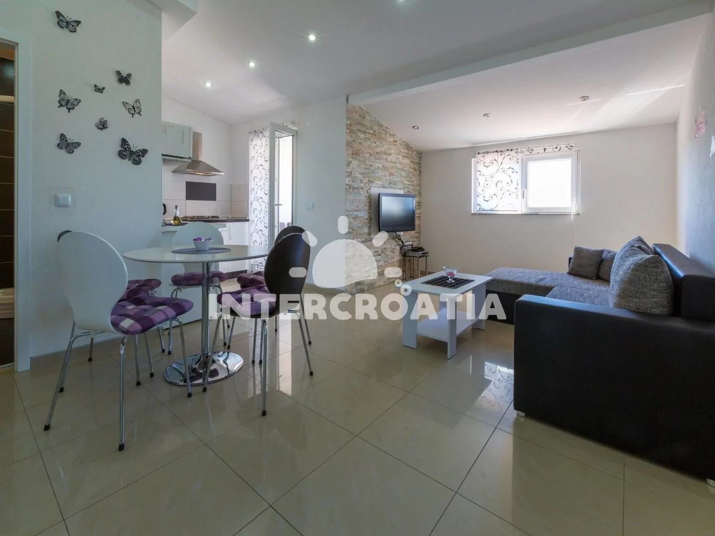 Podkrovní apartmán s terasou a krytým balkonem nabízí výhled na moře. Apartmán je vhodný pro 4 až 5 osob. Obývací pokoj je spojený s kuchyní. Kuchyňská linka s varnou deskou, digestoří, mikrovlnnou…