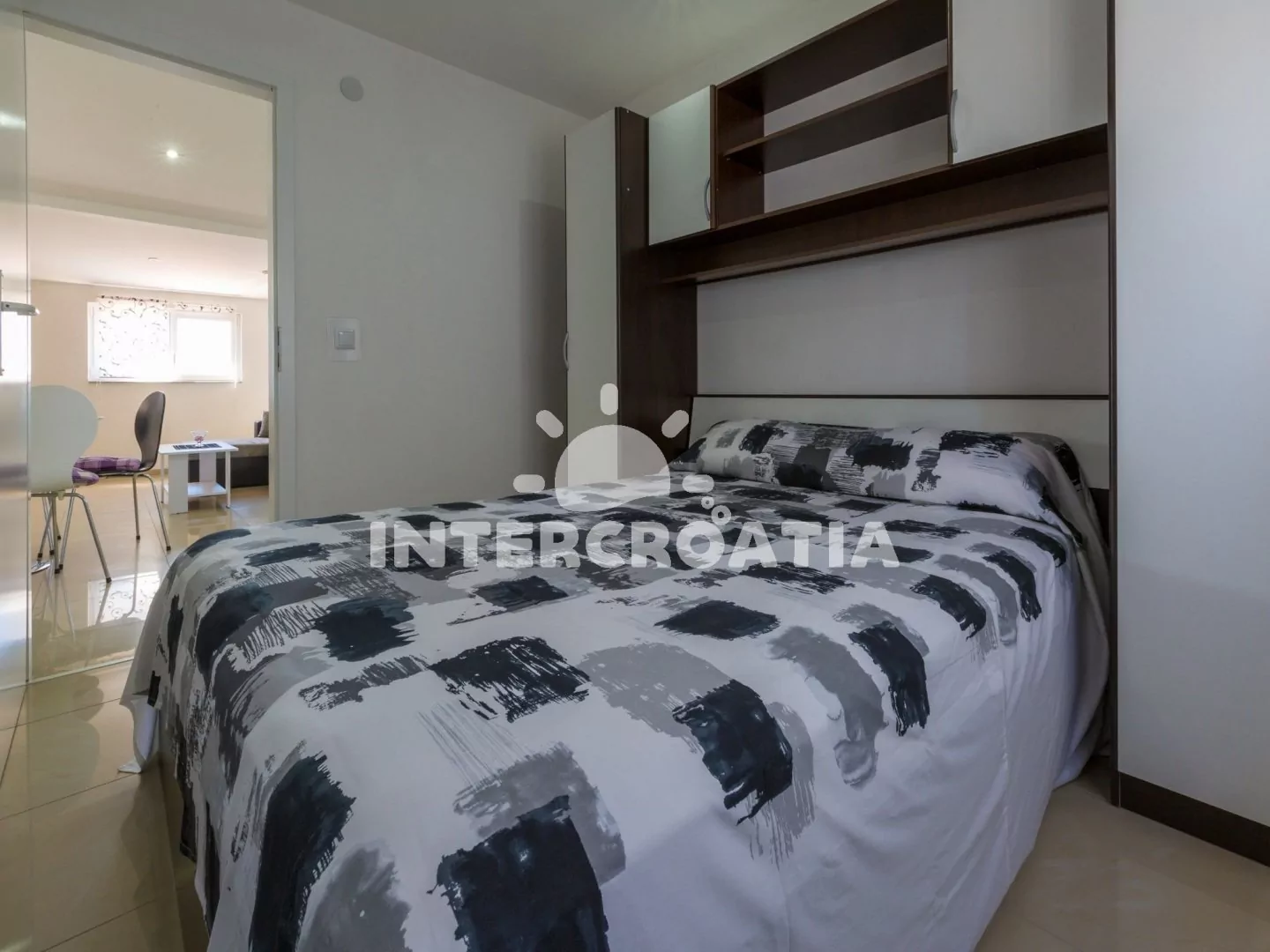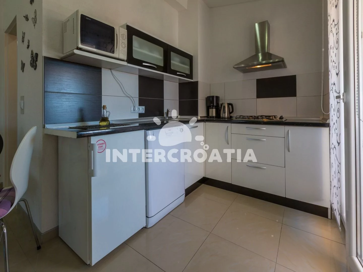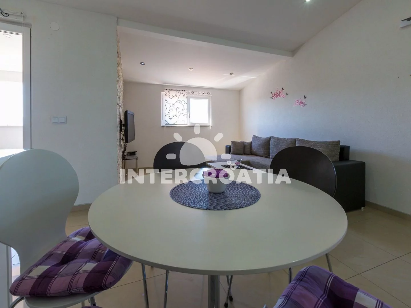 Podkrovní apartmán s terasou a krytým balkonem nabízí výhled na moře. Apartmán je vhodný pro 4 až 5 osob. Obývací pokoj je spojený s kuchyní. Kuchyňská linka s varnou deskou, digestoří, mikrovlnnou…