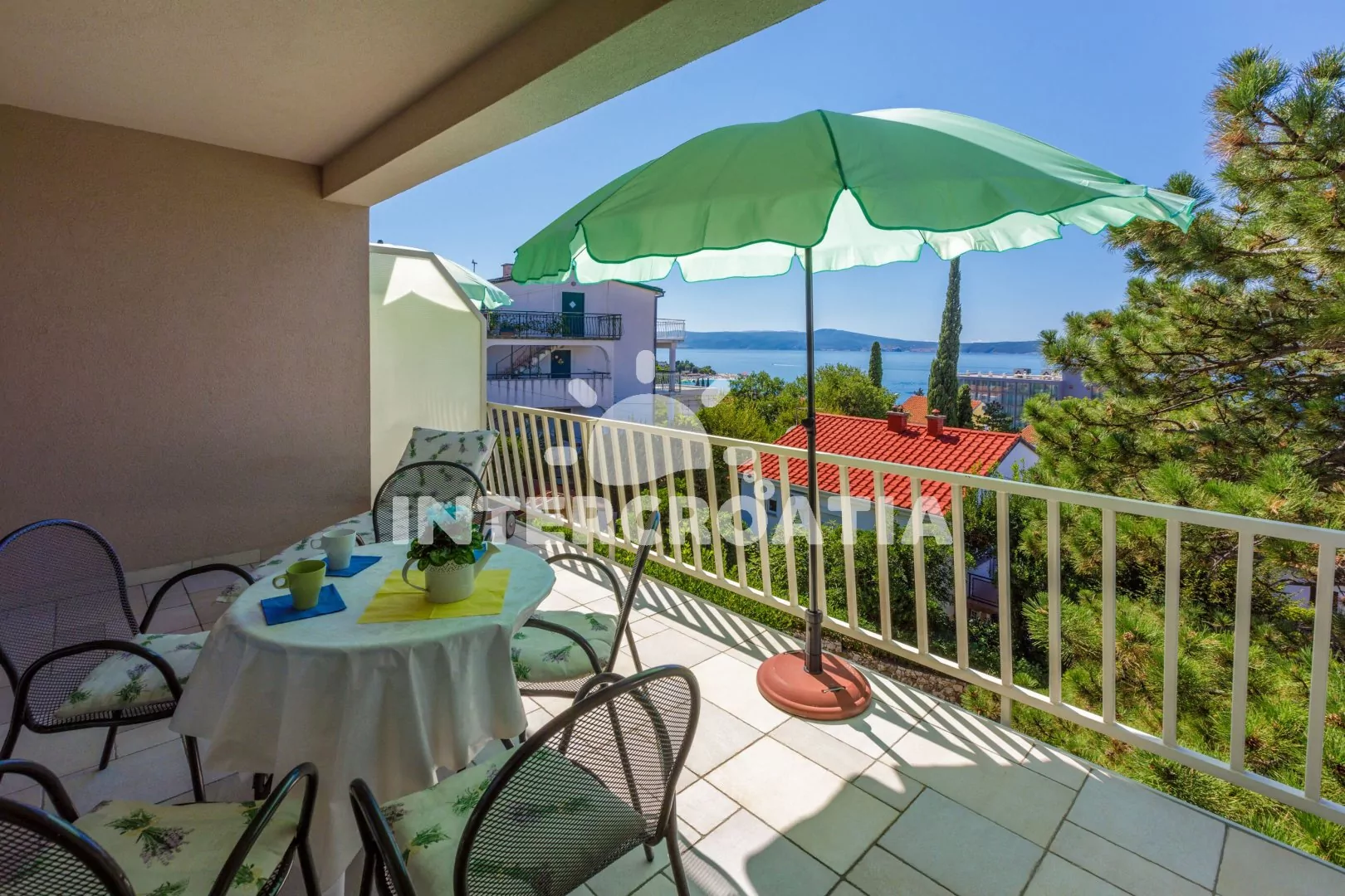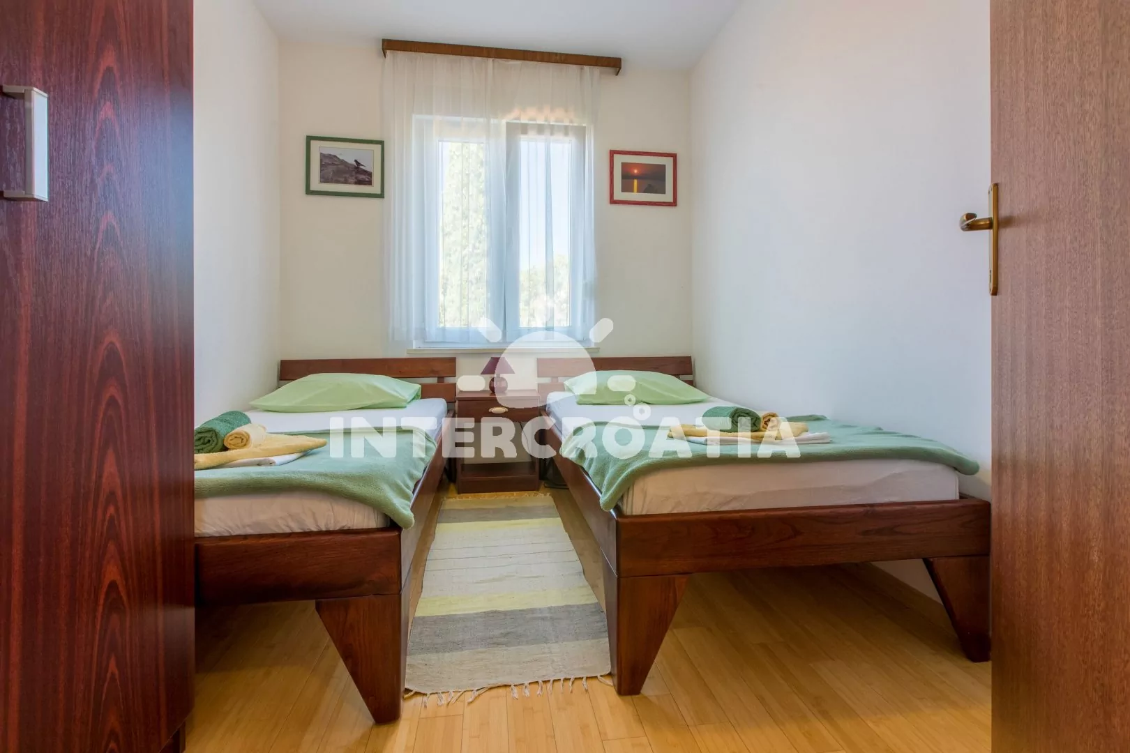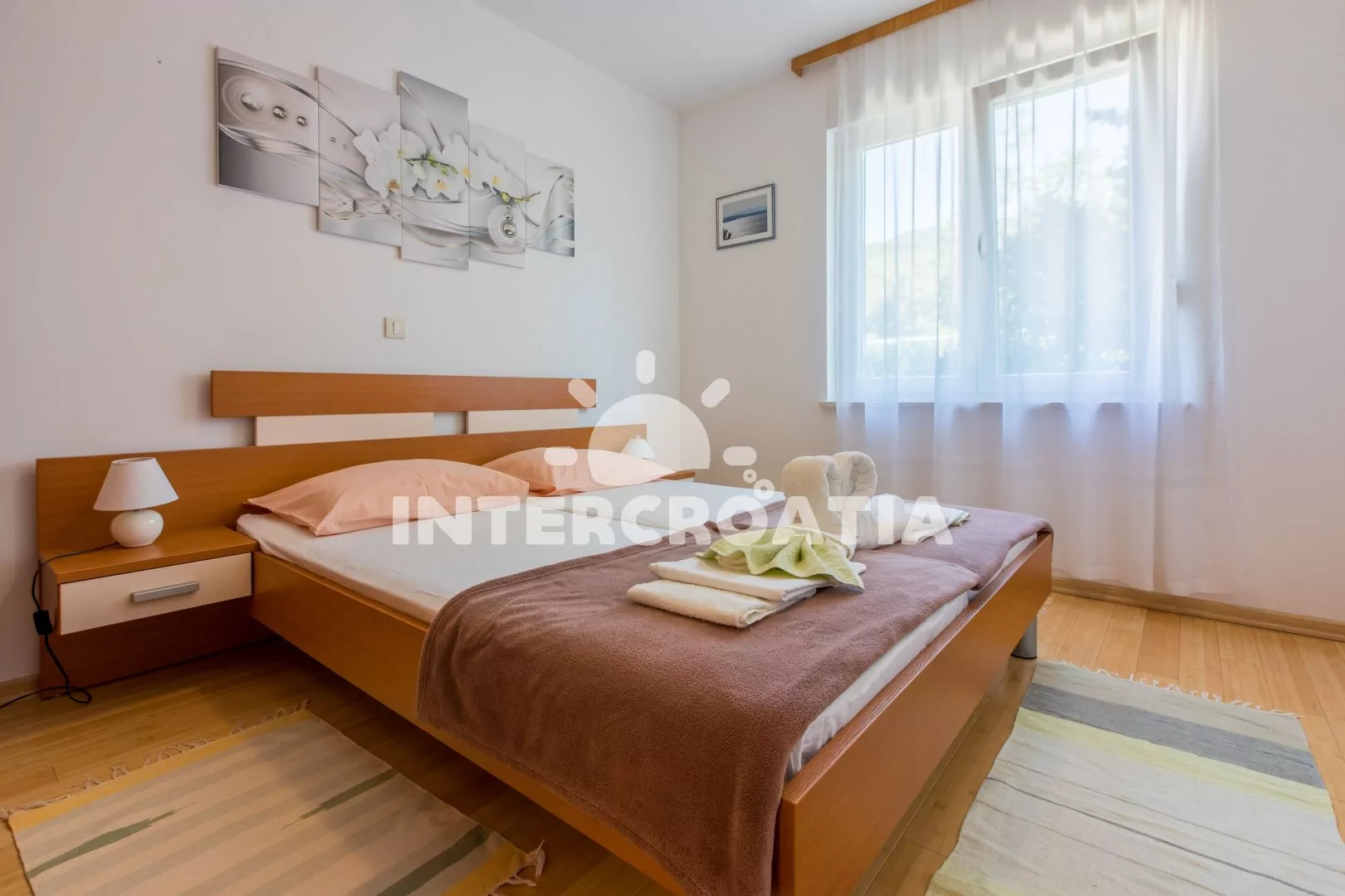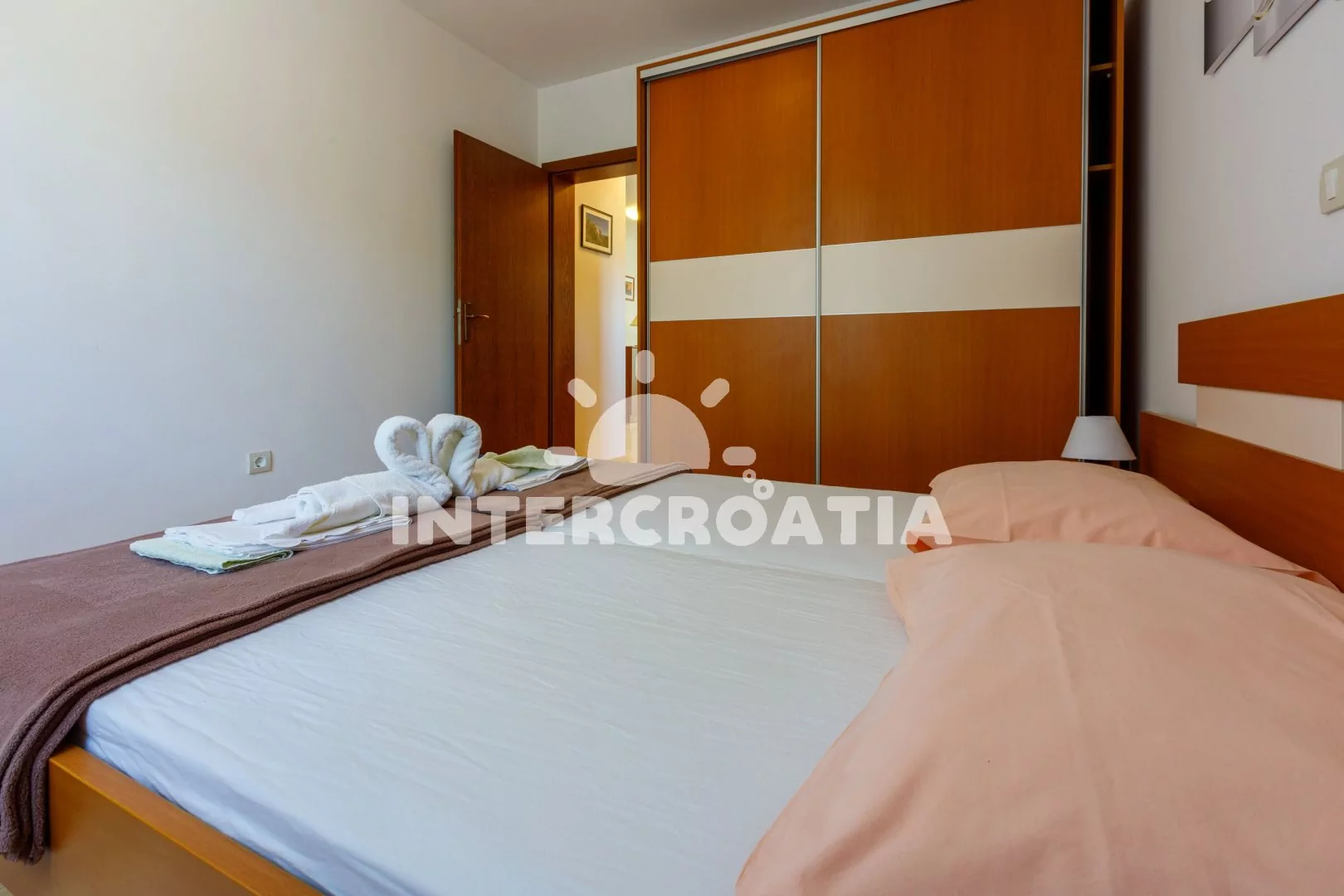 Apartmán (55 m2) s vlastní terasou a výhledem na moře se nachází v 2. patře domu a je vhodný pro 4 až 5 osob. Obývací pokoj je spojený s kuchyní. Kuchyňská linka je vybavena sklokeramickou varnou deskou, kávovarem, nádobím a lednicí s mrazákem. Obývací pokoj s jídelním stolem pro 5 osob, pohovkou (rozložitelná na extra lůžko pro 1 osobu), televizí se satelitním programem, klimatizací a vstupem na terasu. První ložnice s dvoulůžkem. Druhá ložnice s dvěma jednolůžky. Koupelna se sprchovým koutem, umyvadlem a wc. Hostům je k dispozici parkování u objektu zdarma.