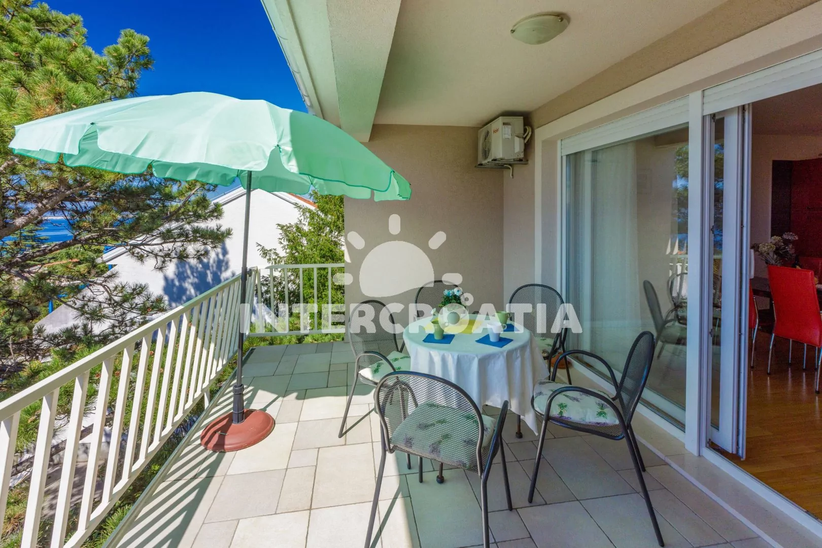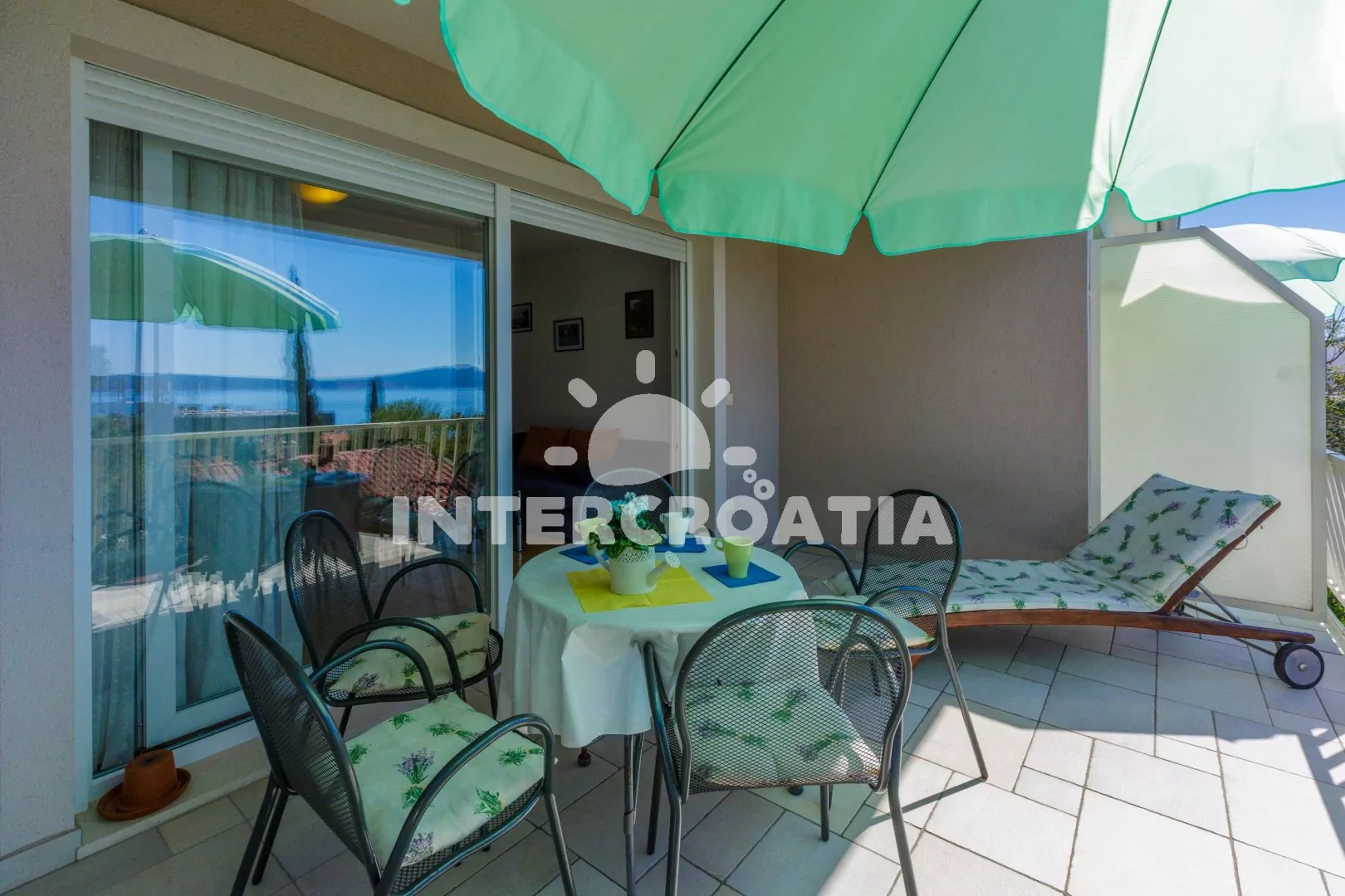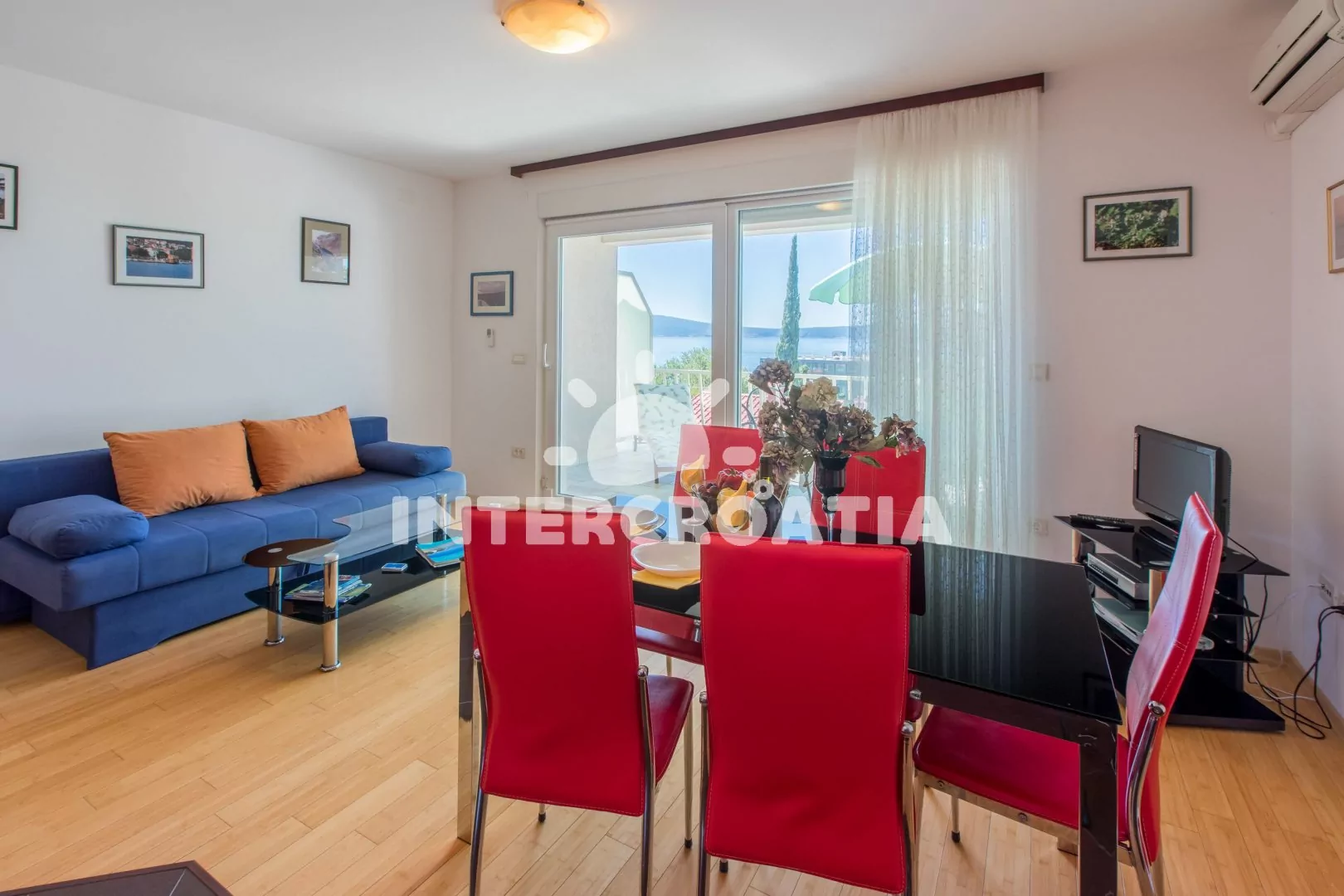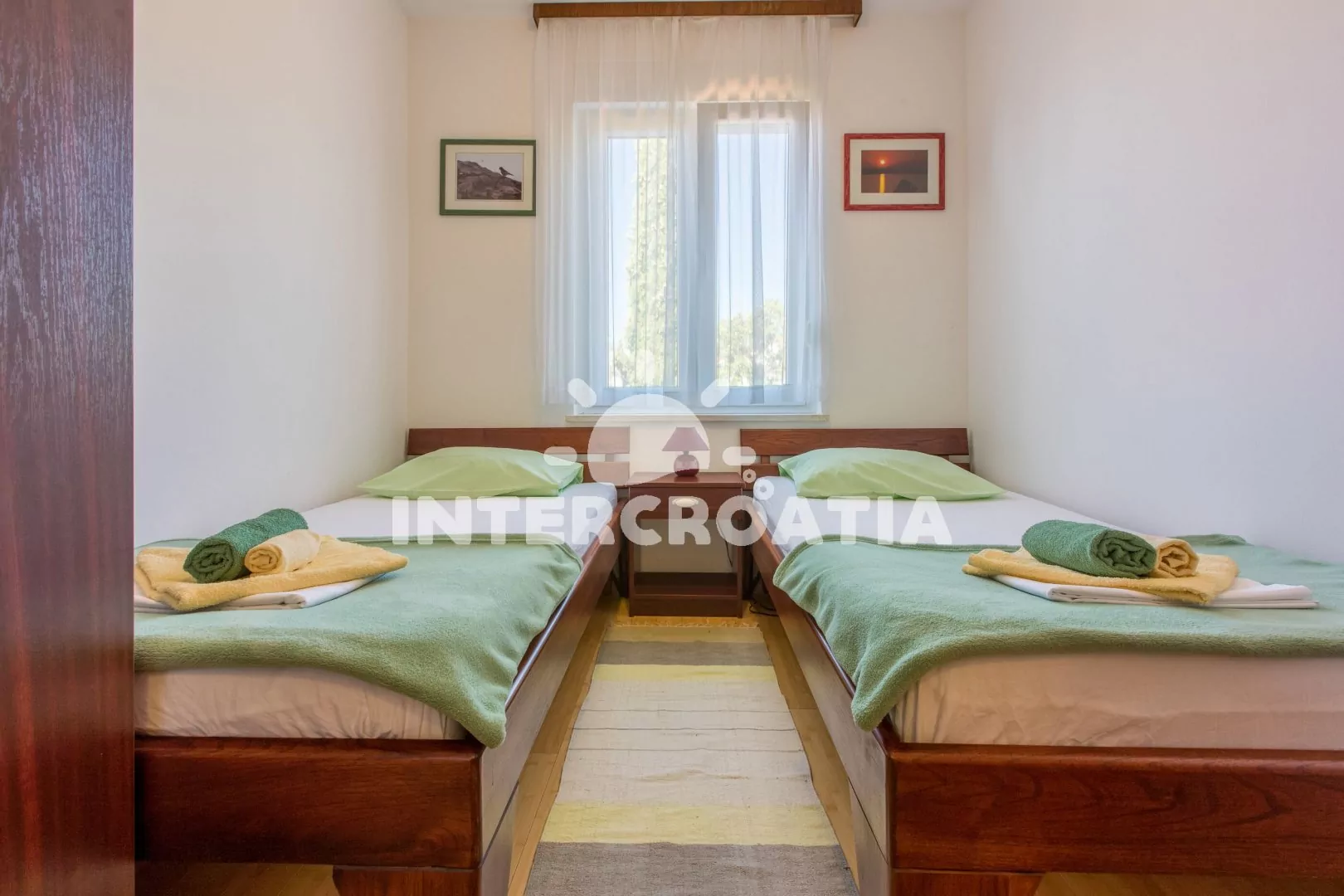 Apartmán (55 m2) s vlastní terasou a výhledem na moře se nachází v 2. patře domu a je vhodný pro 4 až 5 osob. Obývací pokoj je spojený s kuchyní. Kuchyňská linka je vybavena sklokeramickou varnou deskou, kávovarem, nádobím a lednicí s mrazákem. Obývací pokoj s jídelním stolem pro 5 osob, pohovkou (rozložitelná na extra lůžko pro 1 osobu), televizí se satelitním programem, klimatizací a vstupem na terasu. První ložnice s dvoulůžkem. Druhá ložnice s dvěma jednolůžky. Koupelna se sprchovým koutem, umyvadlem a wc. Hostům je k dispozici parkování u objektu zdarma.