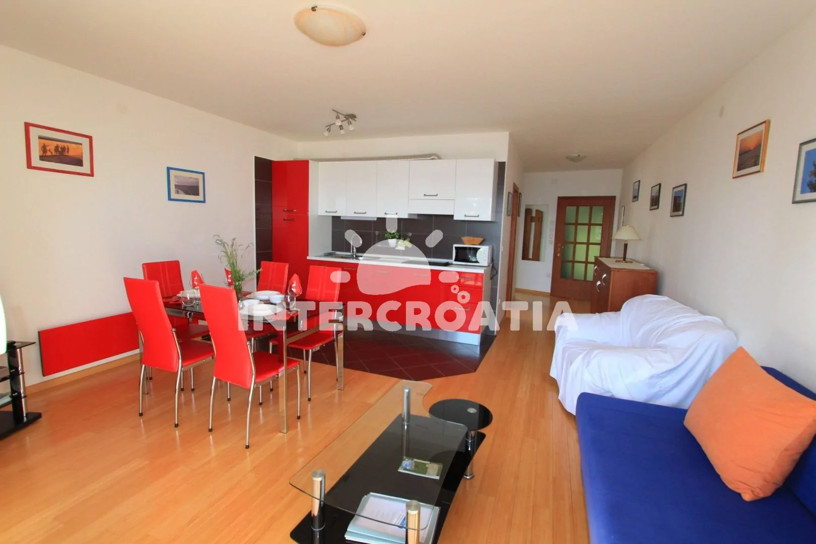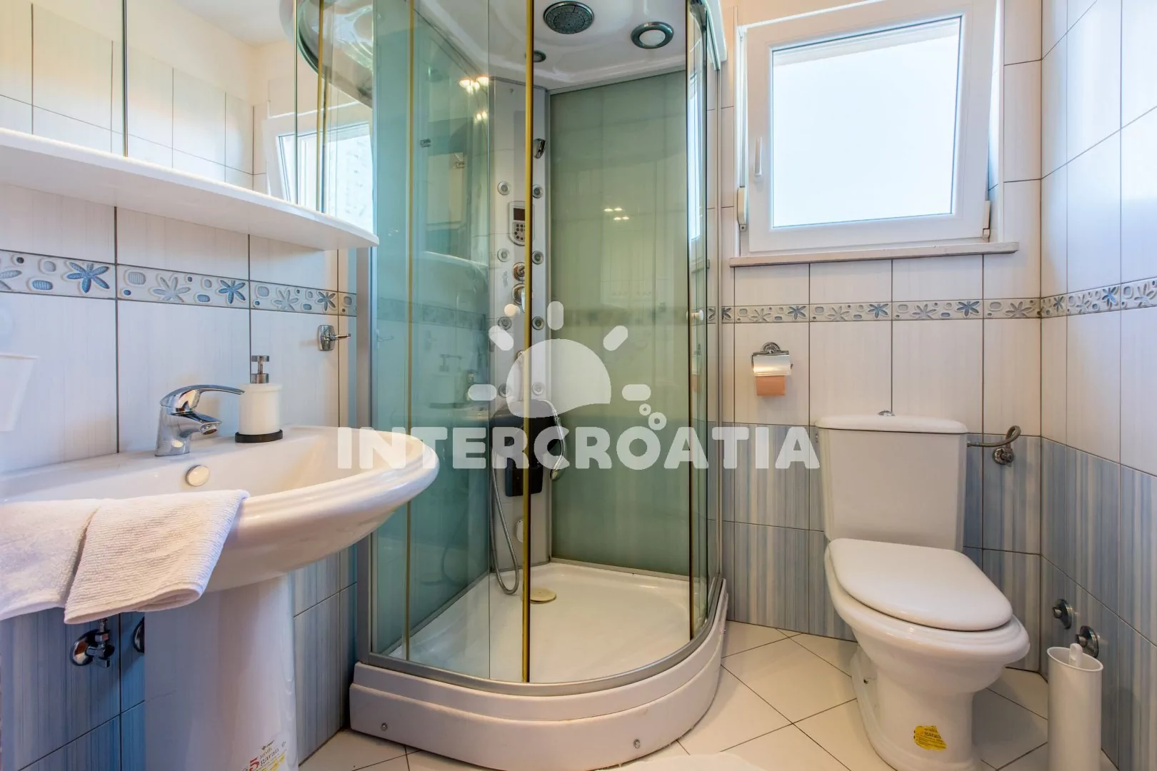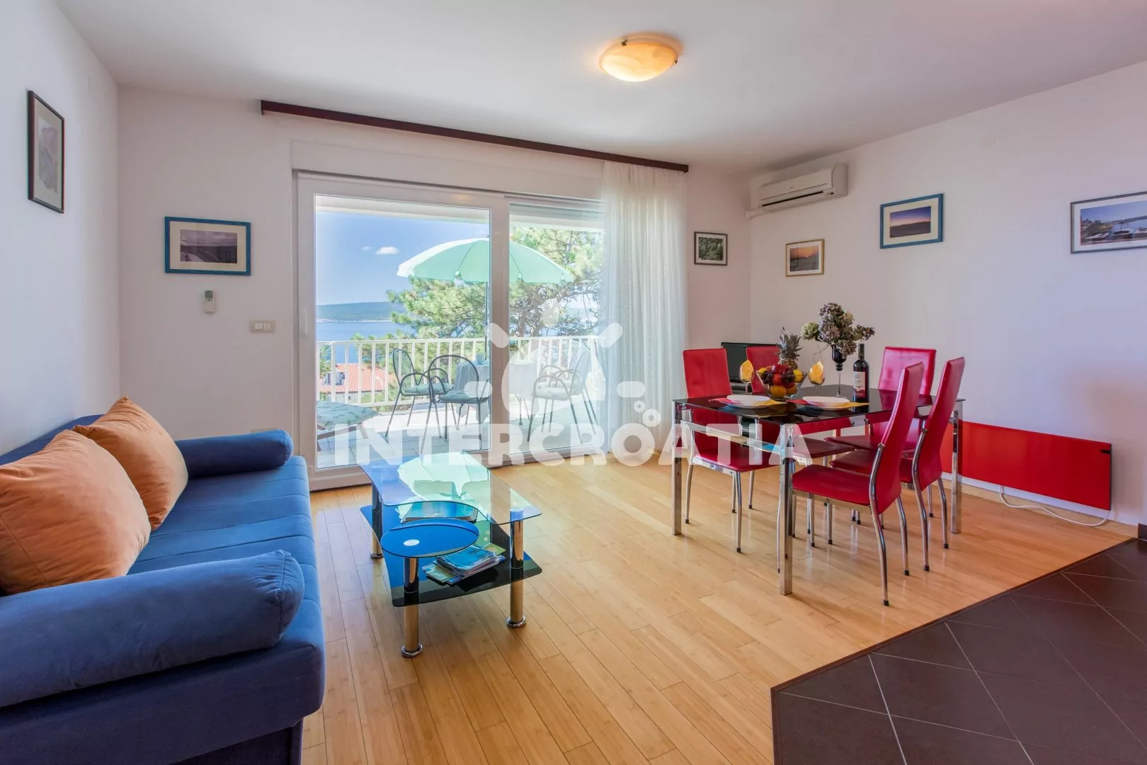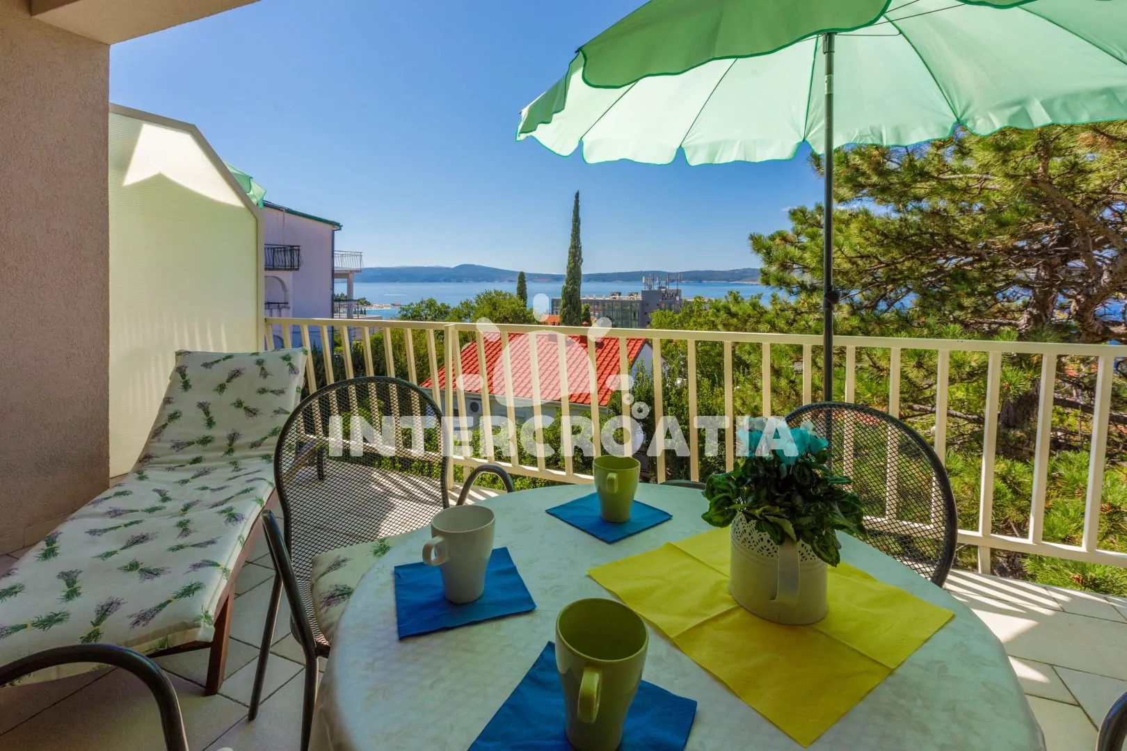 Apartmán (55 m2) s vlastní terasou a výhledem na moře se nachází v 2. patře domu a je vhodný pro 4 až 5 osob. Obývací pokoj je spojený s kuchyní. Kuchyňská linka je vybavena sklokeramickou varnou deskou, kávovarem, nádobím a lednicí s mrazákem. Obývací pokoj s jídelním stolem pro 5 osob, pohovkou (rozložitelná na extra lůžko pro 1 osobu), televizí se satelitním programem, klimatizací a vstupem na terasu. První ložnice s dvoulůžkem. Druhá ložnice s dvěma jednolůžky. Koupelna se sprchovým koutem, umyvadlem a wc. Hostům je k dispozici parkování u objektu zdarma.