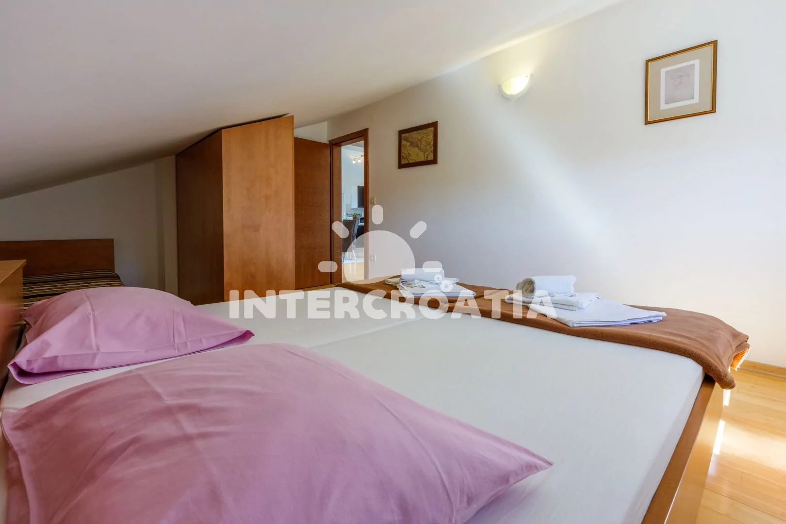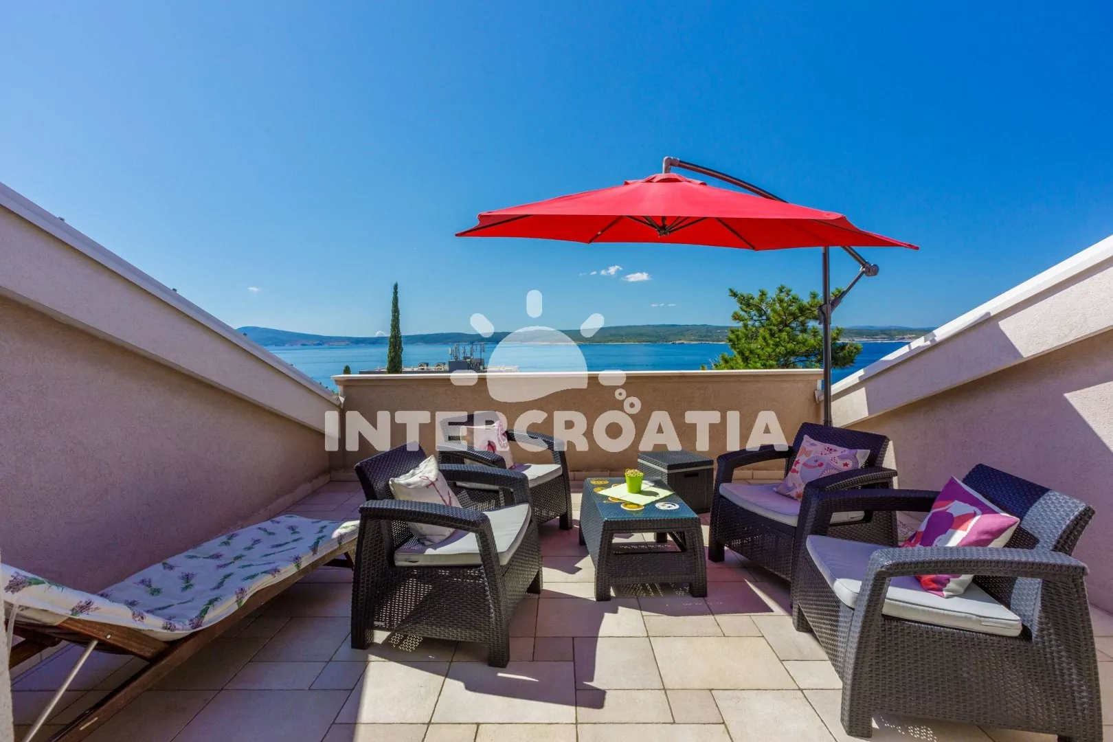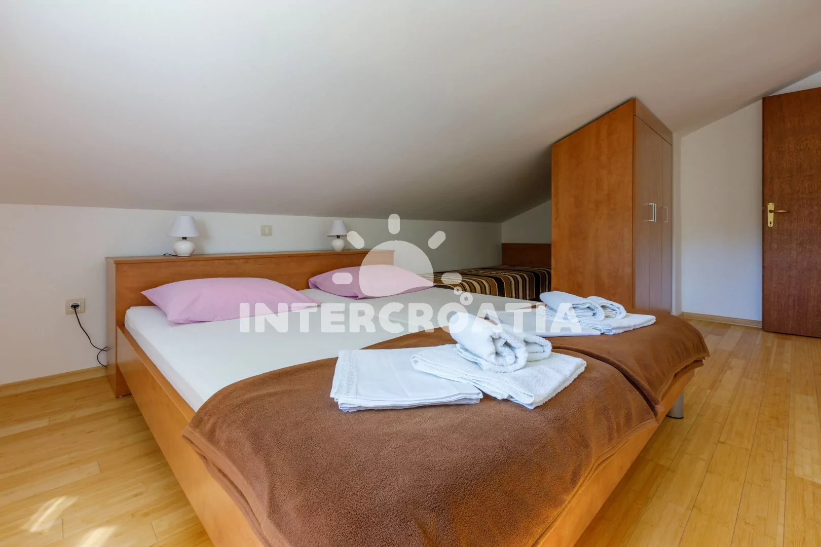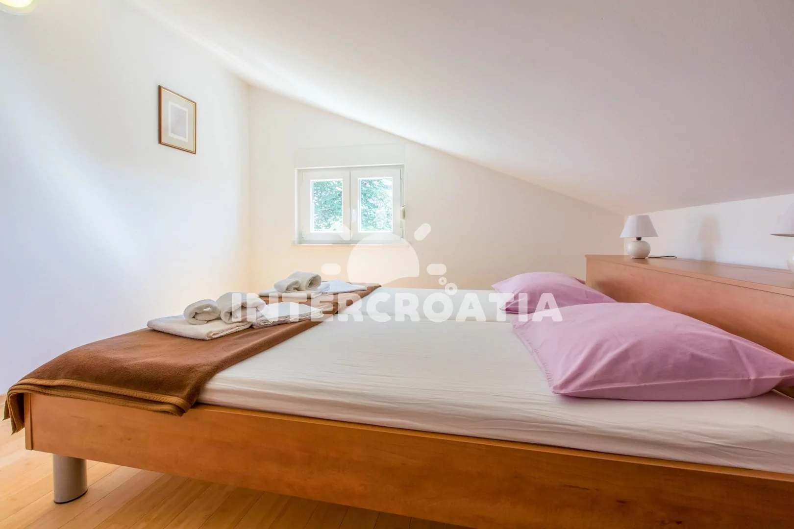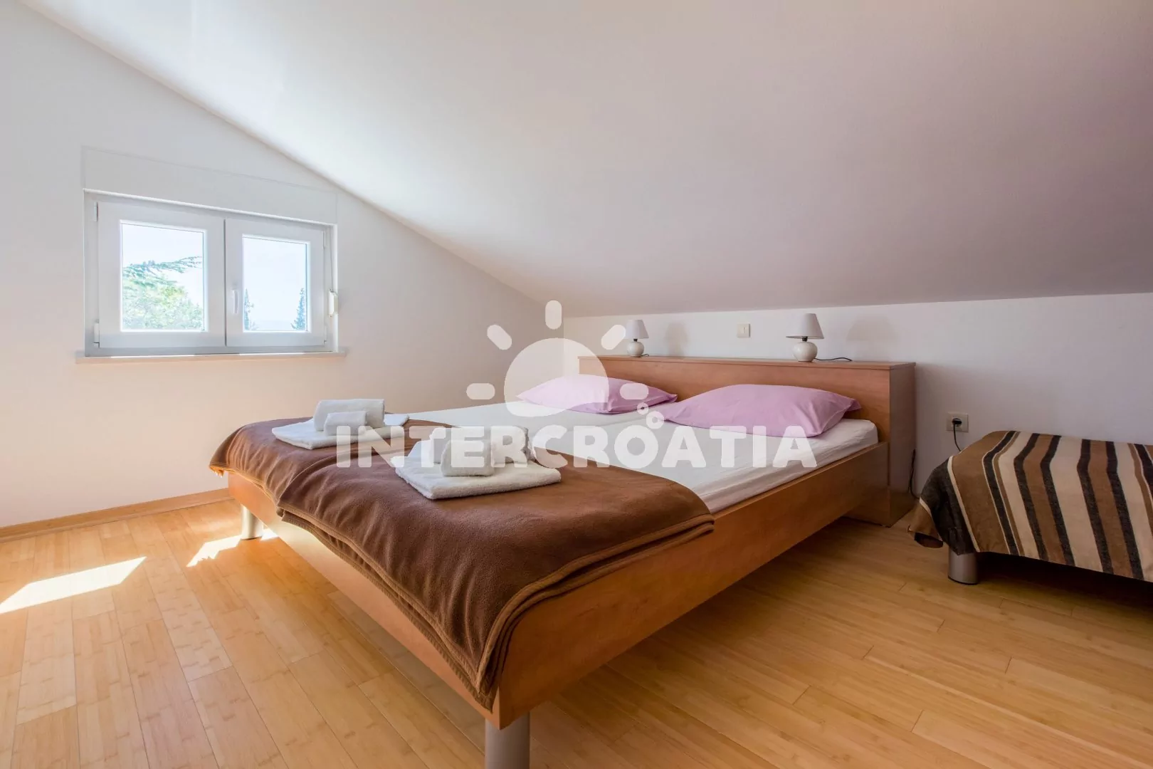 Podkrovní apartmán (83 m2) s vlastní terasou a výhledem na moře je vhodný pro 6 osob. Obývací pokoj je spojený s kuchyní. Kuchyňská linka je vybavena sklokeramickou varnou deskou, kávovarem, nádobím a lednicí s mrazákem. Obývací pokoj s jídelním stolem pro 6 osob, pohovkou, televizí se satelitním programem, radiem, klimatizací a vstupem na terasu. První ložnice s dvoulůžkem. Druhá ložnice s dvoulůžkem. Třetí ložnice s dvěma jednolůžky. Koupelna se sprchovým koutem, umyvadlem a wc. Hostům je k dispozici parkování u objektu zdarma.