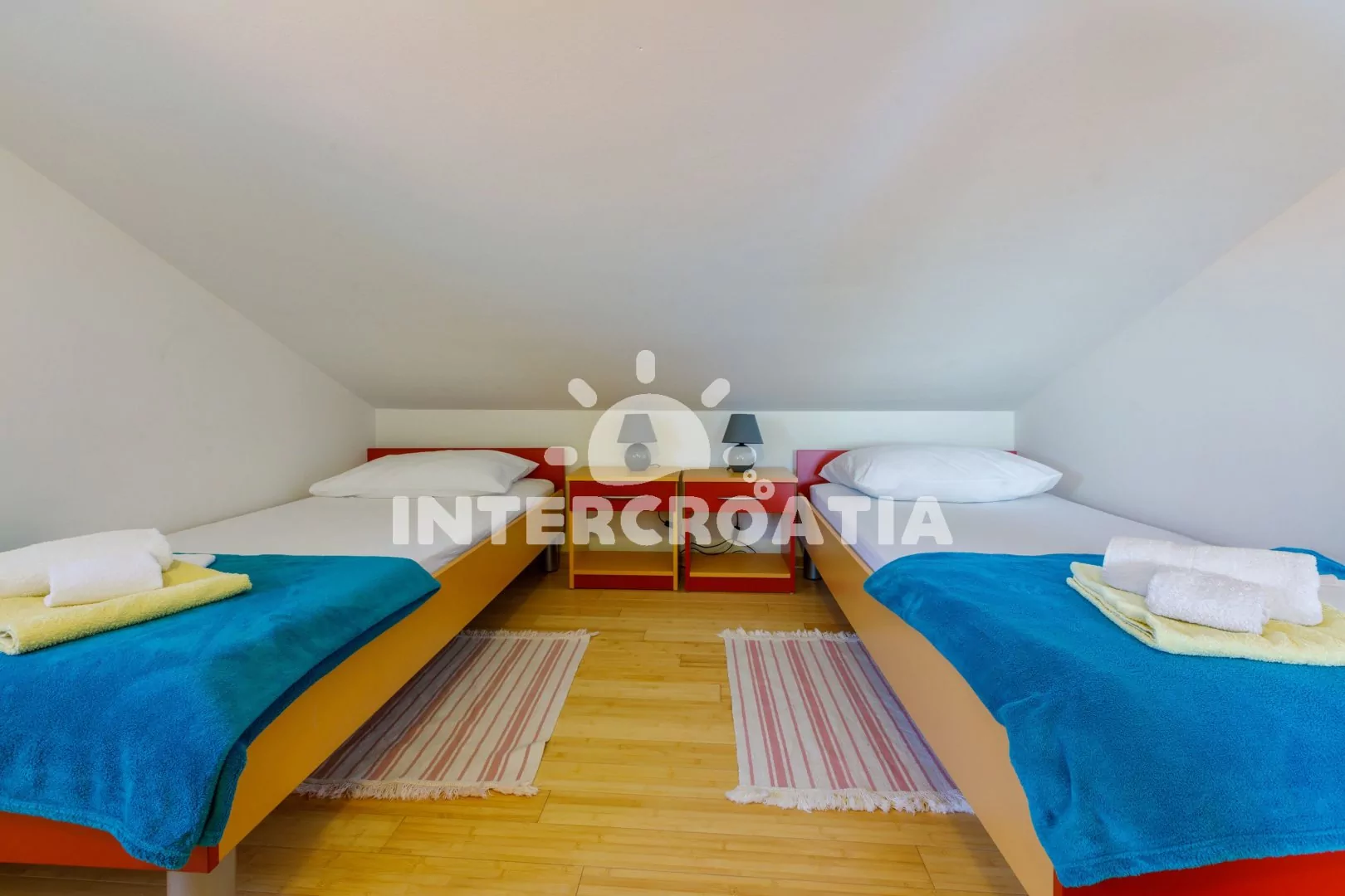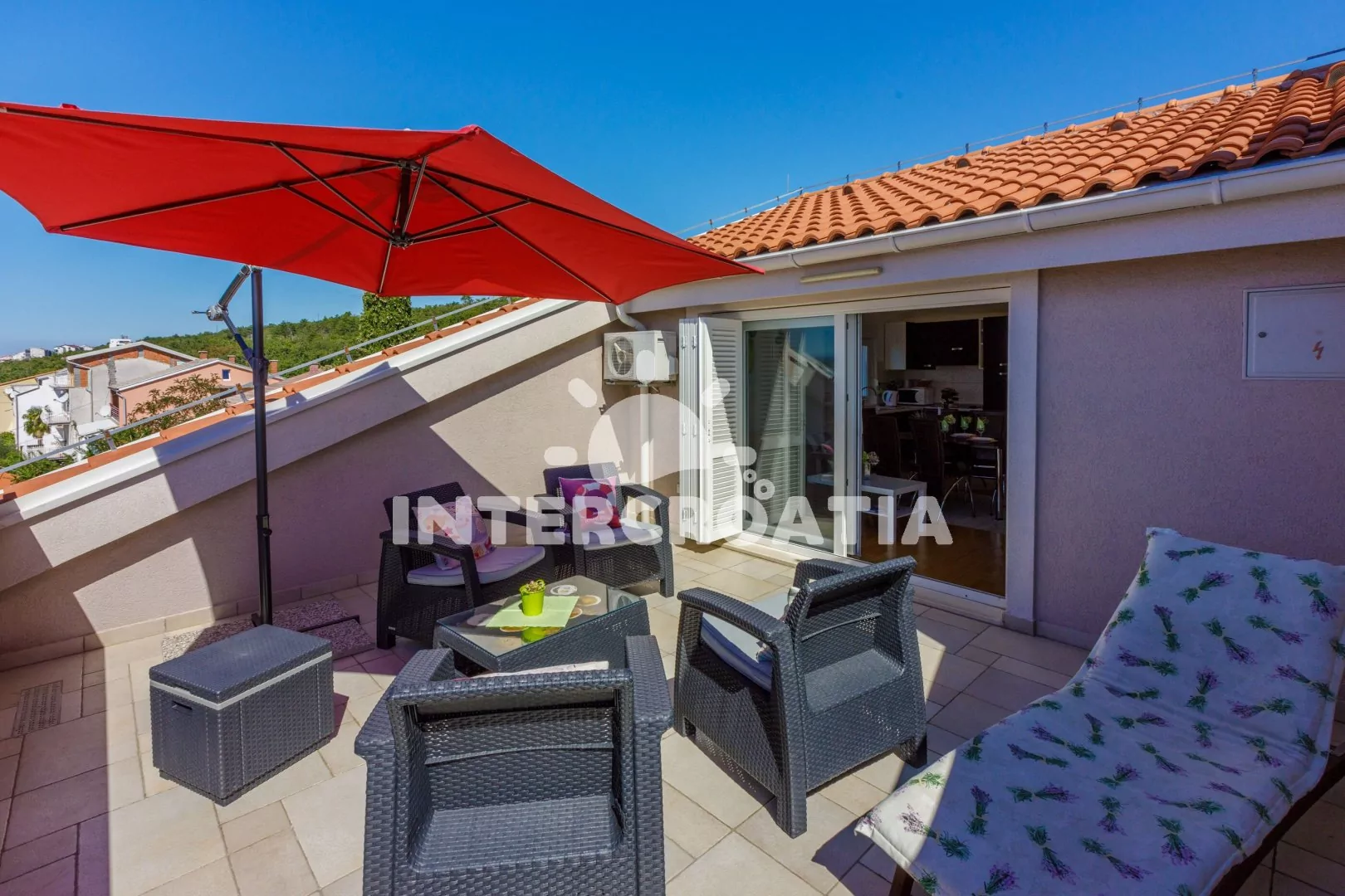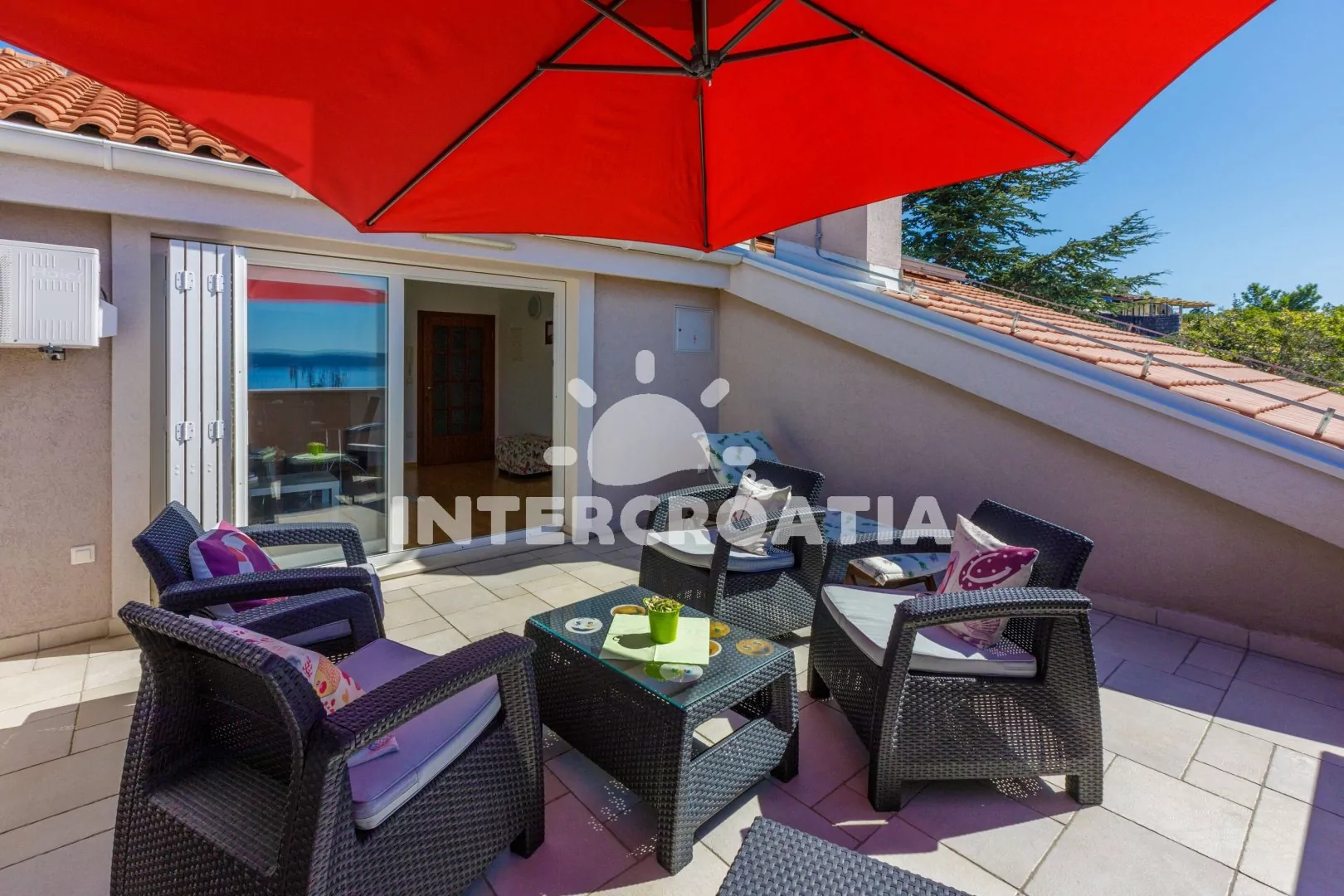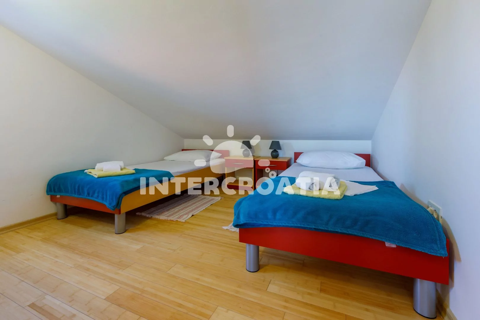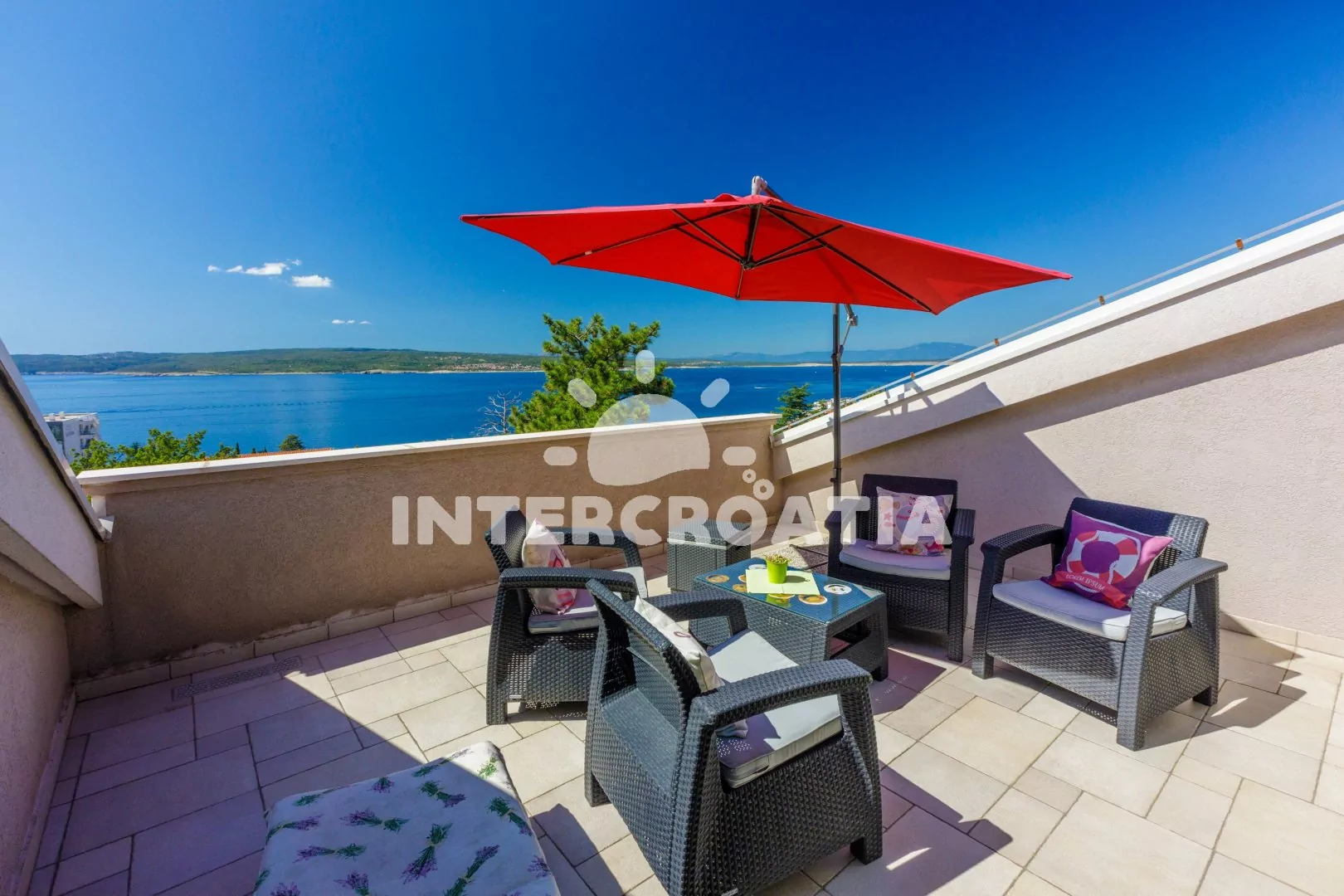 Podkrovní apartmán (83 m2) s vlastní terasou a výhledem na moře je vhodný pro 6 osob. Obývací pokoj je spojený s kuchyní. Kuchyňská linka je vybavena sklokeramickou varnou deskou, kávovarem, nádobím a lednicí s mrazákem. Obývací pokoj s jídelním stolem pro 6 osob, pohovkou, televizí se satelitním programem, radiem, klimatizací a vstupem na terasu. První ložnice s dvoulůžkem. Druhá ložnice s dvoulůžkem. Třetí ložnice s dvěma jednolůžky. Koupelna se sprchovým koutem, umyvadlem a wc. Hostům je k dispozici parkování u objektu zdarma.