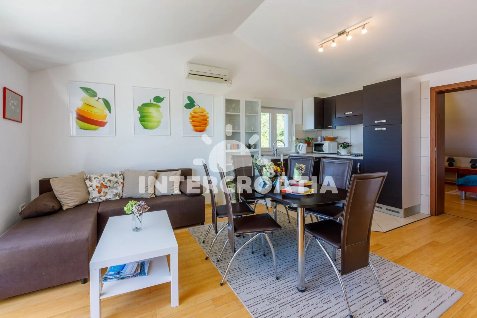 Podkrovní apartmán (83 m2) s vlastní terasou a výhledem na moře je vhodný pro 6 osob. Obývací pokoj je spojený s kuchyní. Kuchyňská linka je vybavena sklokeramickou varnou deskou, kávovarem, nádobím…