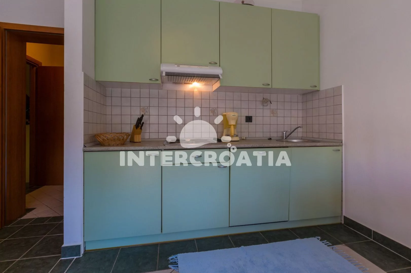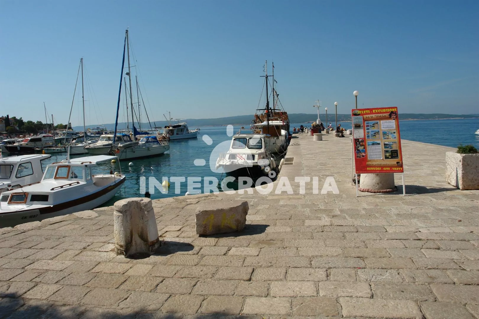 Vzdálenosti: Moře a kamenitá-betonová pláž 150 m, písečná-oblázková 400 m, centrum, supermarket, restaurace 15 m, lékárna, směnárna, pošta 20 m, ambulance 350 m, potápění 450 m, čerpací stanice 1,5 km, diskotéka 3 km, letiště 40 km.