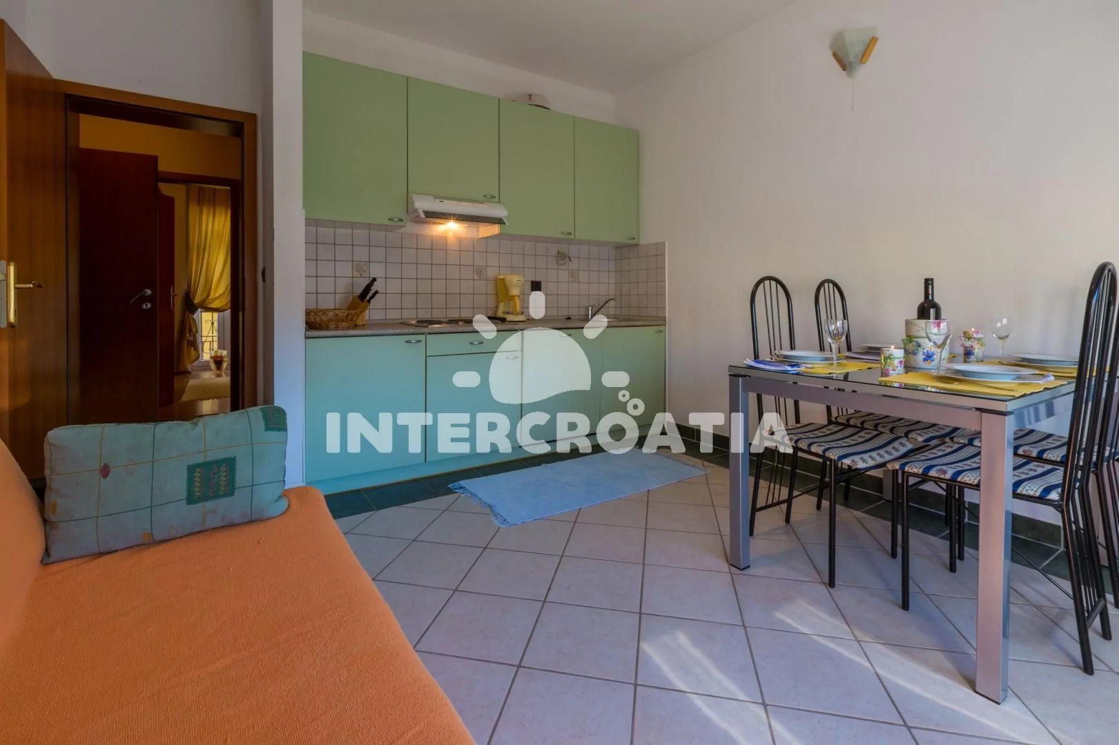 Apartmán (38 m2) se nachází v 1. patře vily a je vhodný pro 2 až 3 osoby. Obývací pokoj je spojený s kuchyní. Kuchyňská linka je vybavena varnou deskou, myčkou na nádobí, rychlovarnou konvicí,…