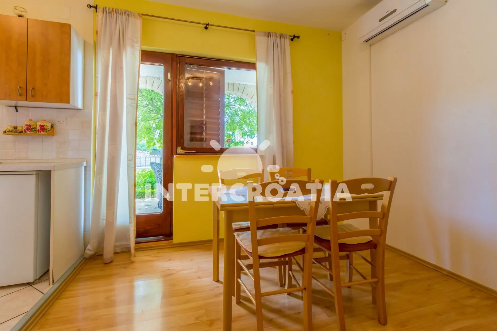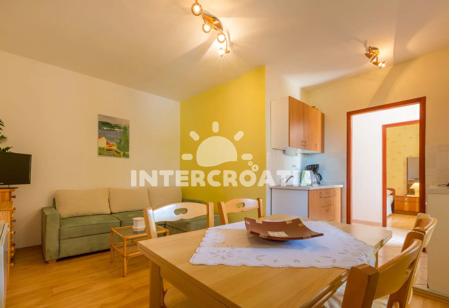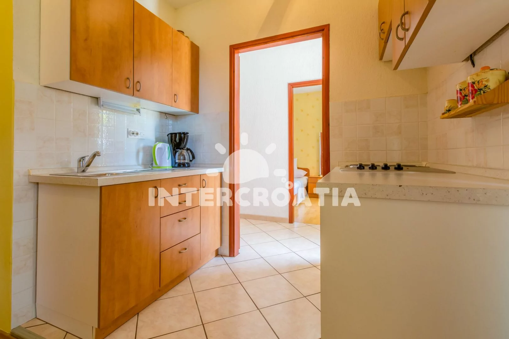 Apartmán (36 m2) se nachází přízemí domu a je vhodný pro 2 až 4 osoby. Obývací pokoj je spojený s kuchyní. Kuchyňská linka je vybavena varnou deskou, troubou, kávovarem, rychlovarnou konvicí, nádobím a lednicí s mrazákem. Obývací pokoj s jídelním stolem pro 4 osoby, rohovou pohovkou (rozložitelná na extra lůžko pro 2 osoby), televizí se satelitním programem, klimatizací a vstupem na terasu. Ložnice s jedním dvoulůžkem. Koupelna se sprchovým koutem, umyvadlem, pračkou, fénem a wc. Hostům je k dispozici parkování u objektu zdarma.