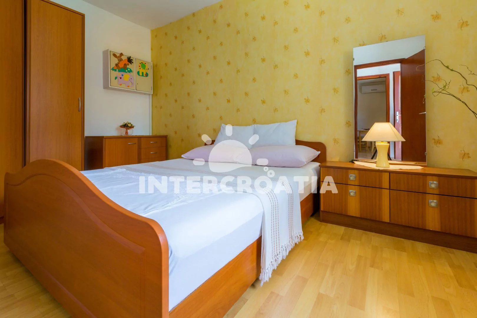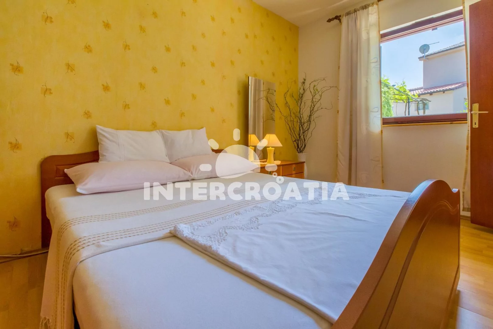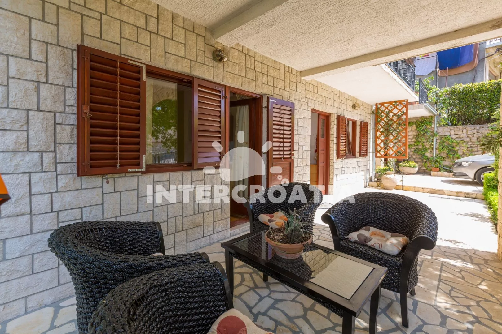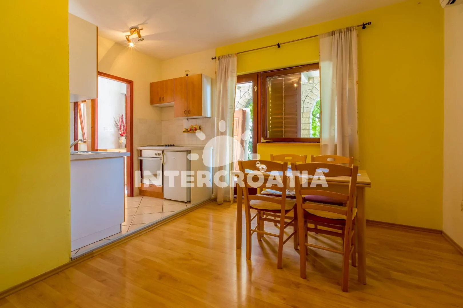 Apartmán (36 m2) se nachází přízemí domu a je vhodný pro 2 až 4 osoby. Obývací pokoj je spojený s kuchyní. Kuchyňská linka je vybavena varnou deskou, troubou, kávovarem, rychlovarnou konvicí, nádobím a lednicí s mrazákem. Obývací pokoj s jídelním stolem pro 4 osoby, rohovou pohovkou (rozložitelná na extra lůžko pro 2 osoby), televizí se satelitním programem, klimatizací a vstupem na terasu. Ložnice s jedním dvoulůžkem. Koupelna se sprchovým koutem, umyvadlem, pračkou, fénem a wc. Hostům je k dispozici parkování u objektu zdarma.