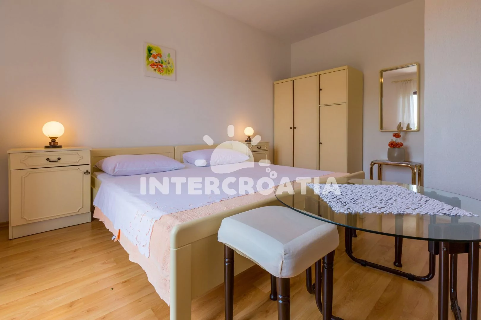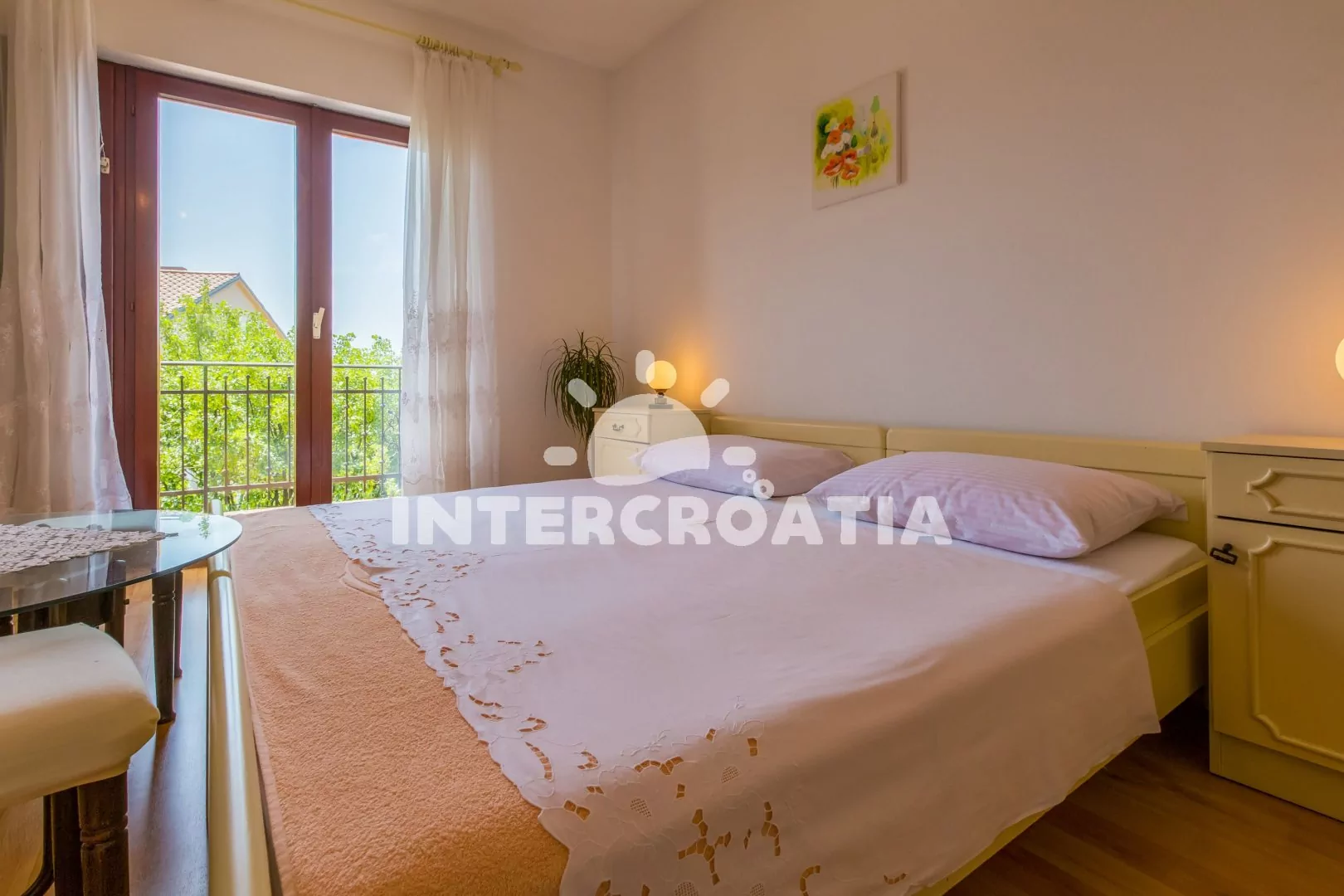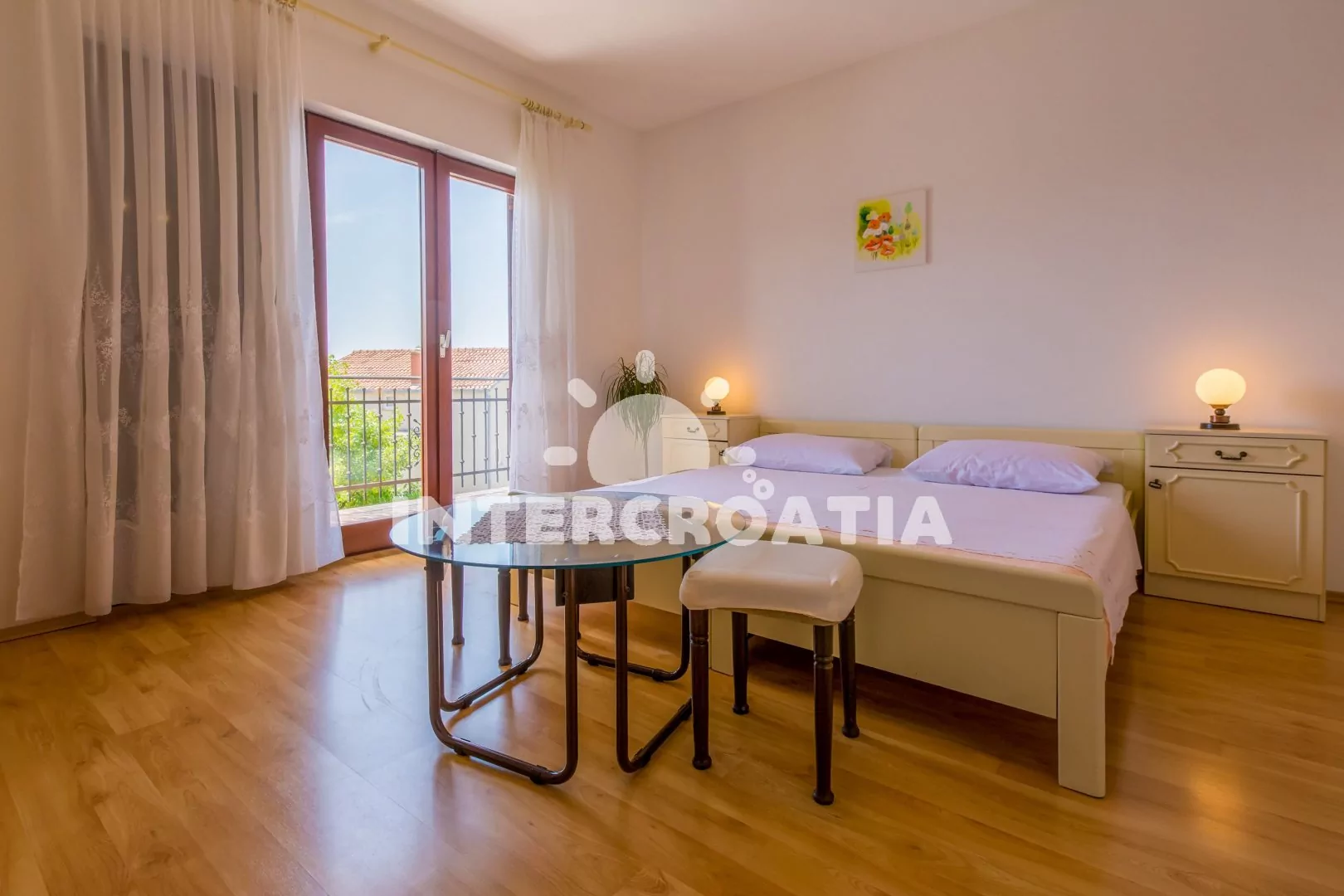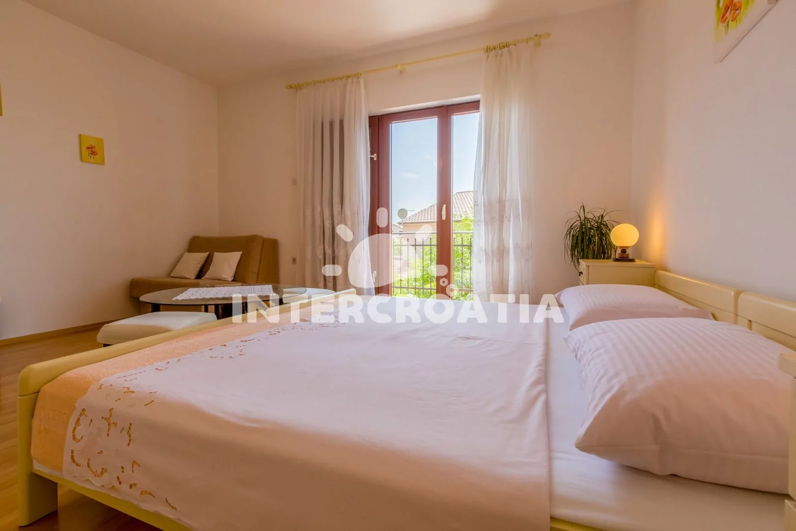 Apartmán (60 m2) s balkonem se nachází v 2. patře domu a je vhodný pro 4 až 6 osob. Obývací pokoj je spojený s kuchyní. Kuchyňská linka je vybavena varnou deskou, troubou, kávovarem, mikrovlnnou troubou, rychlovarnou konvicí, nádobím a lednicí s mrazákem. Obývací pokoj s jídelním stolem pro 6 osob, přistýlkou (rozložitelná na extra lůžko pro 1 osobu), televizí se satelitním programem a klimatizací. Ložnice s dvoulůžkem, přistýlkou (rozložitelná na extra lůžko pro 1 osobu) a vstupem na balkon. Druhá ložnice s dvěma jednolůžky. Koupelna se sprchovým koutem, umyvadlem a wc. Hostům je k dispozici parkování u objektu zdarma.