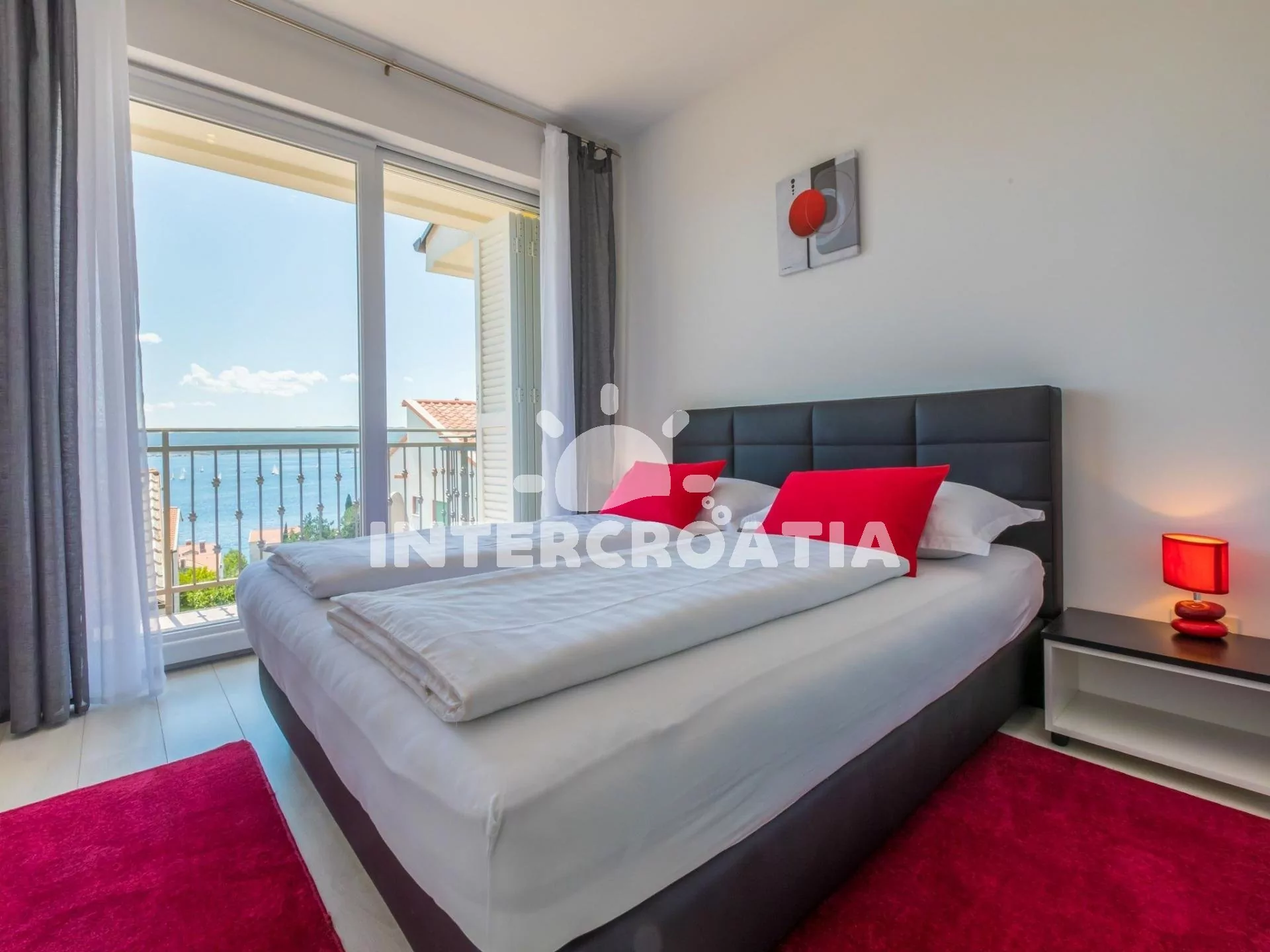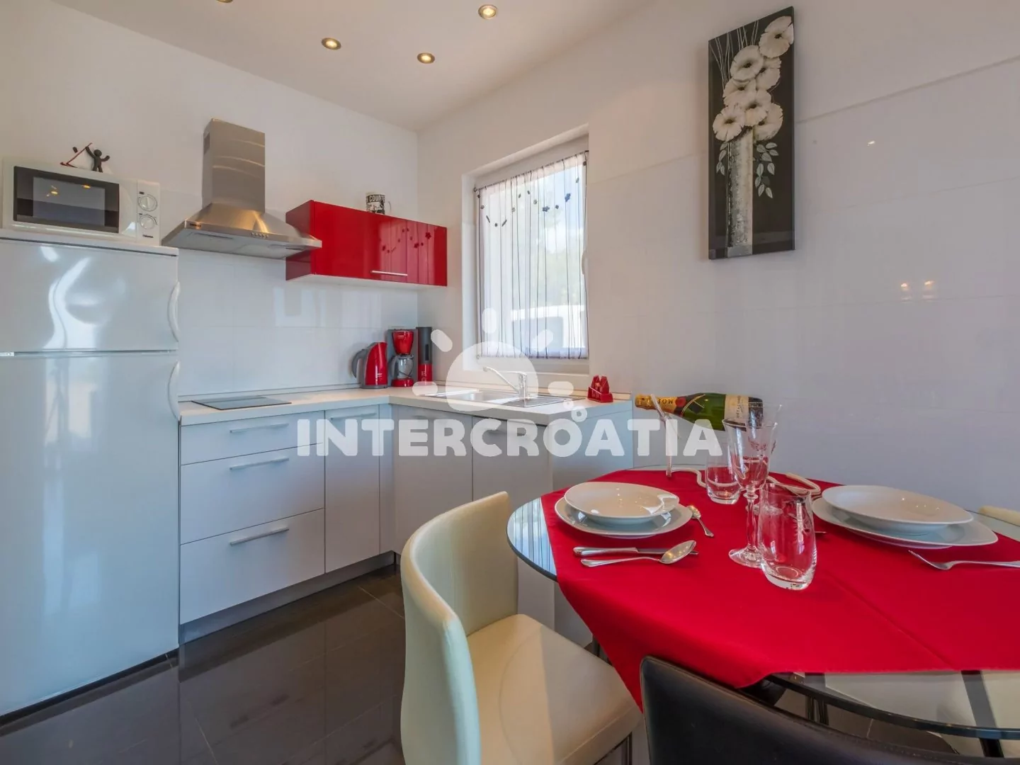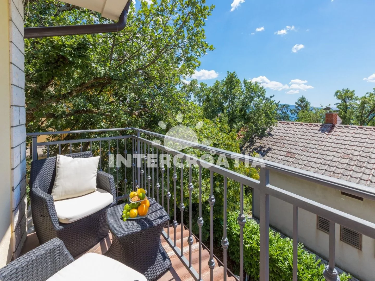 Apartmán (50 m2) s balkonem a výhledem na moře se nachází v 1. patře vily a je vhodný pro až 4 osoby. Obývací pokoj je spojený s kuchyní. Kuchyňská linka je vybavena sklokeramickou varnou deskou, digestoří, mikrovlnnou troubou, myčkou na nádobí, rychlovarnou konvicí, kávovarem, toustovačem, nádobím a lednicí s mrazákem. Obývací pokoj s jídelním stolem pro 4 osoby, rohovou pohovkou (rozložitelná na extra lůžko pro 2 osoby), televizí se satelitním programem, klimatizací a vstupem na balkon. Ložnice s jedním dvoulůžkem a vstupem na balkon. Koupelna se sprchovým koutem, umyvadlem, bidetem, pračkou a wc. Hostům je k dispozici parkování u objektu zdarma.