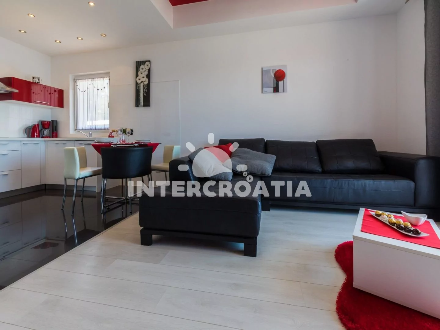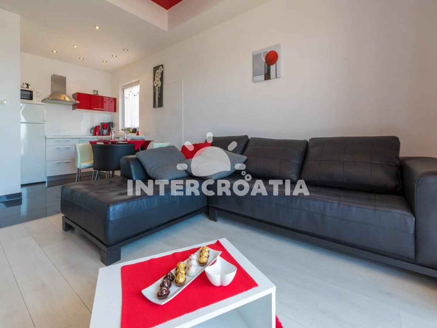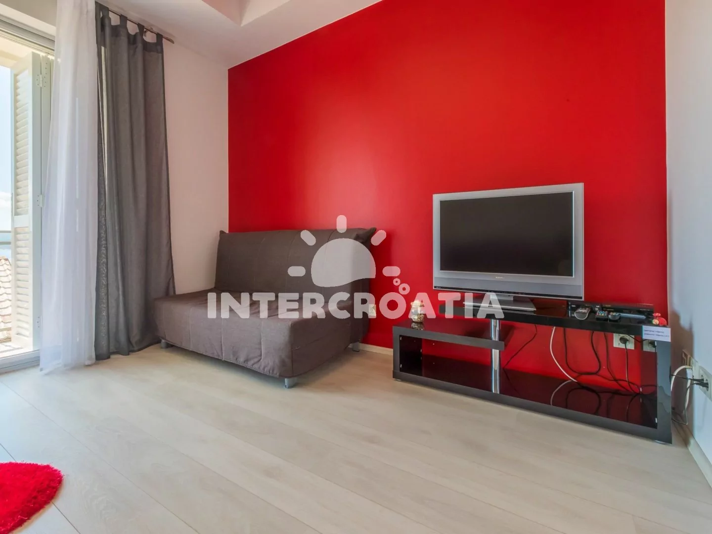 Apartmán (50 m2) s balkonem a výhledem na moře se nachází v 1. patře vily a je vhodný pro až 4 osoby. Obývací pokoj je spojený s kuchyní. Kuchyňská linka je vybavena sklokeramickou varnou deskou, digestoří, mikrovlnnou troubou, myčkou na nádobí, rychlovarnou konvicí, kávovarem, toustovačem, nádobím a lednicí s mrazákem. Obývací pokoj s jídelním stolem pro 4 osoby, rohovou pohovkou (rozložitelná na extra lůžko pro 2 osoby), televizí se satelitním programem, klimatizací a vstupem na balkon. Ložnice s jedním dvoulůžkem a vstupem na balkon. Koupelna se sprchovým koutem, umyvadlem, bidetem, pračkou a wc. Hostům je k dispozici parkování u objektu zdarma.
