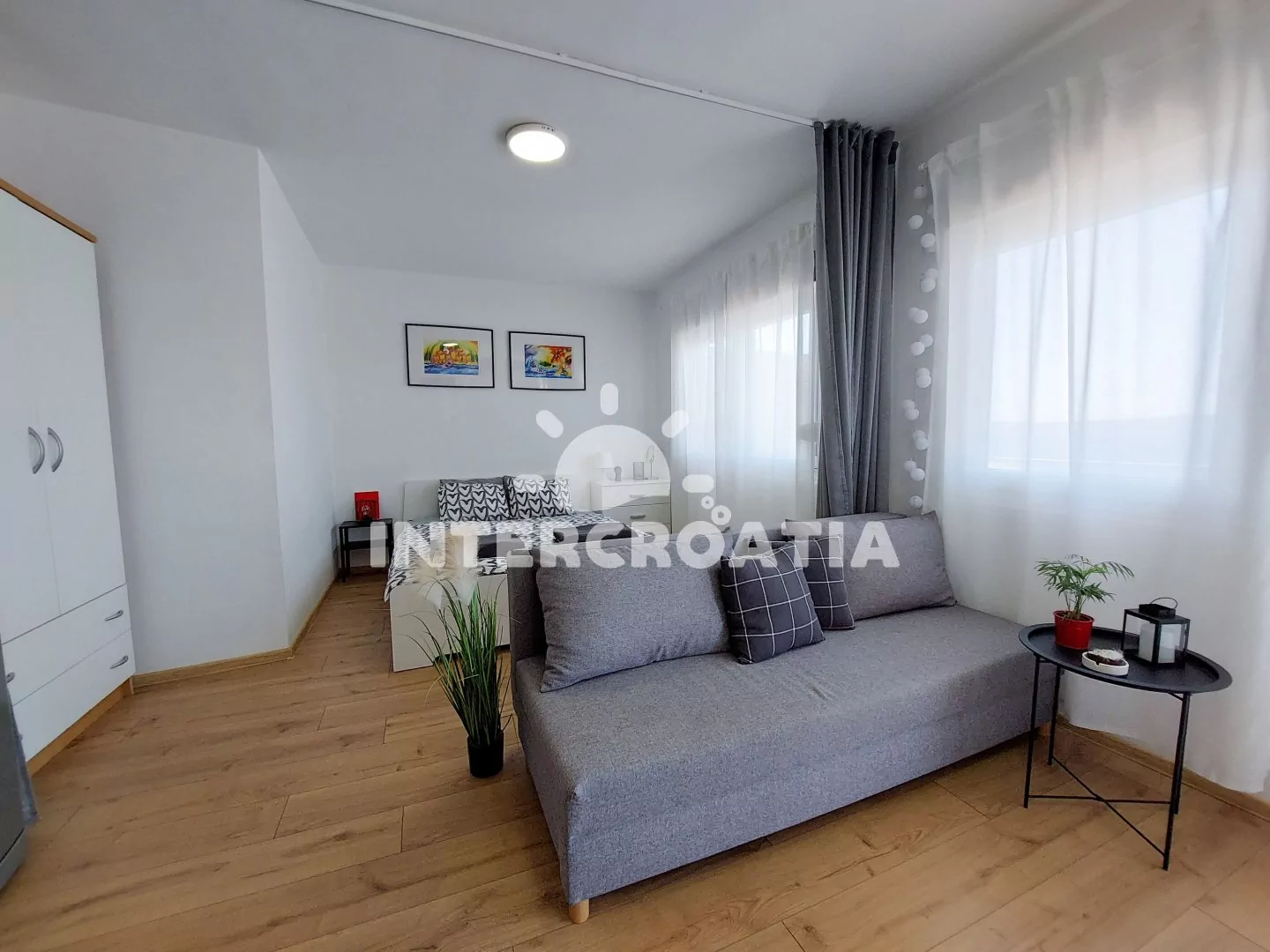 Apartmán typu studio (32 m2) s balkonem, posezením a výhledem na moře se nachází ve 2. patře domu. Obývací místnost je spojena s kuchyní. Kuchyňská linka je vybavena dvouplotýnkovým vařičem, vestavěnou troubou, rychlovarnou konvicí, nádobím a lednicí s mrazákem. Obývací místnost s pohovkou (rozložitelná na extra lůžko pro 1 osobu), televizí, rádiem, klimatizací, jedním dvoulůžkem a vstupem na balkon. Koupelna se sprchovým koutem, umyvadlem, fénem a wc. Hostům je k dispozici parkování u objektu zdarma.