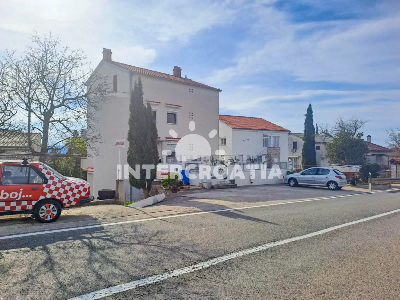 Vzdálenosti: Moře 600 m, pláž 600 m (betonové desky), pláž Poli Mora 700 m (písečná-oblázková), centrum 800 m, bar 50 m, restaurace 500 m, supermarket 900 m, ambulance 600 m, lékárna a směnárna 800 m, pošta, potápění a přístav 900 m, veřejná doprava 300 m, diskotéka, půjčovna cyklistických kol a mini golf 1 km, banka, čerpací stanice a muzeum 3 km, tenisové kurty 1,5 km, park Plitvice 50 km, trajekt (Lopar) 70 km, letiště (Rijeka) 23 km.