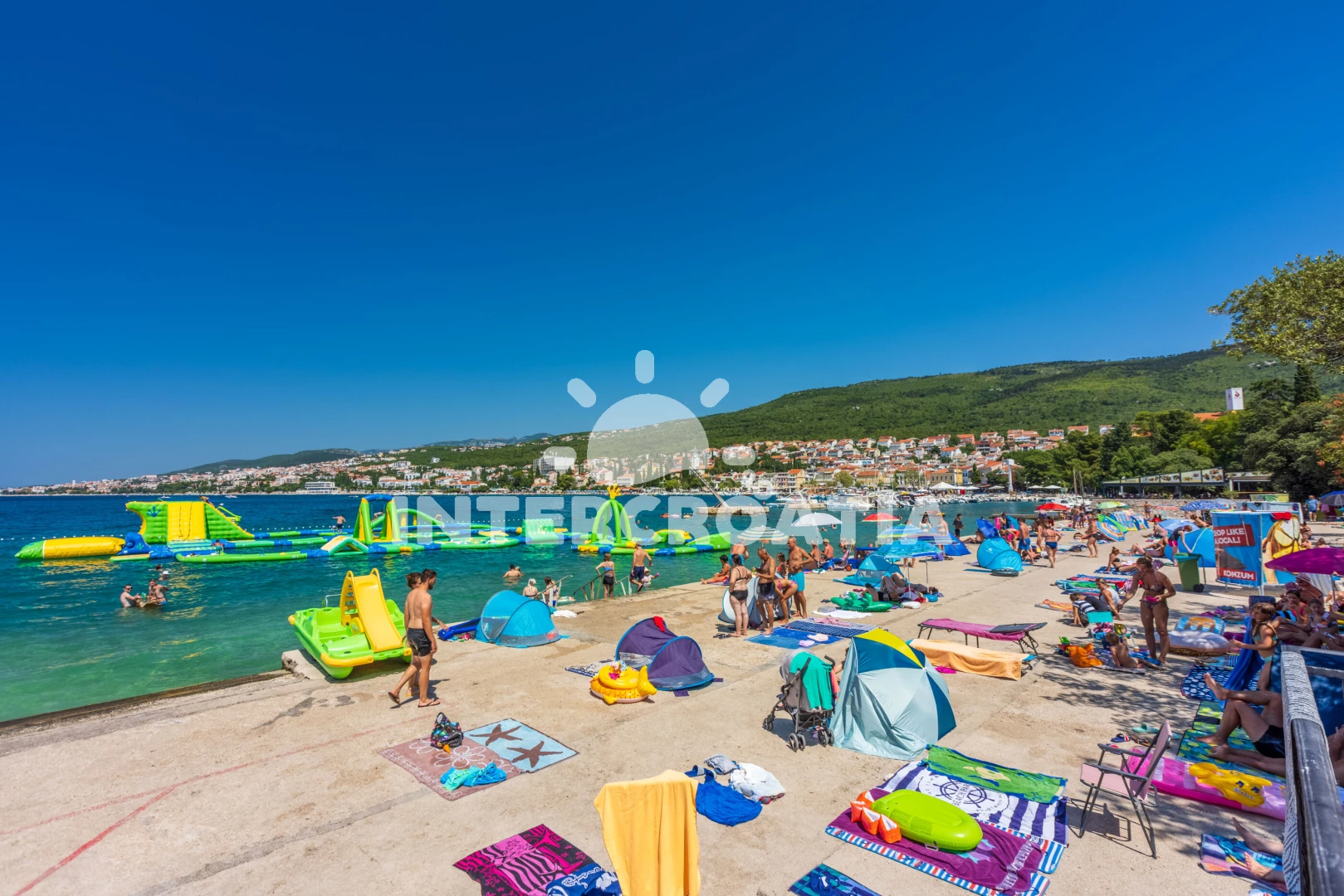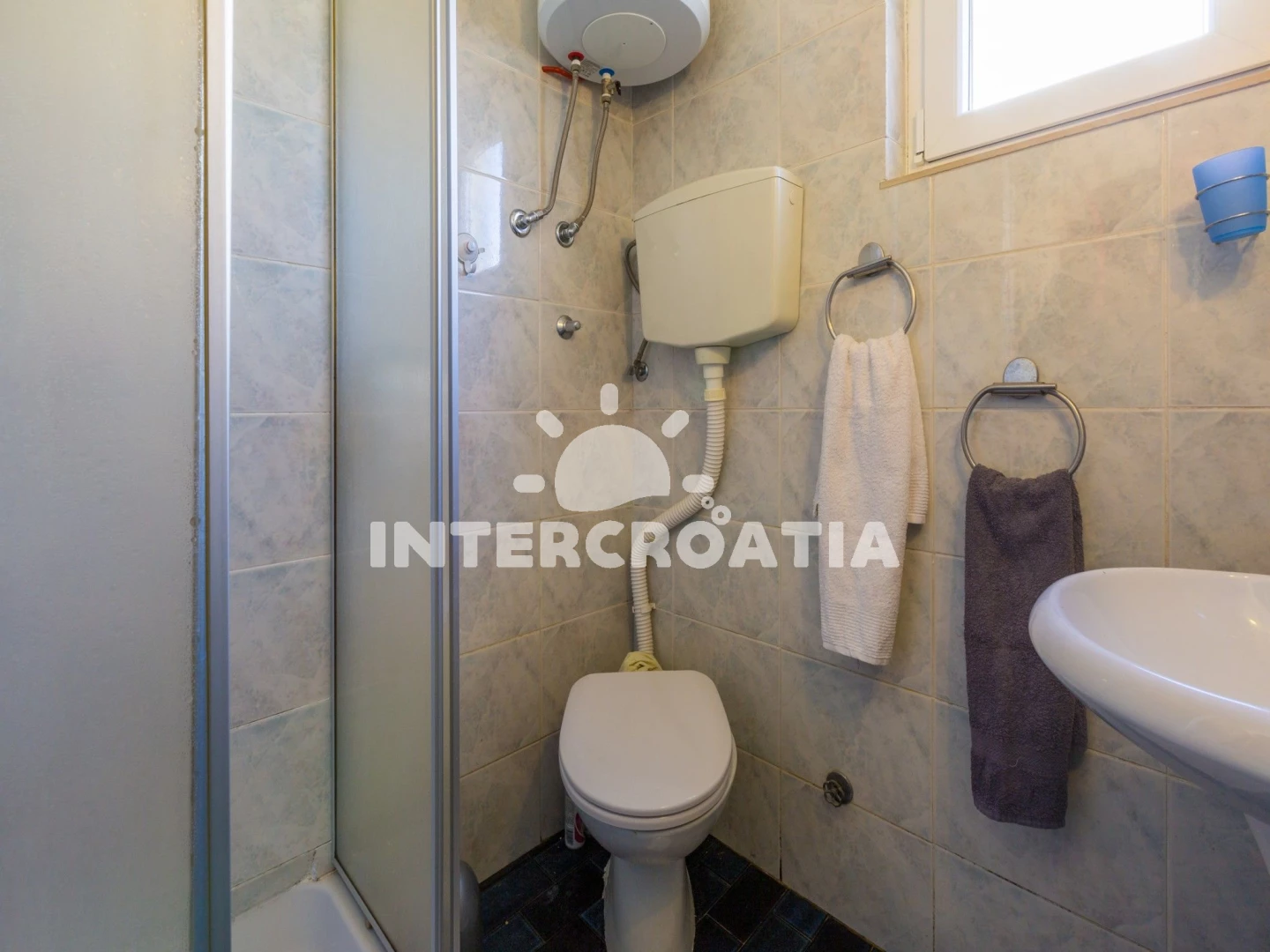 Apartmán se nachází 200 m od moře a pláže. Pláž je skalnatá, oblázková, větší kamení a betonové desky.