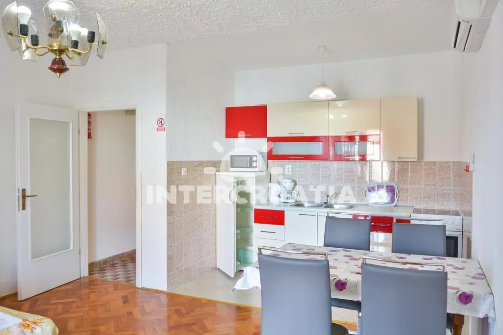 Apartmán v přízemí domu s výhledem do zahrady pro 2 až 4 osoby. Kuchyň spojena s obývacím pokojem. Kuchyňský kout je vybaven nádobím, sporákem, troubou, lednicí s mrazákem a jídelním stolem. Obývací část s pohovkou (extra lůžko pro 2 osoby). Ložnice s jedním manželským dvoulůžkem. Koupelna se sprchovým koutem, umyvadlem a wc. K dispozici: WiFi, klimatizace, fén a žehlička (služba na požádání), terasa s posezením.