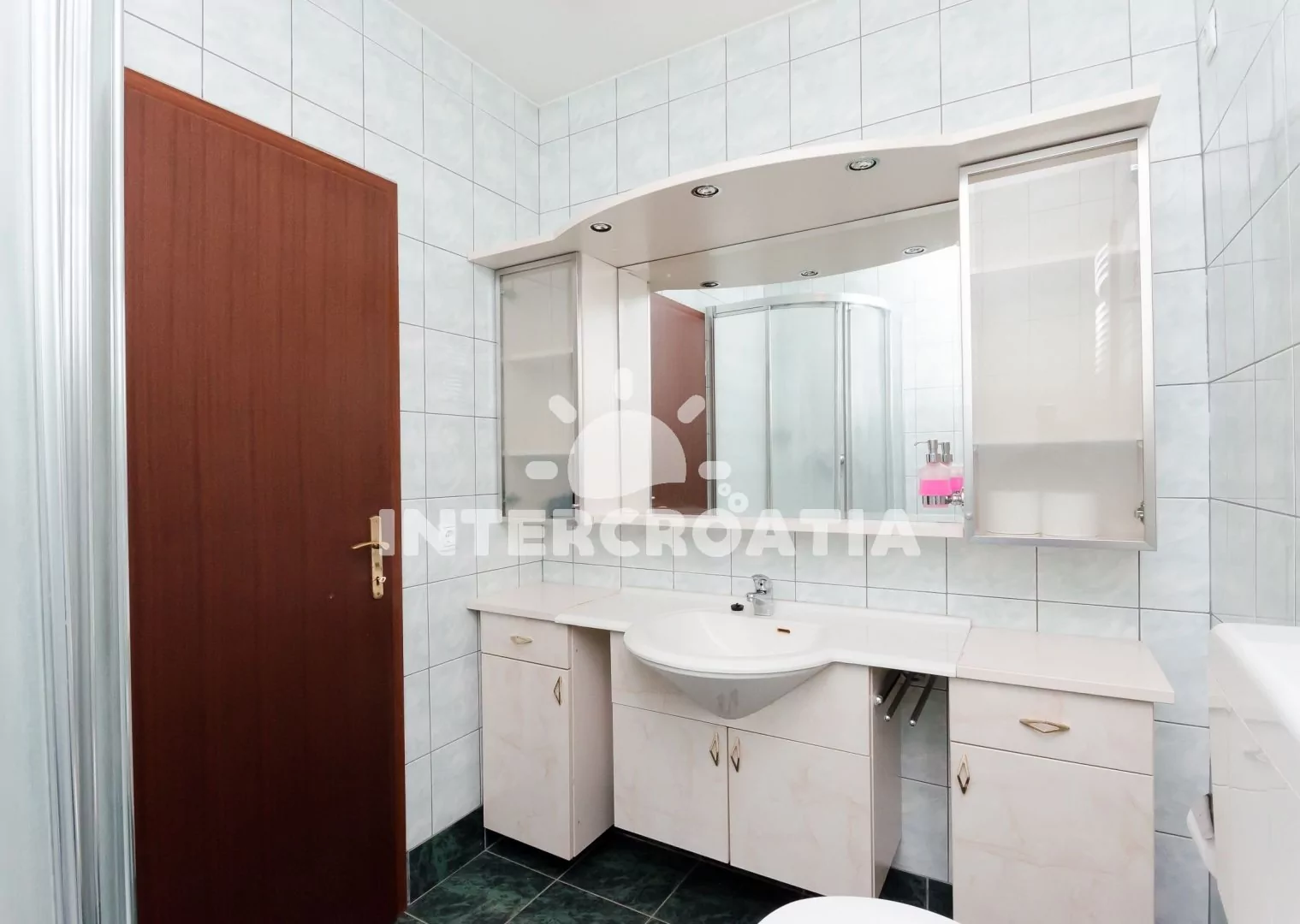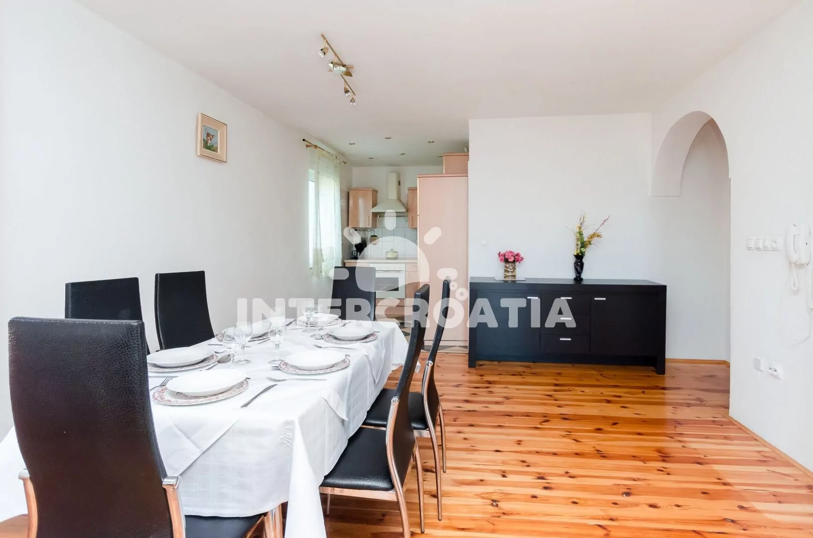 Velký apartmán (150 m2) s balkonem se nachází v 1. patře domu a je vhodný pro 4 až 6 osob. Obývací pokoj je spojený s kuchyní. Kuchyňská linka se sklokeramickou varnou deskou, digestoří, troubou, myčkou na nádobí, mikrovlnnou troubou, kávovarem, nádobím a lednicí s mrazákem. Obývací pokoj s jídelním stolem pro 6 osob, rohovou pohovkou (rozložitelná na extra lůžko pro 2 osoby), televizí se satelitním programem a vstupem na balkon. První i druhá ložnice je vybavena vždy s jedním dvoulůžkem a vstupem na balkon. Všechny pokoje jsou klimatizované. První koupelna se sprchovým koutem, pračkou, umyvadlem a wc. Druhá koupelna s vanou, umyvadlem a wc. Hostům je k dispozici parkování u objektu zdarma.