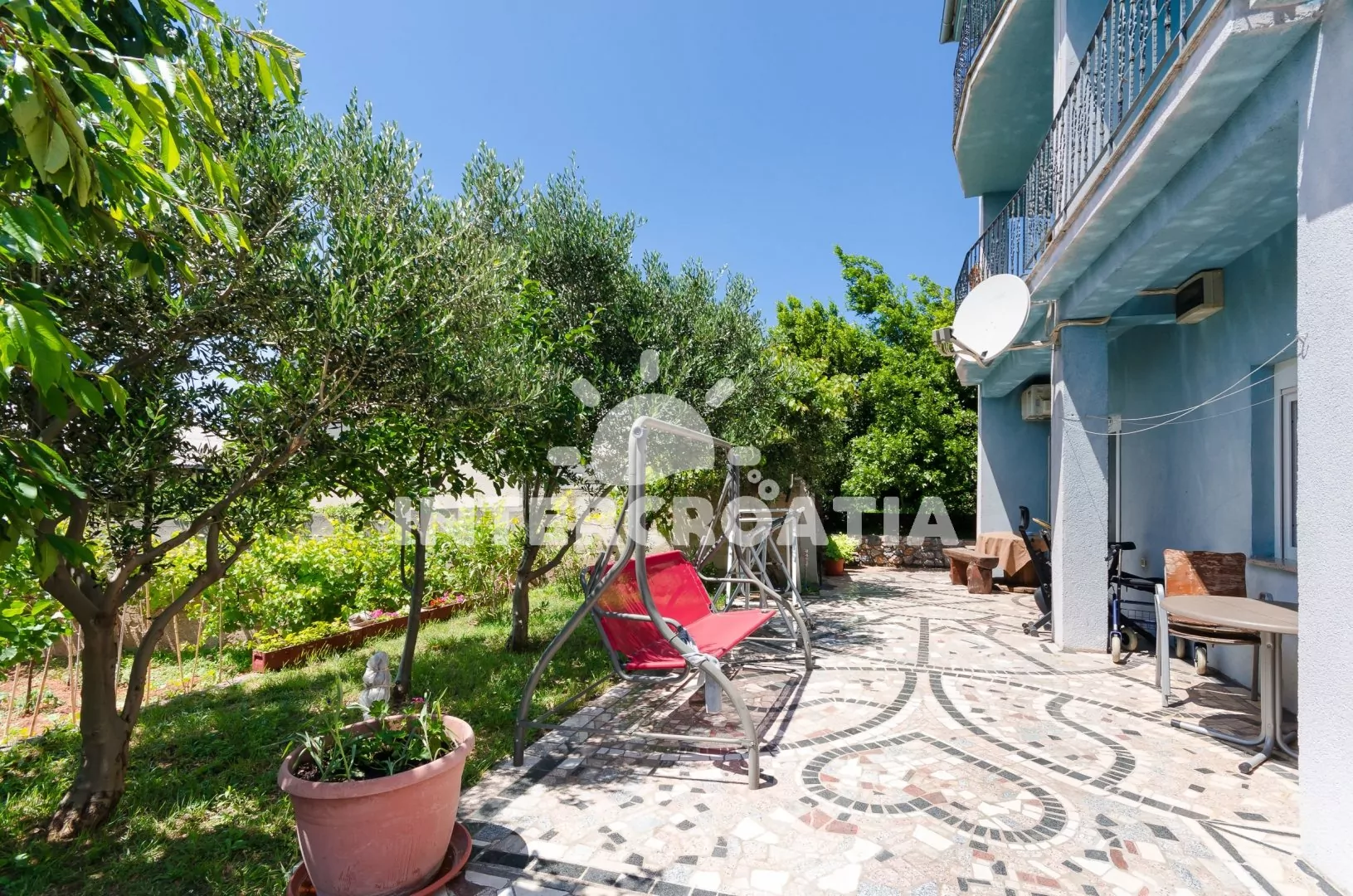 Vzdálenosti: Moře a pláž 480 m, oblázková pláž 750 m, centrum, supermarket, přístav, půjčovna motorových člunů 300 m, restaurace, bar 100 m, veřejná doprava, lékárna, směnárna, muzeum, banka, pošta, diskotéka 200 m, ambulance 10 m, čerpací stanice 250 m, potápění 8 km,venkovní a vnitřní bazén, tenis, minigolf 30 km, trajekt 40 km, letiště 50 km.