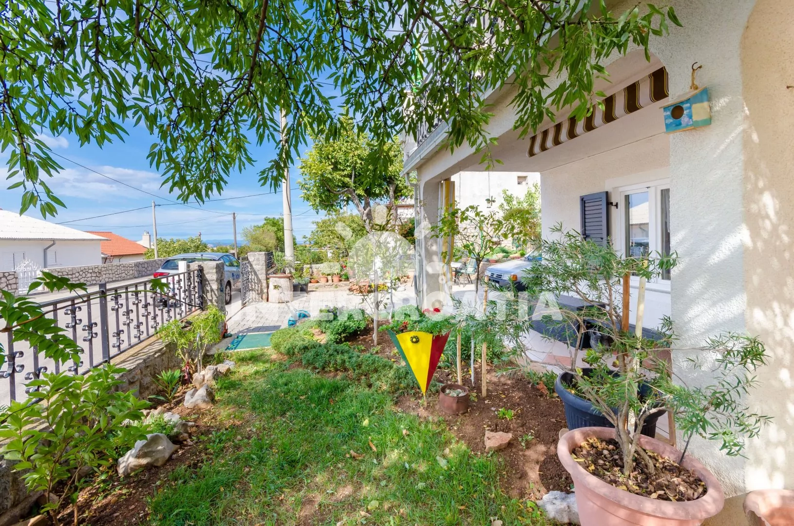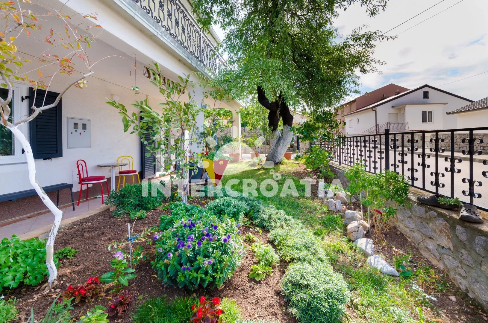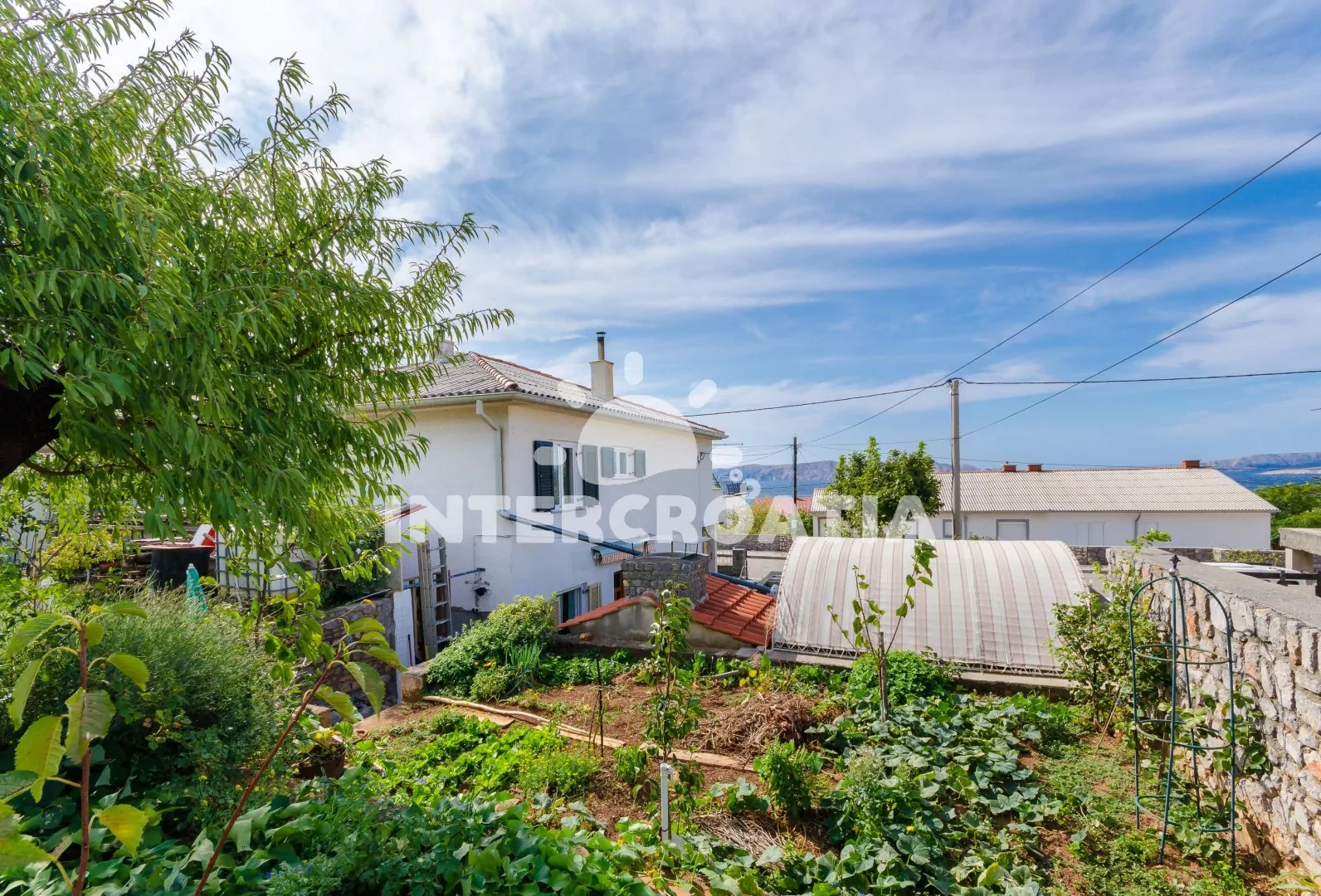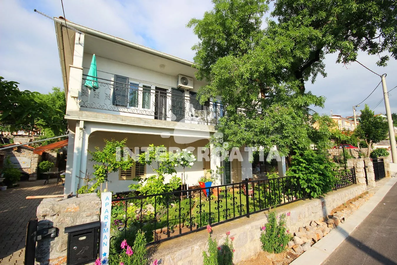Dvoupodlažní dům v klidné ulici a s výhledem na moře. Kolem domu zahrada se zelení, terasou s venkovním posezením a zděným grilem. Parkovací místa u domu.