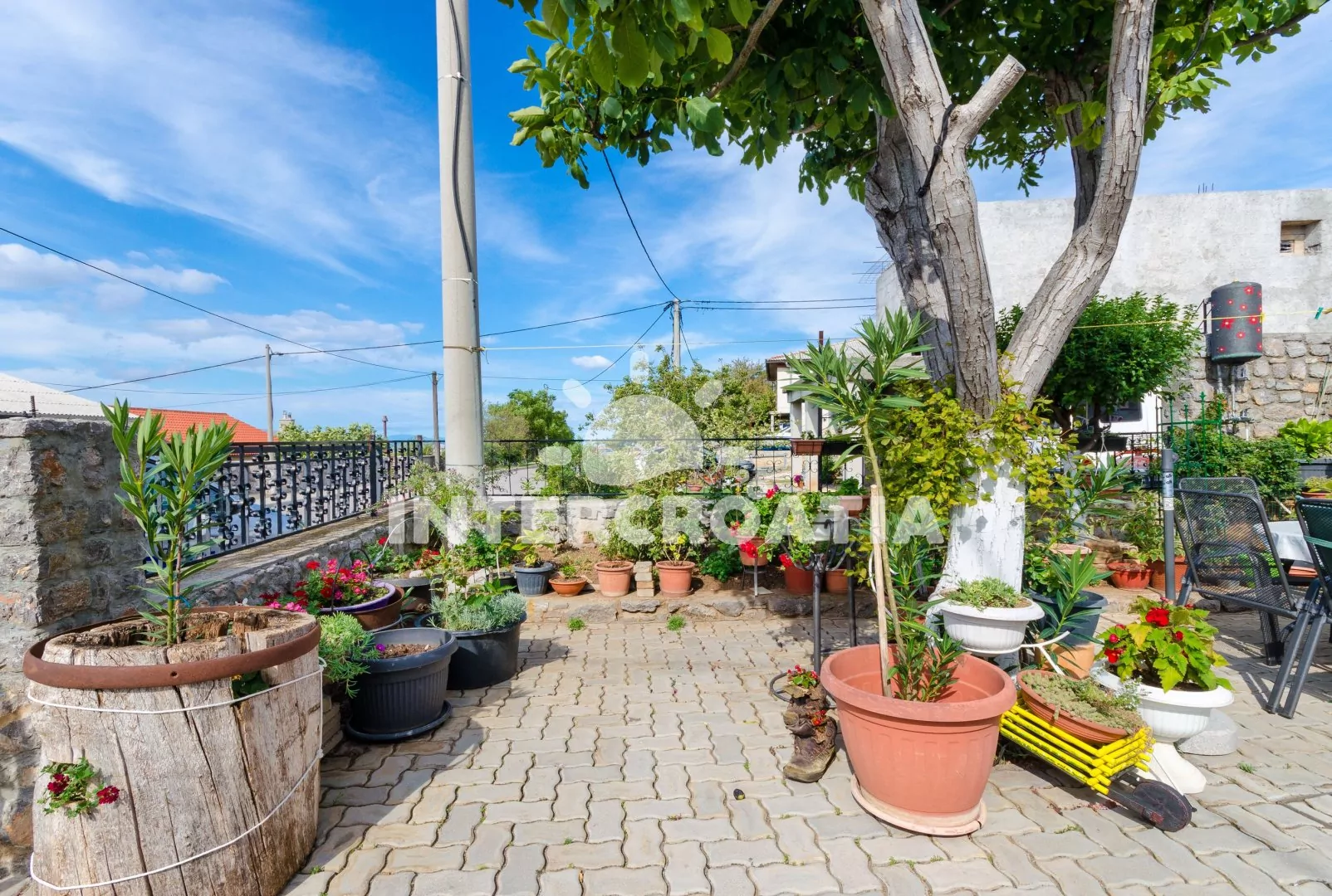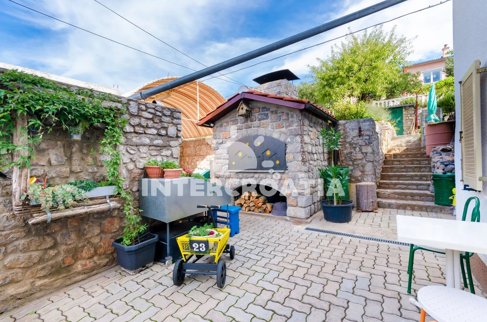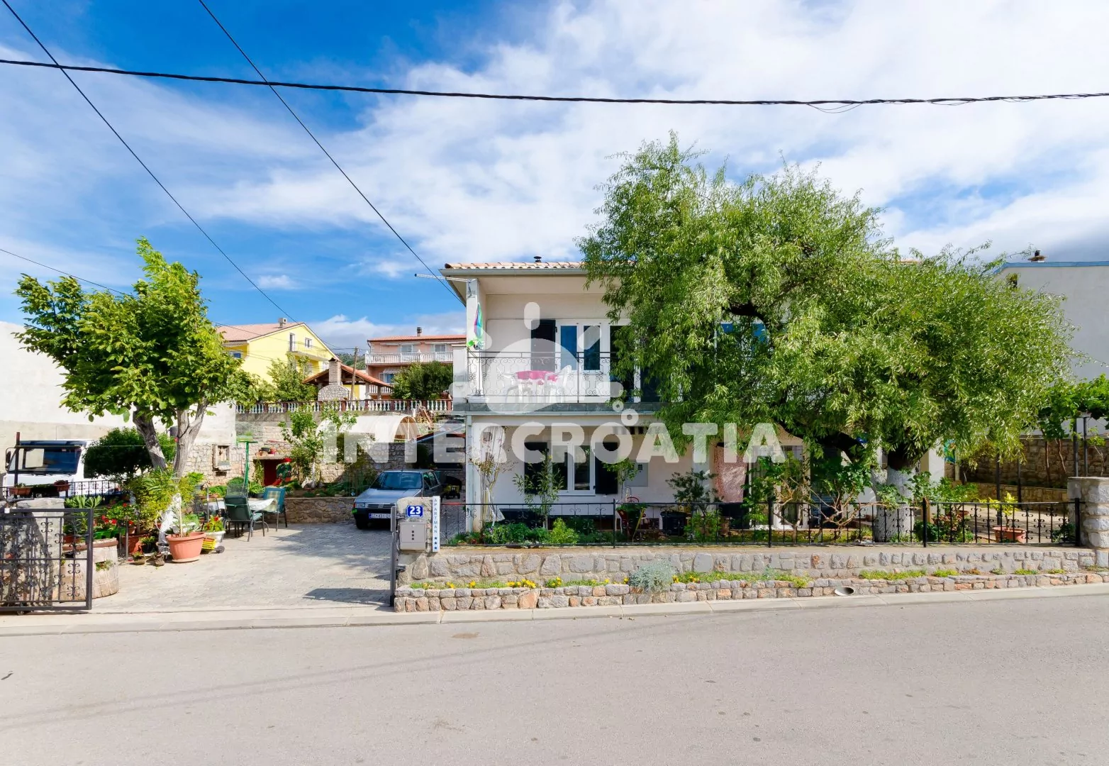 Dvoupodlažní dům v klidné ulici a s výhledem na moře. Kolem domu zahrada se zelení, terasou s venkovním posezením a zděným grilem. Parkovací místa u domu.