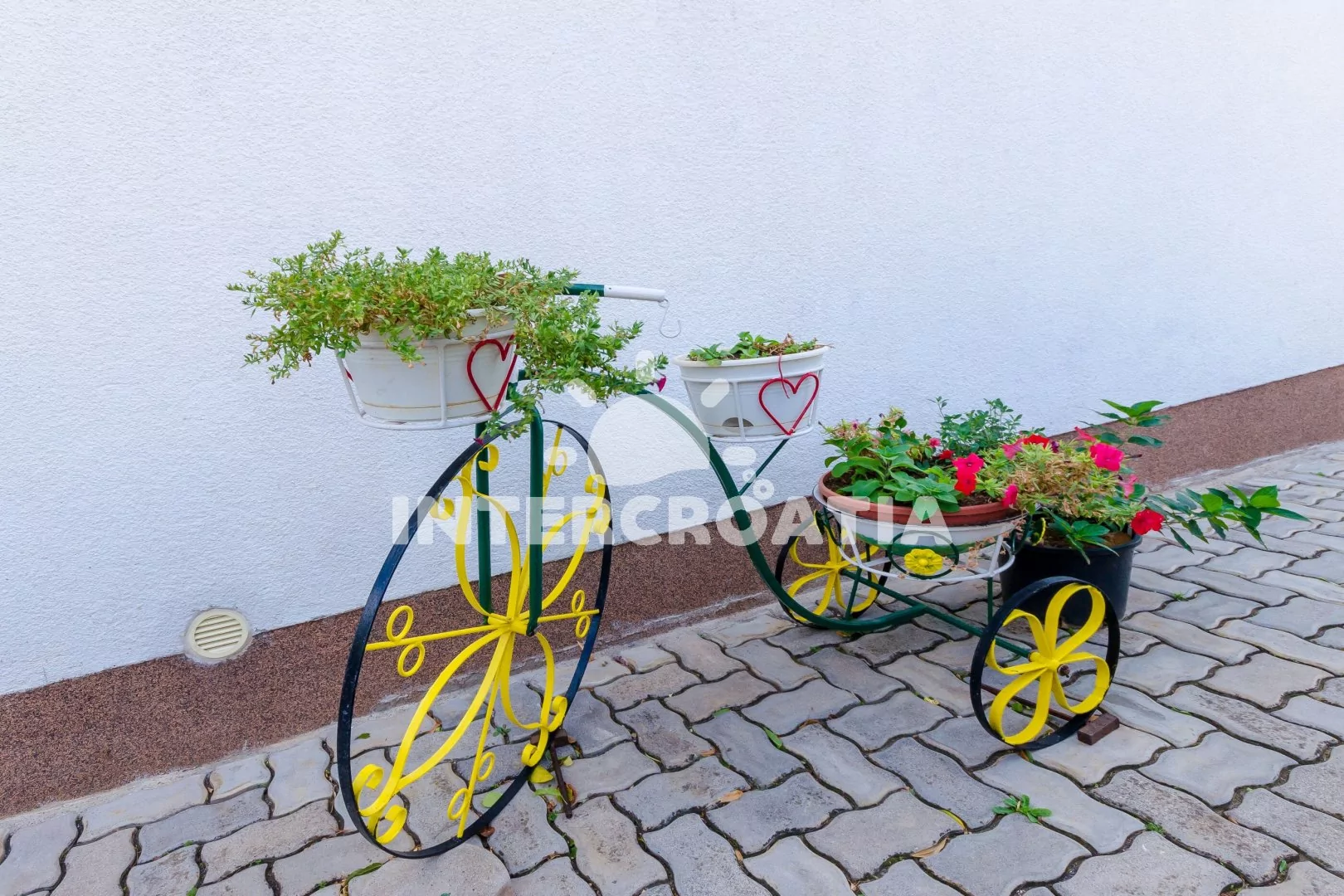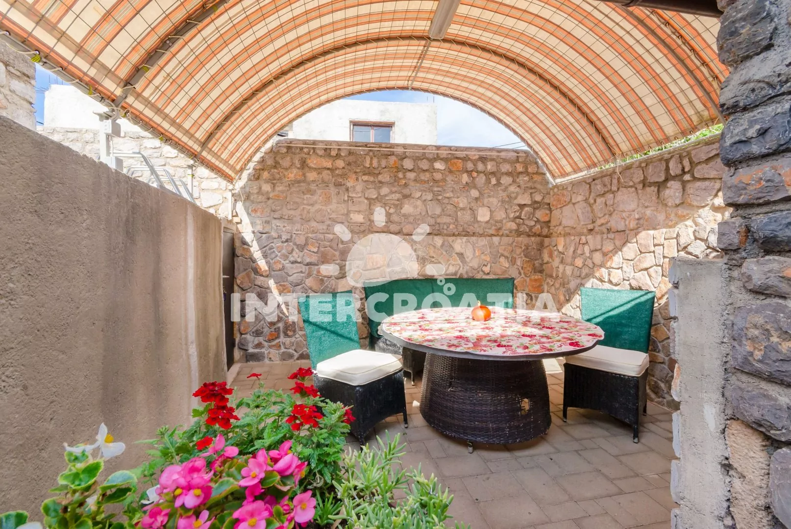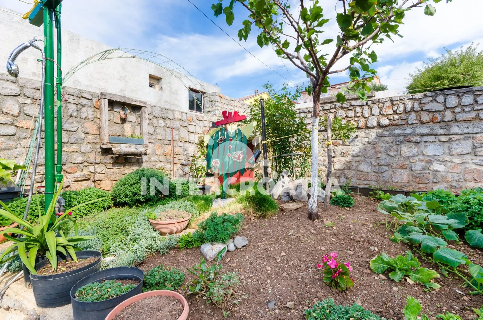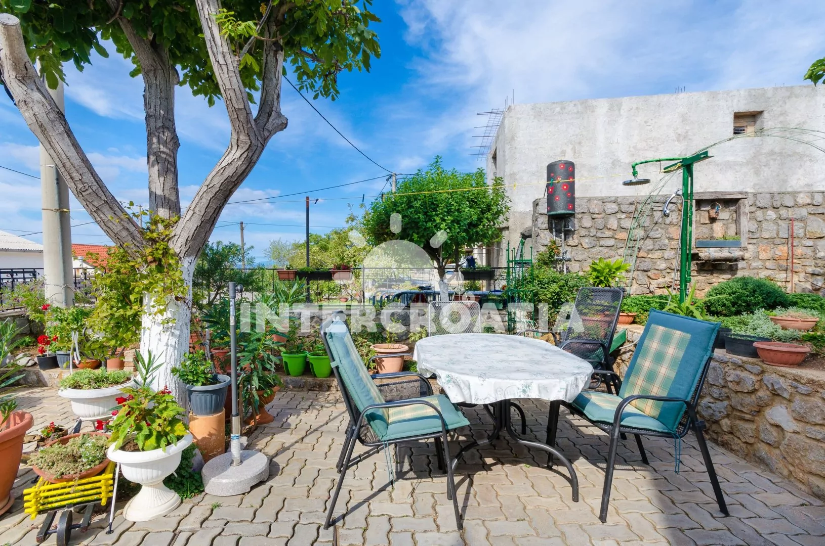 Dvoupodlažní dům v klidné ulici a s výhledem na moře. Kolem domu zahrada se zelení, terasou s venkovním posezením a zděným grilem. Parkovací místa u domu.