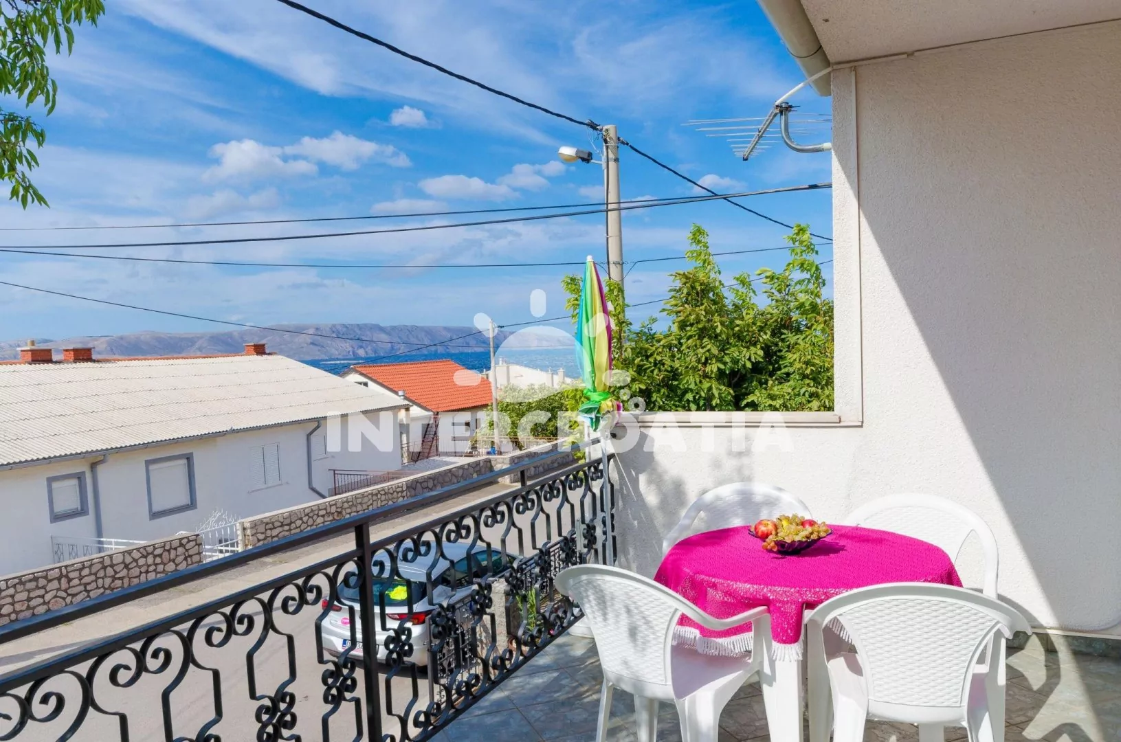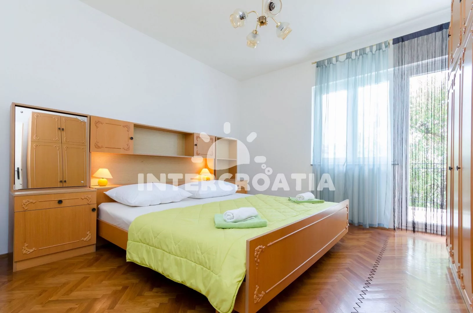 Apartmán (70 m2) s vlastním balkonem a výhledem na moře se nachází v prvním patře domu a je vhodný pro 4 až 5 osob. Obývací pokoj je spojený s kuchyní. Kuchyňská linka je vybavena sporákem, troubou, kávovarem, toustovačem, nádobím a lednicí s mrazákem. Obývací pokoj s jídelním stolem pro 4 osoby, pohovkou (rozložitelná na extra lůžko pro 1 osobu), televizí se satelitním programem, klimatizací a vstupem na balkon. První ložnice je vybavena jedním dvoulůžkem. Druhá ložnice s dvoulůžkem a vstupem na balkon. Koupelna s vanou, sprchou, umyvadlem, fénem a wc. Hostům je k dispozici parkování u objektu zdarma.