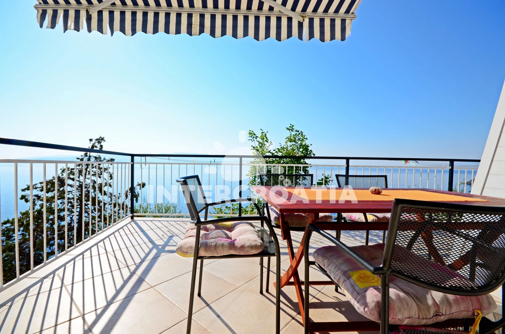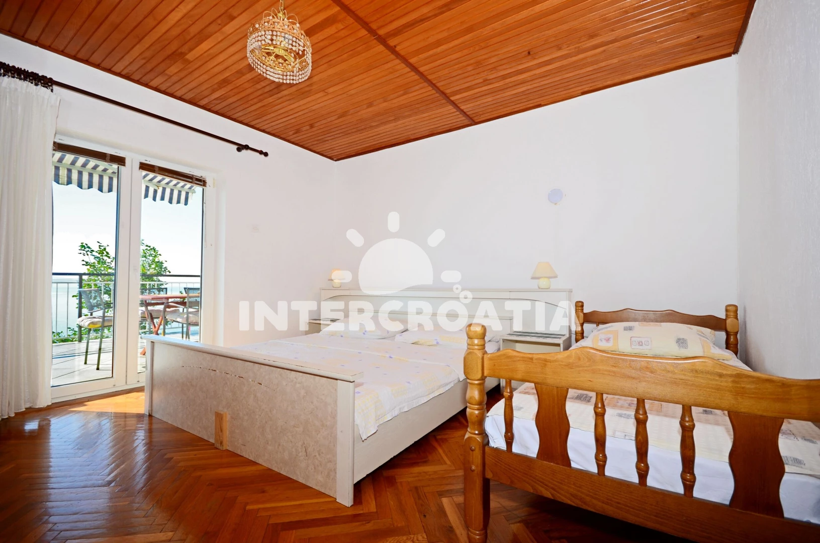 Apartmán (60 m2) se sdílenou terasou a výhledem na moře se nachází v 1. patře domu a je vhodný pro 3 až 5 osob. Obývací pokoj je spojený s kuchyní. Kuchyňská linka je vybavena sporákem s troubou, digestoří, myčkou na nádobí, mikrovlnnou troubou, kávovarem, toustovačem, rychlovarnou konvicí, nádobím a lednicí s mrazákem. Obývací pokoj s jídelním stolem pro 4 osoby, pohovkou (rozložitelná na extra lůžko pro 2 osoby), televizí se satelitním programem a klimatizací. Ložnice s dvoulůžkem, jedním jednolůžkem a vstupem na terasu. Koupelna s vanou, sprchovou zástěnou, umyvadlem, fénem a wc. Hostům je k dispozici parkování u objektu zdarma.