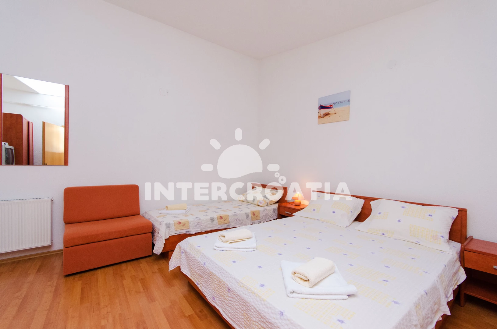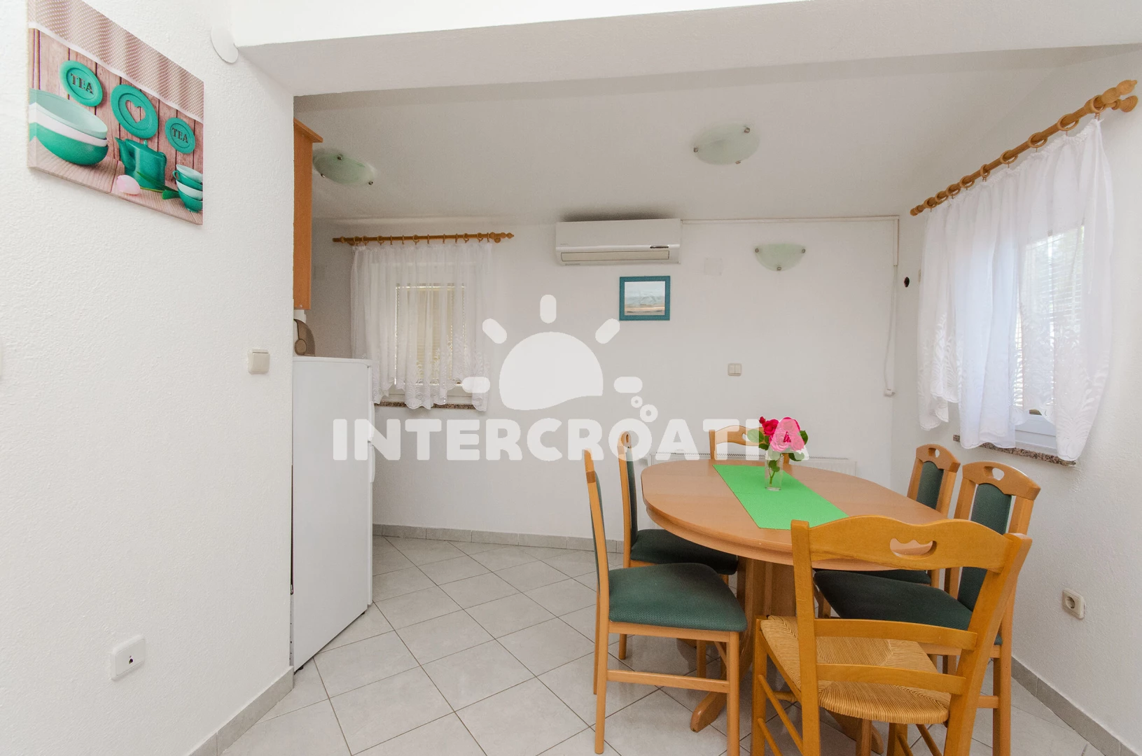 Apartmán (60 m2) se sdíleným balkonem a výhledem na moře se nachází v 2. patře domu a je vhodný pro 4 až 6 osob. Kuchyňská linka je vybavena sporákem s troubou, digestoří, mikrovlnnou troubou, kávovarem, toustovačem, rychlovarnou konvicí, nádobím a lednicí s mrazákem. Dále jídelní stůl pro 6 osob a klimatizace. První ložnice je vybavena dvoulůžkem, přistýlkou (rozložitelná pohovka), televizí se satelitním programem, klimatizací a vstupem na terasu. Druhá ložnice s dvoulůžkem a přistýlkou. Dvě koupelny se sprchovým koutem, umyvadlem, jedním fénem a wc. Hostům je k dispozici parkování u objektu zdarma.