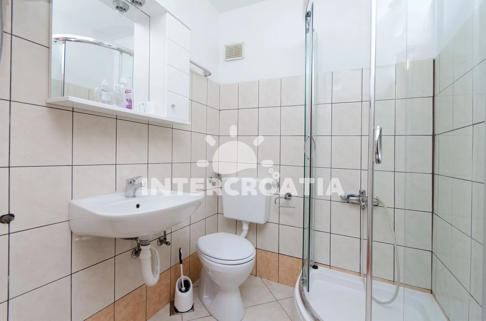Apartmán (60 m2) se sdílenou terasou a výhledem na moře se nachází v 1. patře domu a je vhodný pro 3 až 5 osob. Obývací pokoj je spojený s kuchyní. Kuchyňská linka je vybavena sporákem s troubou, digestoří, kávovarem, toustovačem, rychlovarnou konvicí, nádobím a lednicí s mrazákem. Obývací pokoj s jídelním stolem pro 6 osob, pohovkou (rozložitelná na extra lůžko pro 2 osoby) a televizí se satelitním programem. Ložnice s dvoulůžkem, jedním jednolůžkem a vstupem na terasu. Koupelna se sprchovým koutem, umyvadlem, fénem a wc. Hostům je k dispozici parkování u objektu zdarma.