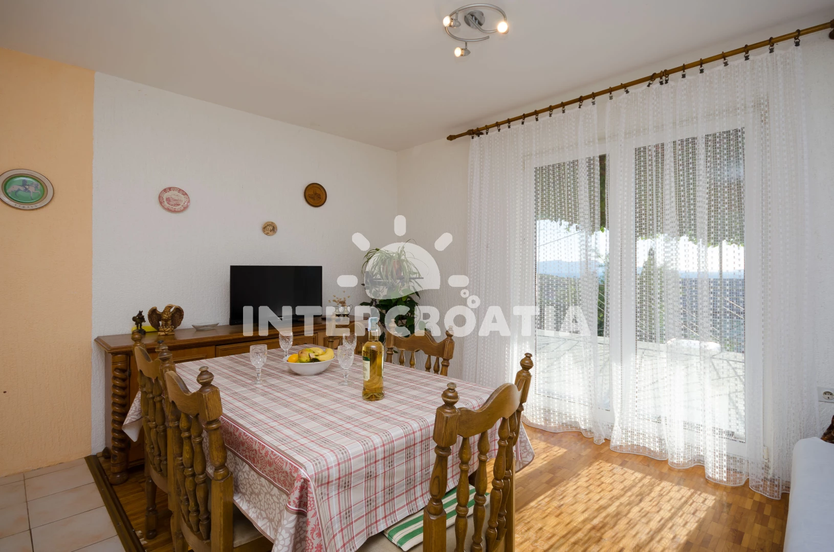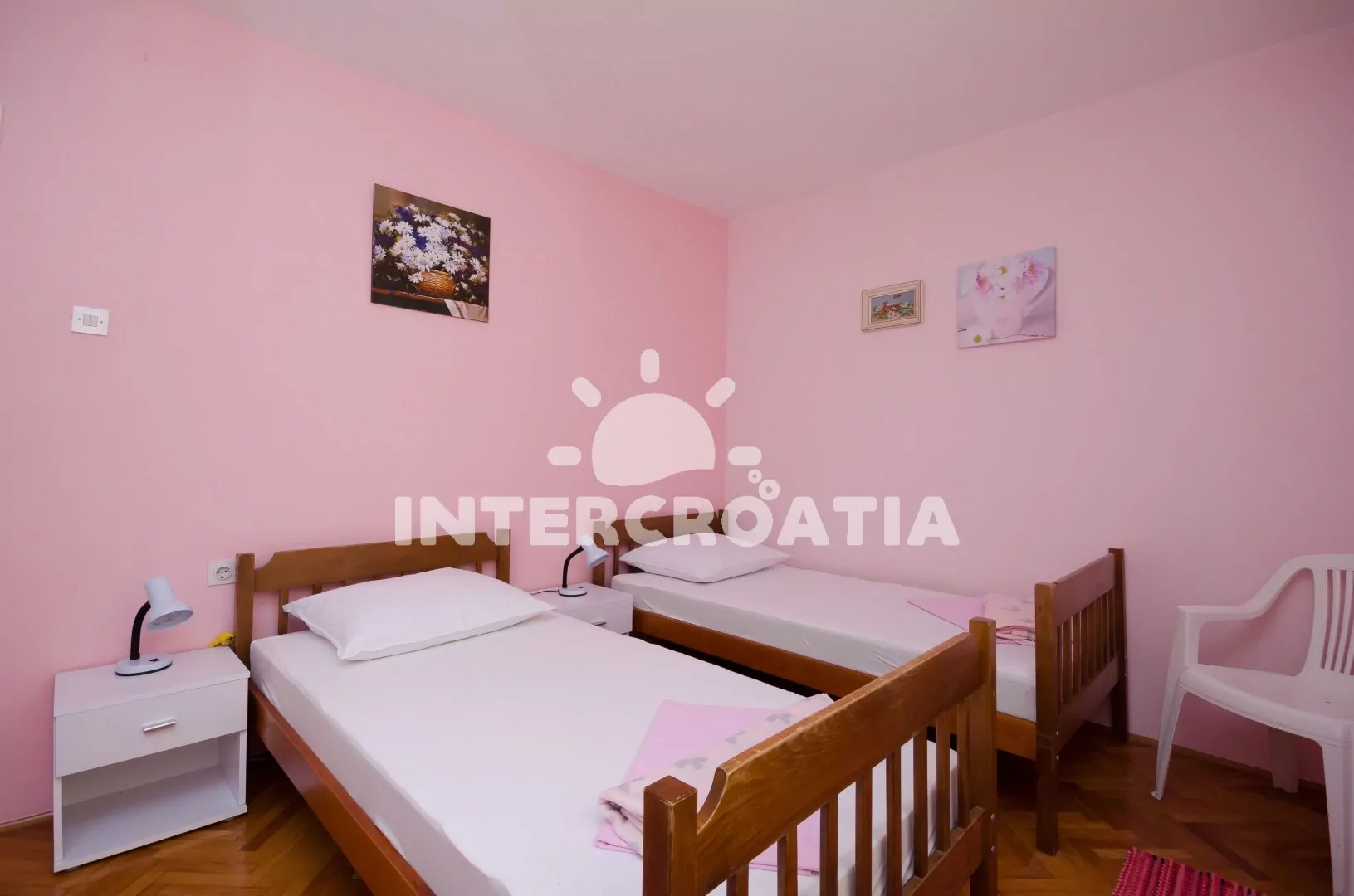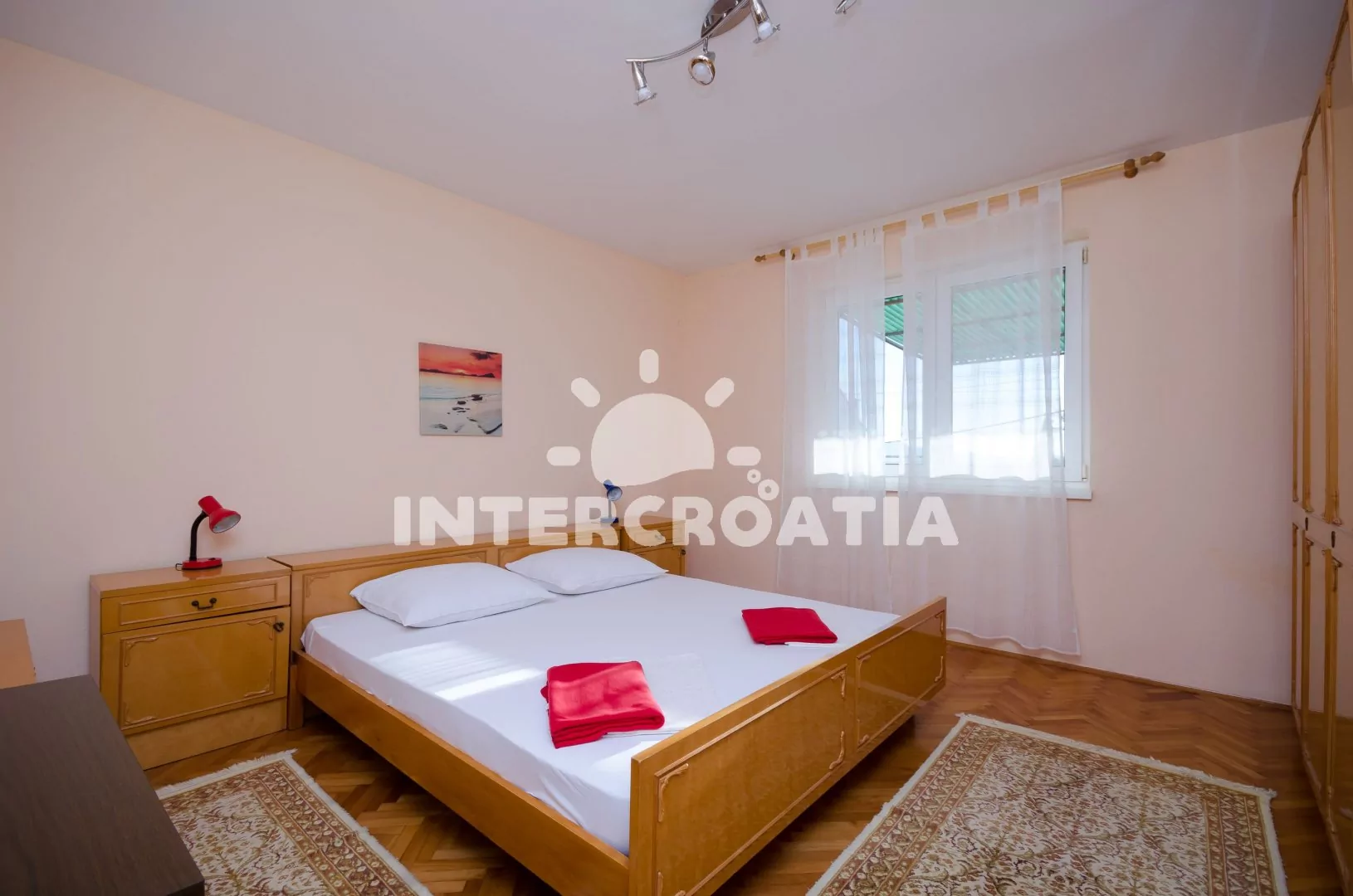 Apartmán (70 m2) s terasou a výhledem na moře se nachází v přízemí domu. Apartmán je vhodný pro 4 až 5 osob. Obývací pokoj je spojený s kuchyní. Kuchyňská linka je vybavena sporákem s troubou, kávovarem, mikrovlnnou troubou, nádobím a lednicí s mrazákem. Obývací pokoj s jídelním stolem pro 5 osob, pohovkou, televizí se satelitním programem, radiem a vstupem na terasu. Chodba s klimatizací a vstupy do 3 ložnic. První ložnice s dvoulůžkem. Druhá ložnice s dvěma jednolůžky. Třetí ložnice s jedním jednolůžkem. Koupelna se sprchovým koutem, umyvadlem, pračkou a wc. Hostům je k dispozici parkování u objektu zdarma.