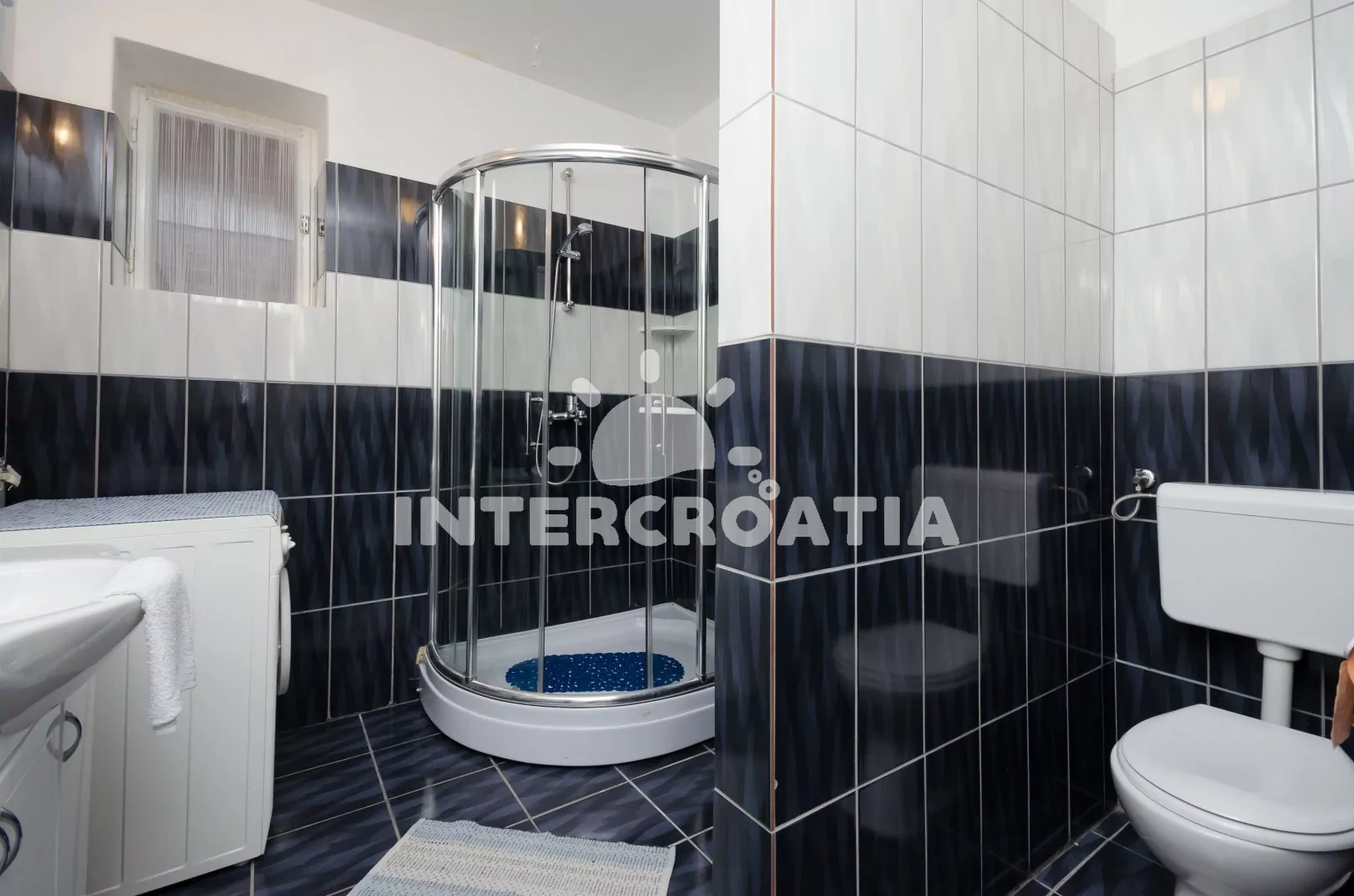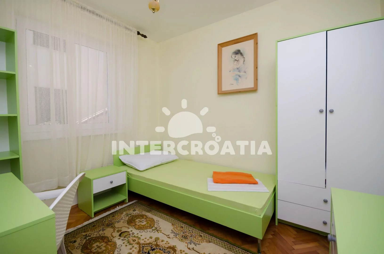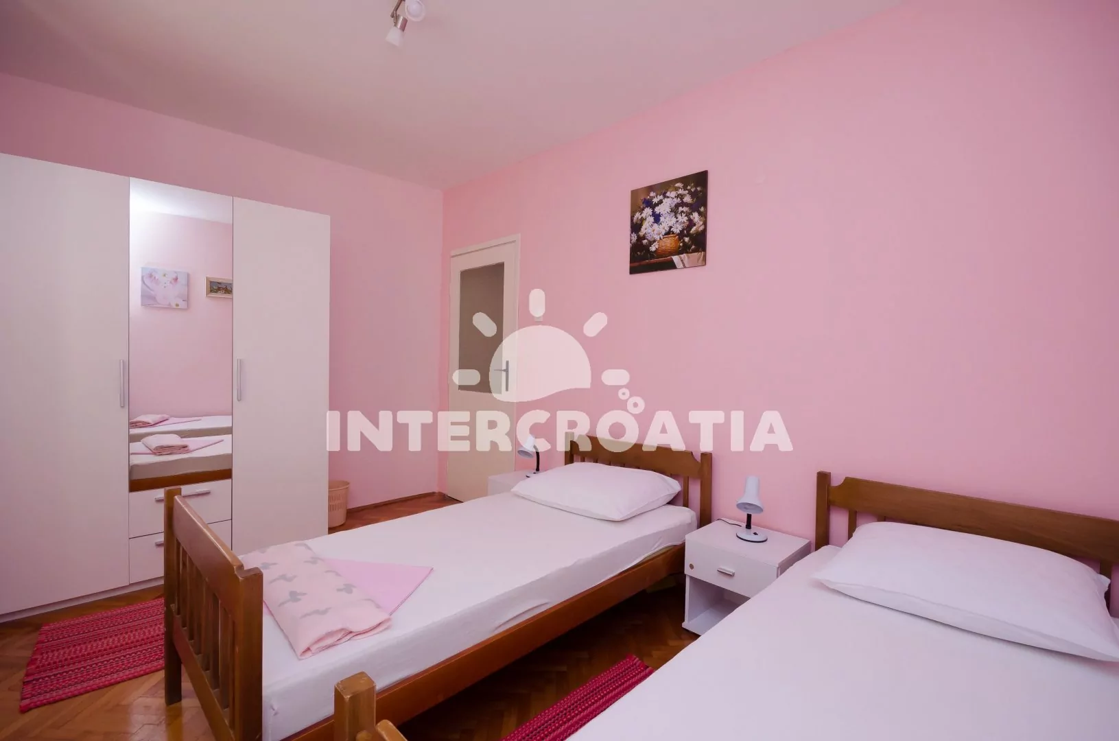 Apartmán (70 m2) s terasou a výhledem na moře se nachází v přízemí domu. Apartmán je vhodný pro 4 až 5 osob. Obývací pokoj je spojený s kuchyní. Kuchyňská linka je vybavena sporákem s troubou, kávovarem, mikrovlnnou troubou, nádobím a lednicí s mrazákem. Obývací pokoj s jídelním stolem pro 5 osob, pohovkou, televizí se satelitním programem, radiem a vstupem na terasu. Chodba s klimatizací a vstupy do 3 ložnic. První ložnice s dvoulůžkem. Druhá ložnice s dvěma jednolůžky. Třetí ložnice s jedním jednolůžkem. Koupelna se sprchovým koutem, umyvadlem, pračkou a wc. Hostům je k dispozici parkování u objektu zdarma.