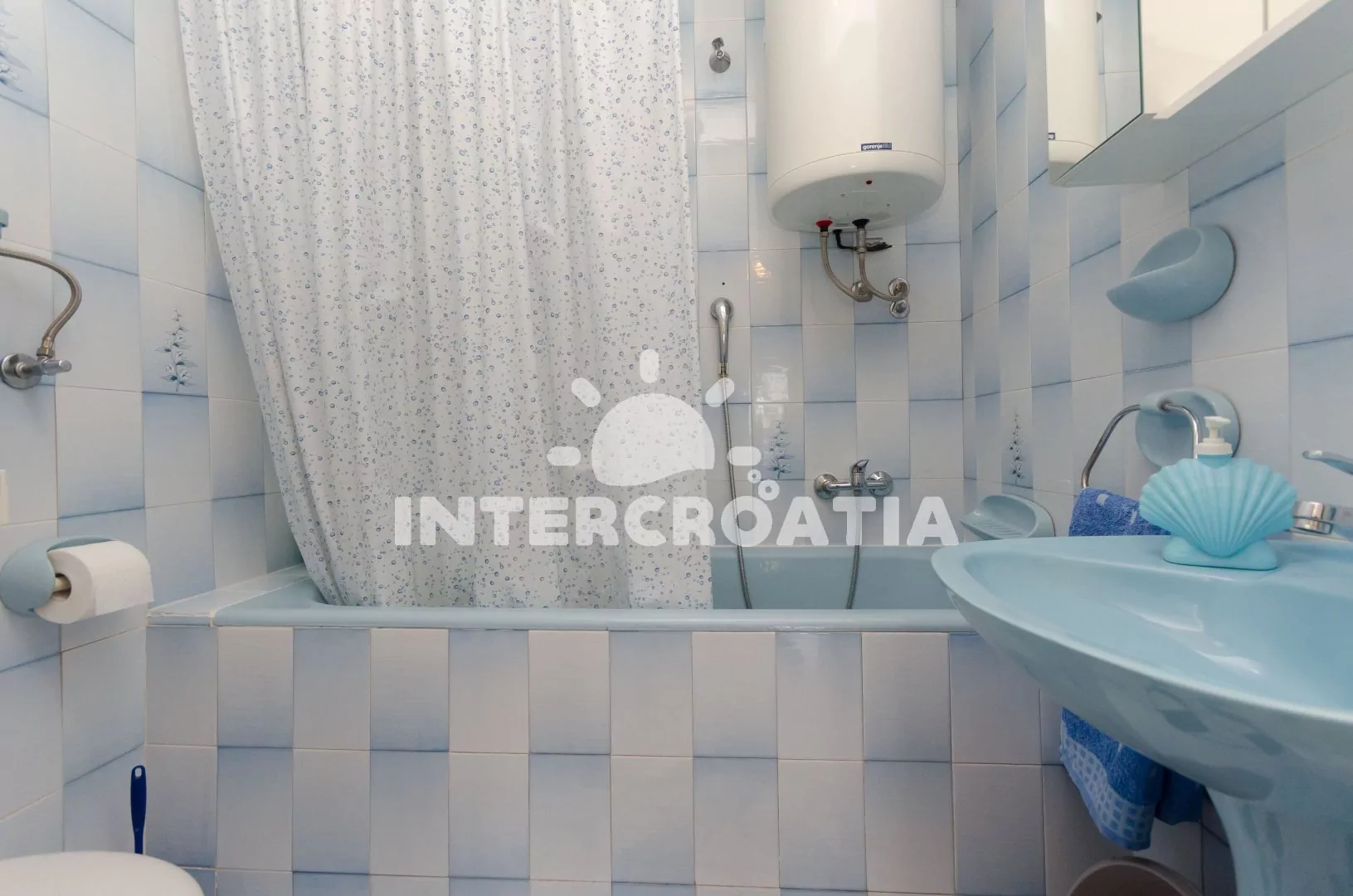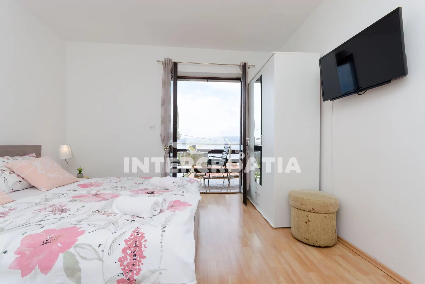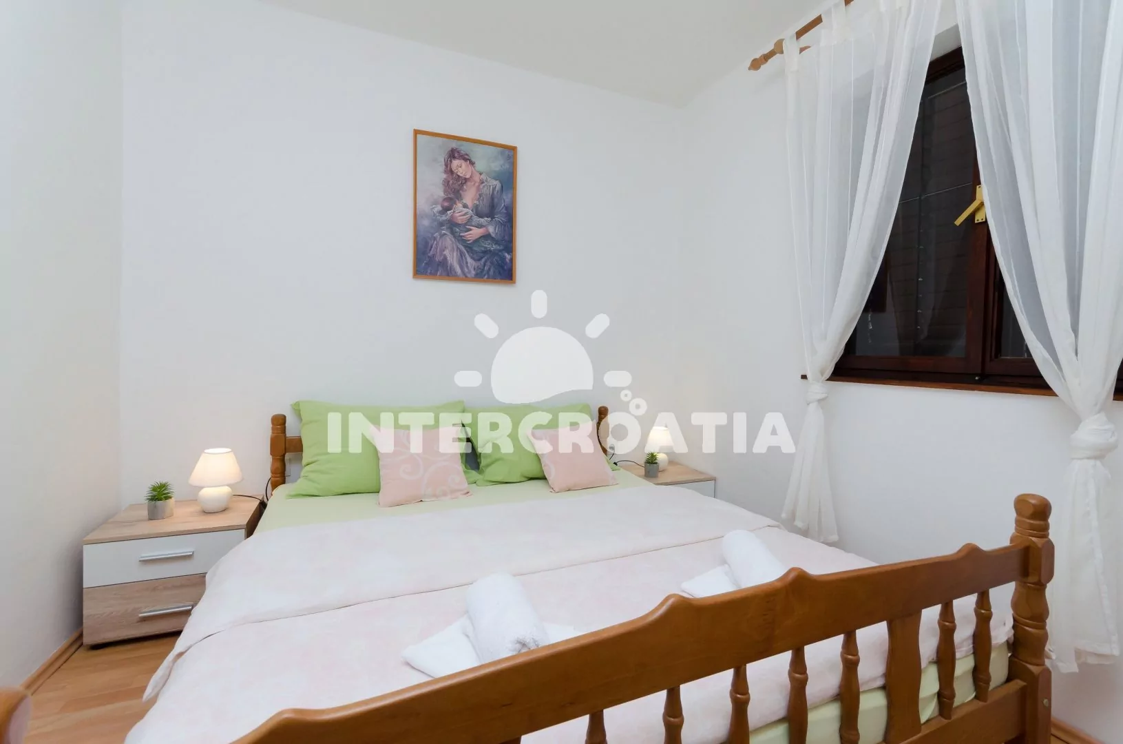 Apartmán (42 m2) s balkonem, posezením a výhledem na moře se nachází v 1. patře domu. Apartmán má 2 ložnice a je vhodný pro 4 až 5 osob. Vstupní chodba s kuchyní, klimatizací a jídelním stolem. Kuchyňská linka je vybavena, dvouplotýnkovým vařičem, rychlovarnou konvicí, kávovarem, toustovačem, nádobím a lednicí s mrazákem. První ložnice s dvoulůžkem, přistýlkou (rozložitelné lůžko pro 1 osobu), televizí se satelitním programem a vstupem na balkon. Druhá ložnice s dvoulůžkem. Koupelna s vanou, sprchovou zástěnou, umyvadlem a wc. Hostům je k dispozici parkování u objektu zdarma.