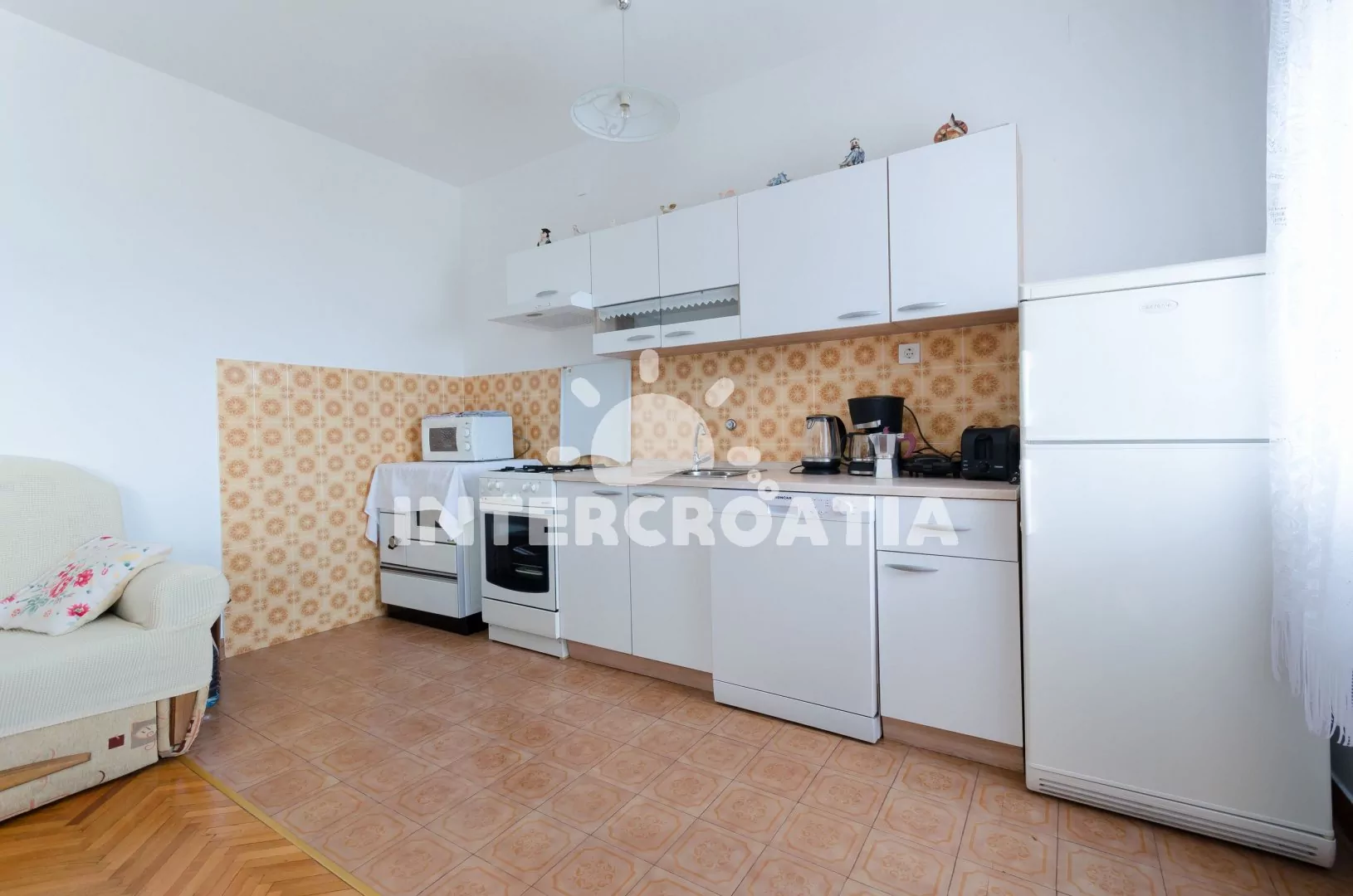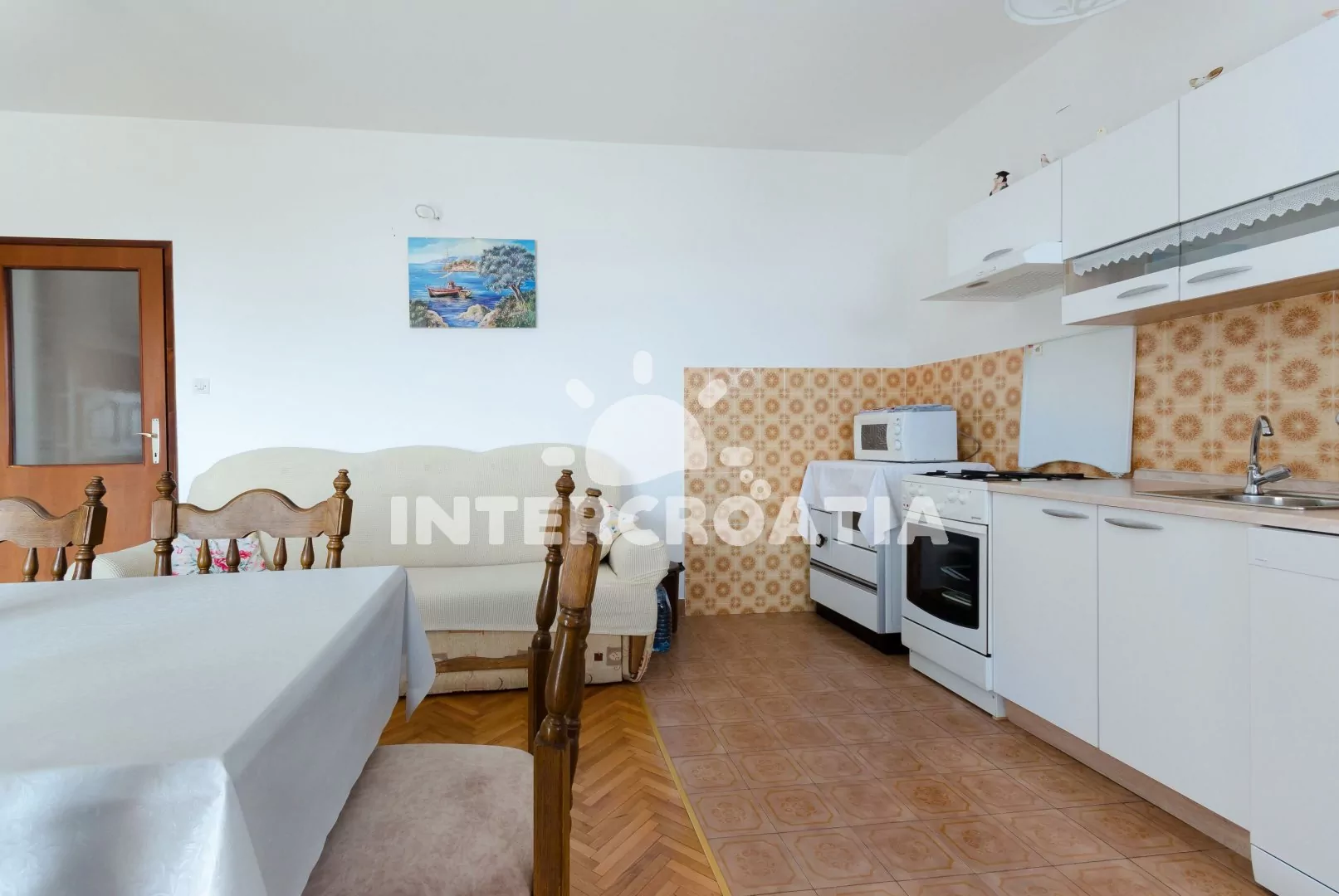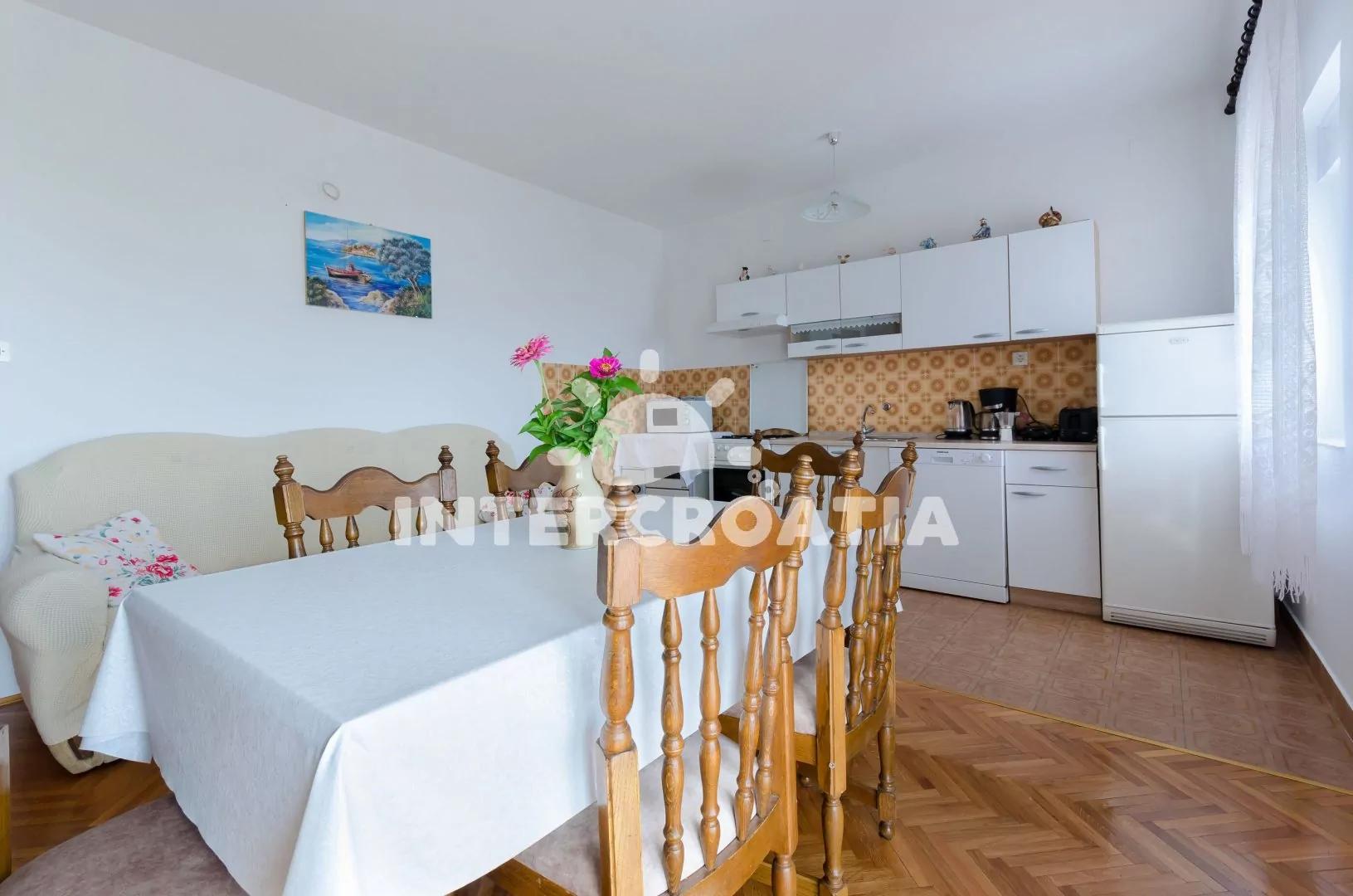 Apartmán (100 m2) s terasou, venkovním posezením a výhledem na moře se nachází v 1. patře domu. Apartmán má 3 ložnice a je vhodný pro až 6 osob. Obývací pokoj je spojený s kuchyní. Kuchyňská linka je…