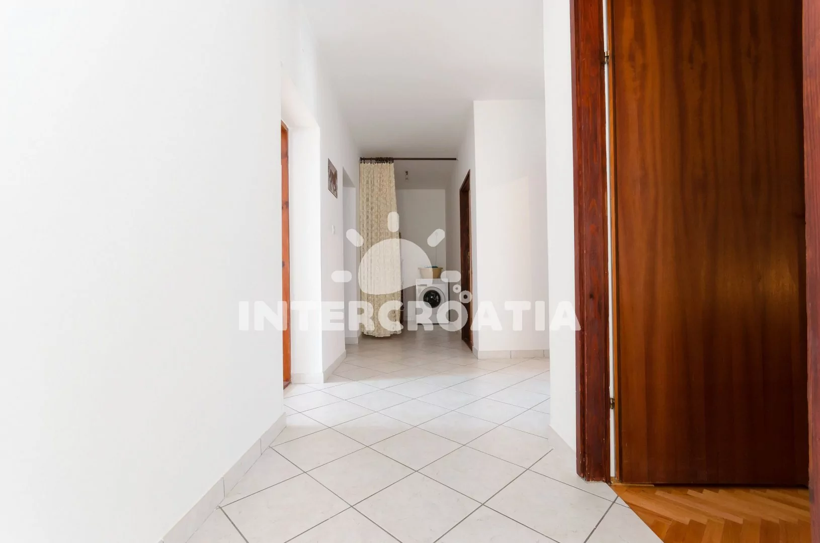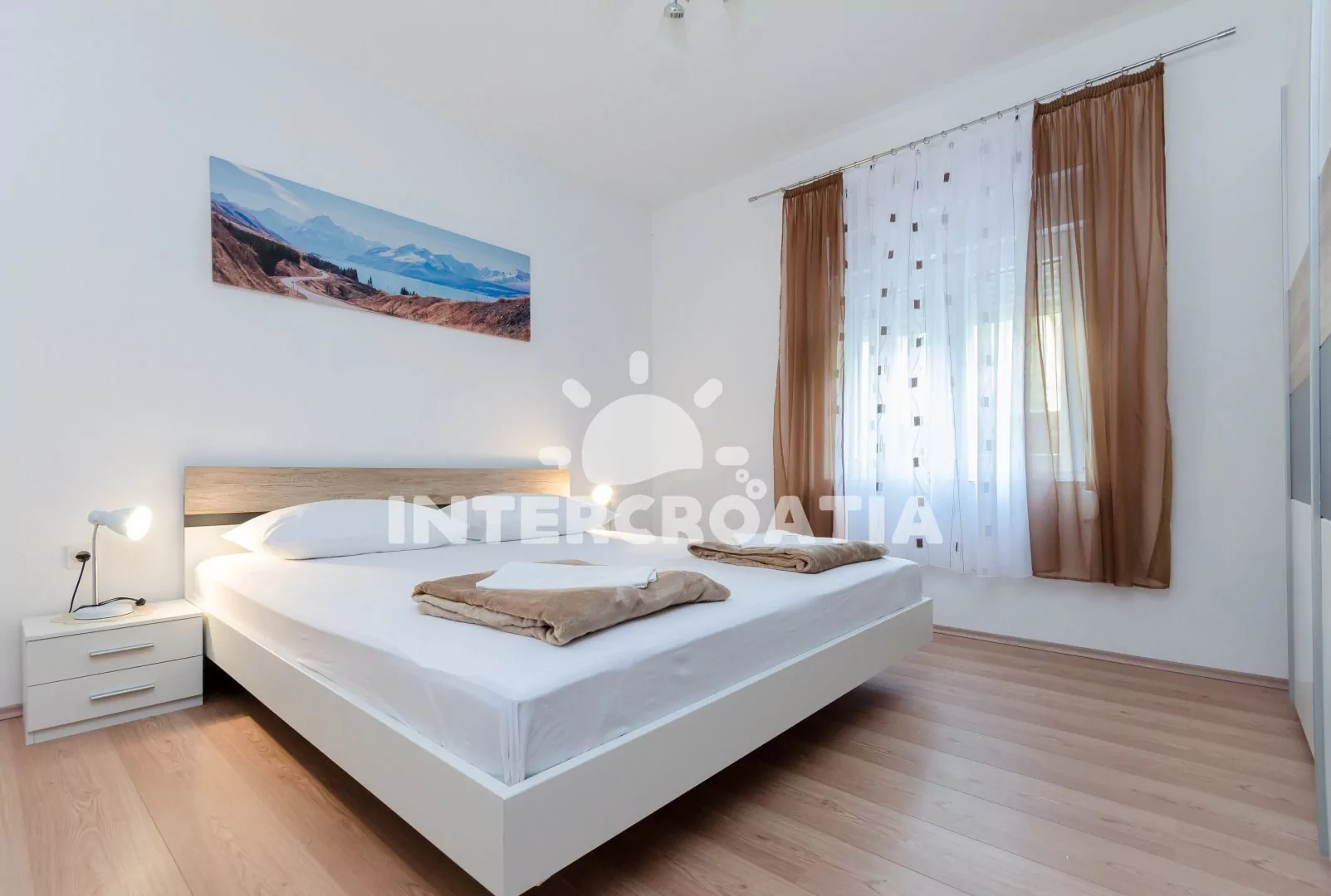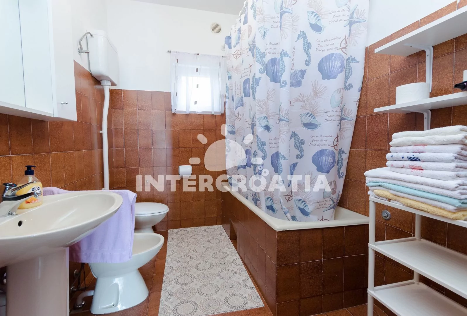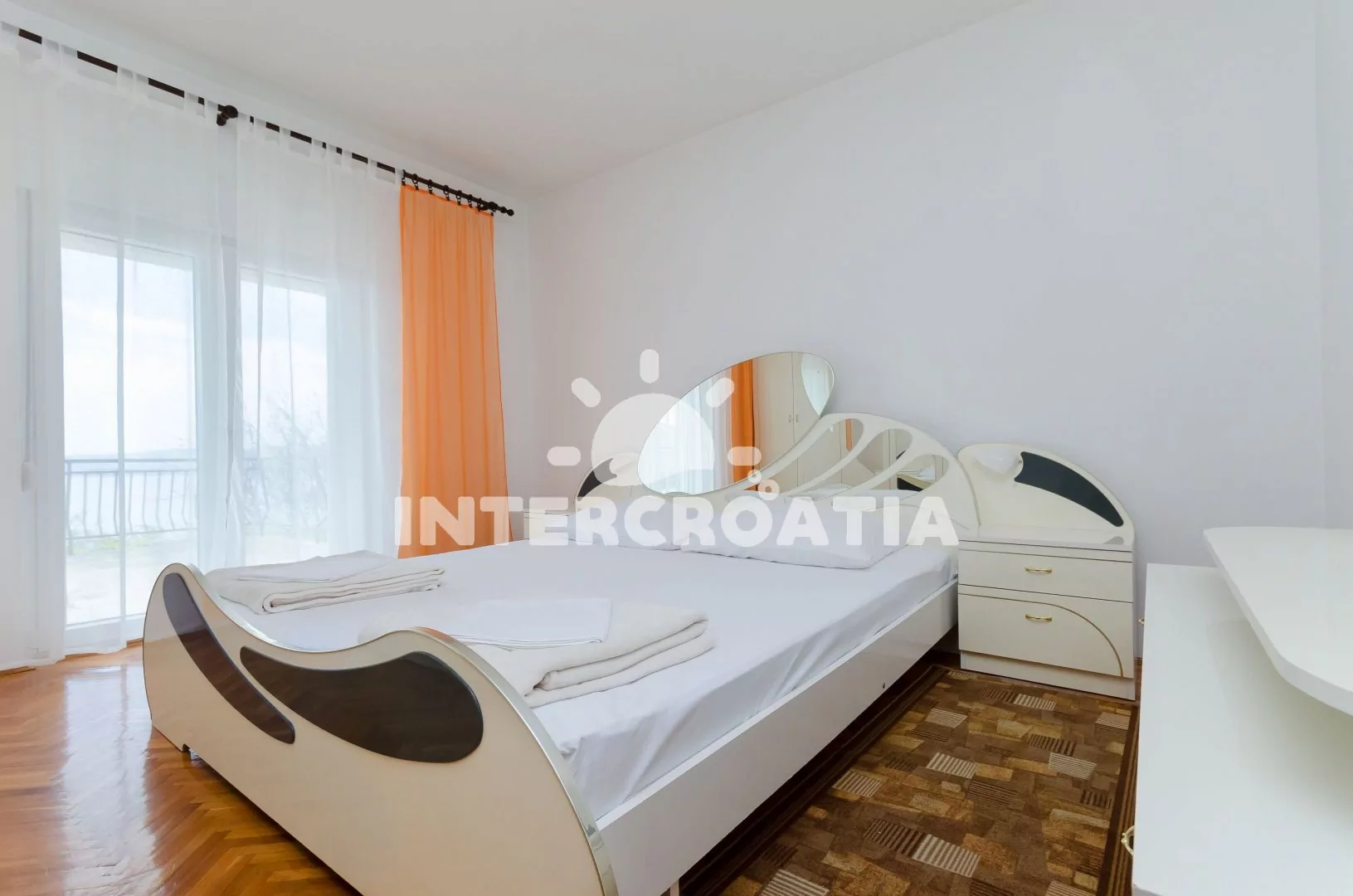 Apartmán (100 m2) s terasou, venkovním posezením a výhledem na moře se nachází v 1. patře domu. Apartmán má 3 ložnice a je vhodný pro až 6 osob. Obývací pokoj je spojený s kuchyní. Kuchyňská linka je vybavena sporákem s troubou, myčkou na nádobí, mikrovlnnou troubou, kávovarem, rychlovarnou konvicí, toustovačem, nádobím a lednicí s mrazákem. Obývací pokoj s jídelním stolem pro 6 osob, pohovkou, televizí se satelitním programem, klimatizací a vstupem na terasu. Všechny 3 ložnice jsou vybaveny vždy s dvoulůžkem. Koupelna s vanou, sprchovou zástěnou, umyvadlem, fénem, pračkou, bidetem a wc. Hostům je k dispozici parkování u objektu zdarma.