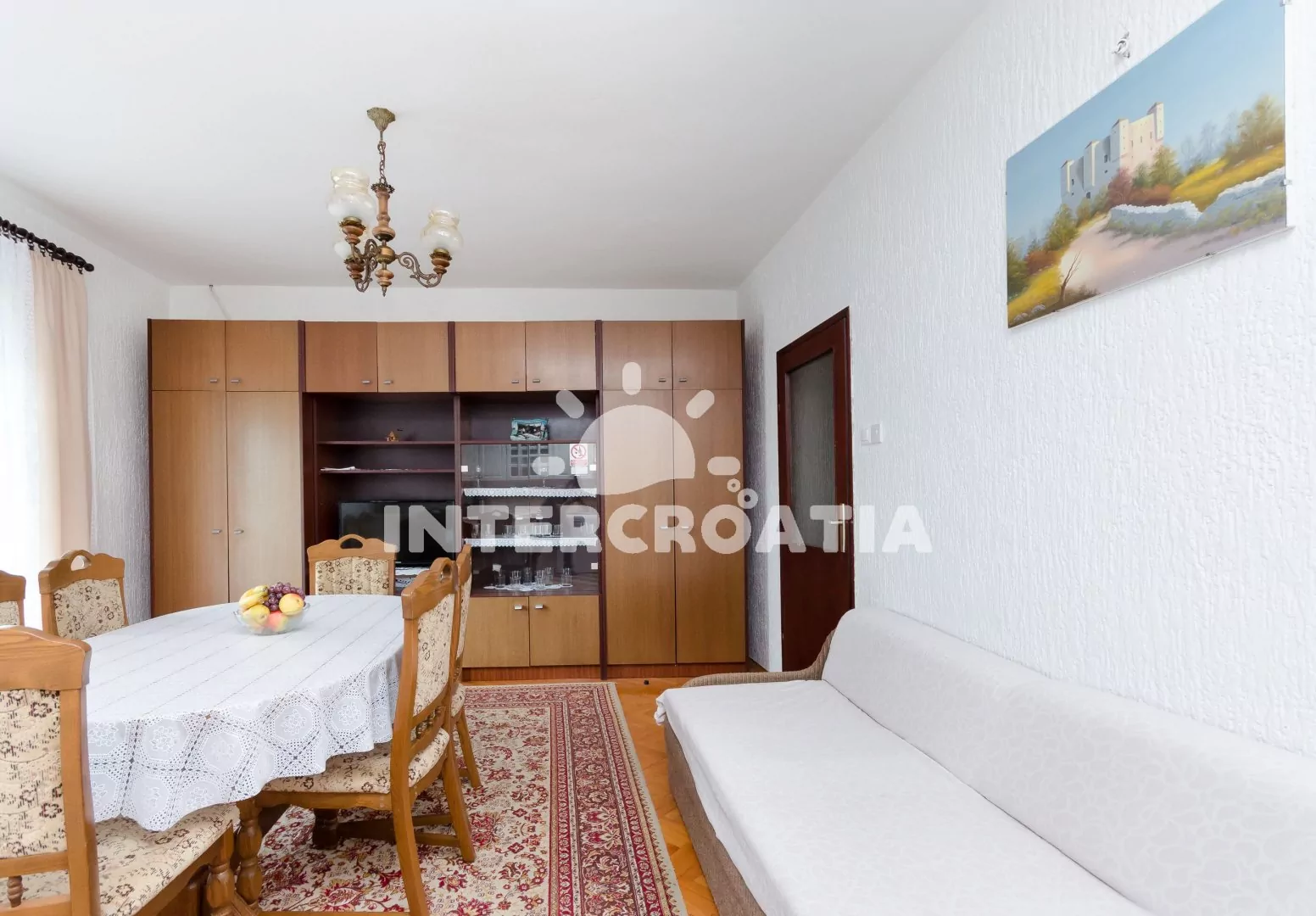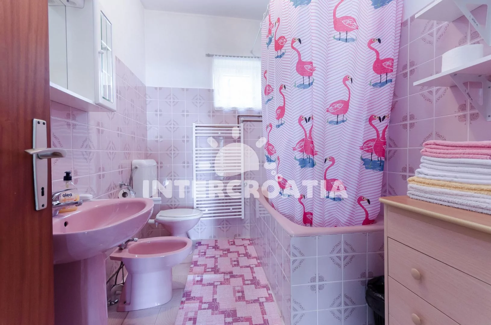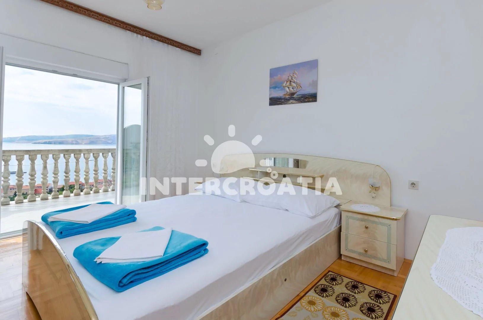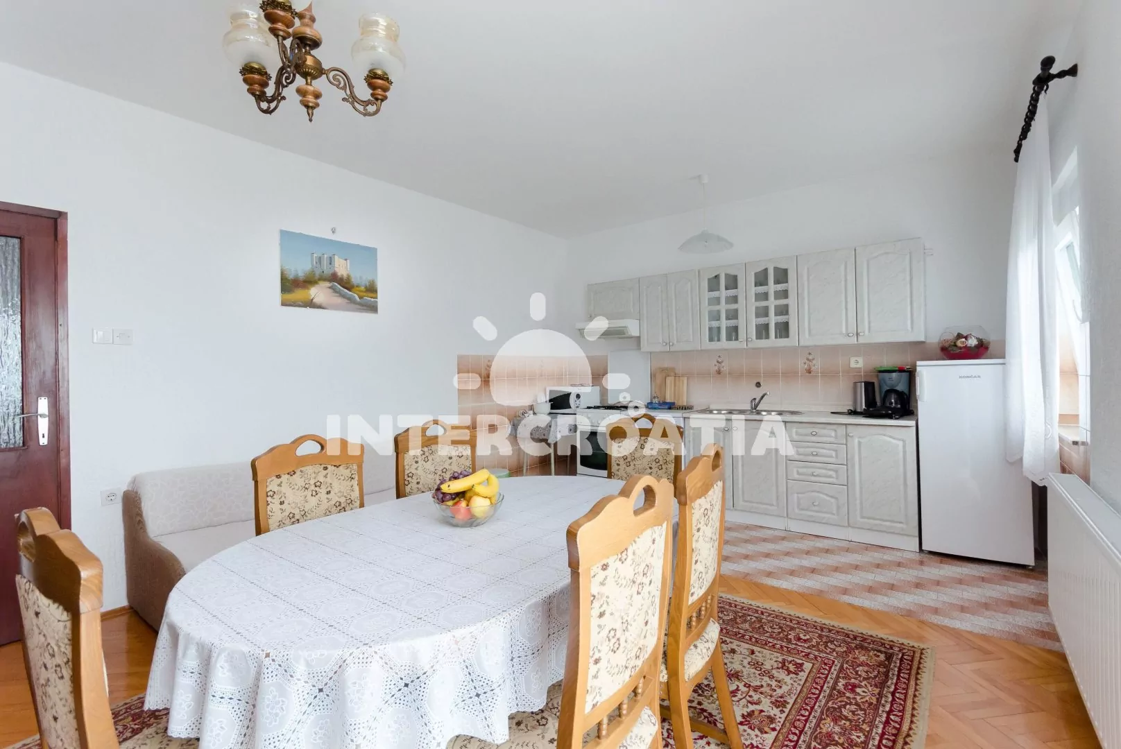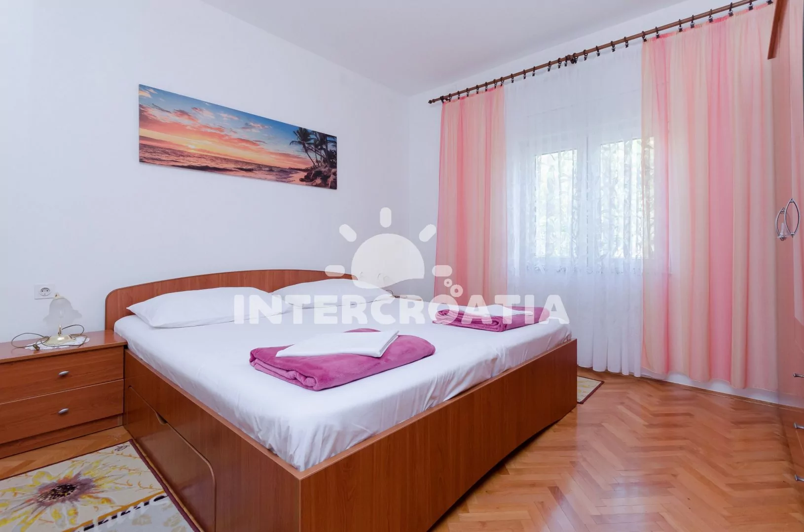 Apartmán (75 m2) s balkonem, venkovním posezením a výhledem na moře se nachází ve 2. patře domu. Apartmán má 2 ložnice a je vhodný pro 4 až 5 osob. Obývací pokoj je spojený s kuchyní. Kuchyňská linka je vybavena sporákem s troubou, digestoří, mikrovlnnou troubou, kávovarem, rychlovarnou konvicí, toustovačem, nádobím a lednicí s mrazákem. Obývací pokoj s jídelním stolem pro 6 osob, pohovkou (rozložitelná na extra lůžko pro 1 osobu), televizí se satelitním programem, klimatizací a vstupem na balkon. První i druhá ložnice je vybavena vždy s dvoulůžkem. Koupelna s vanou, sprchovou zástěnou, umyvadlem, fénem, pračkou, bidetem a wc. Hostům je k dispozici parkování u objektu zdarma.