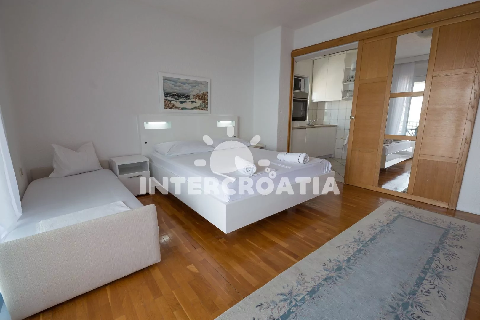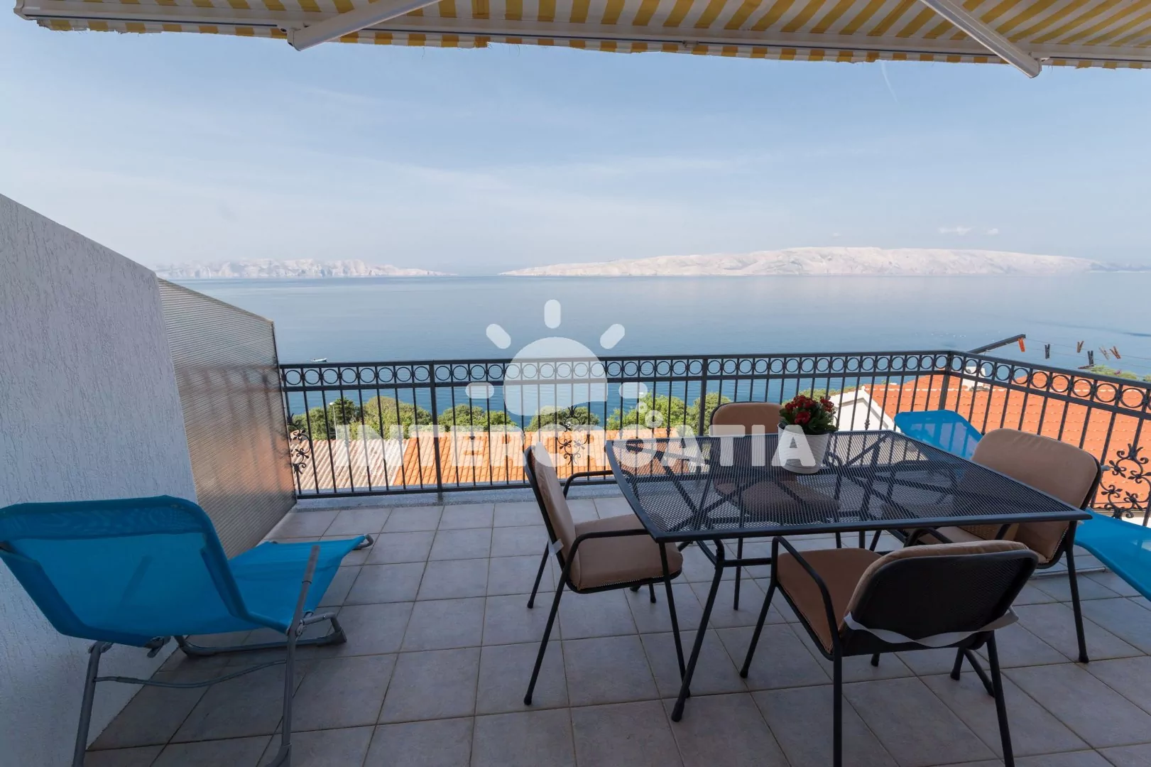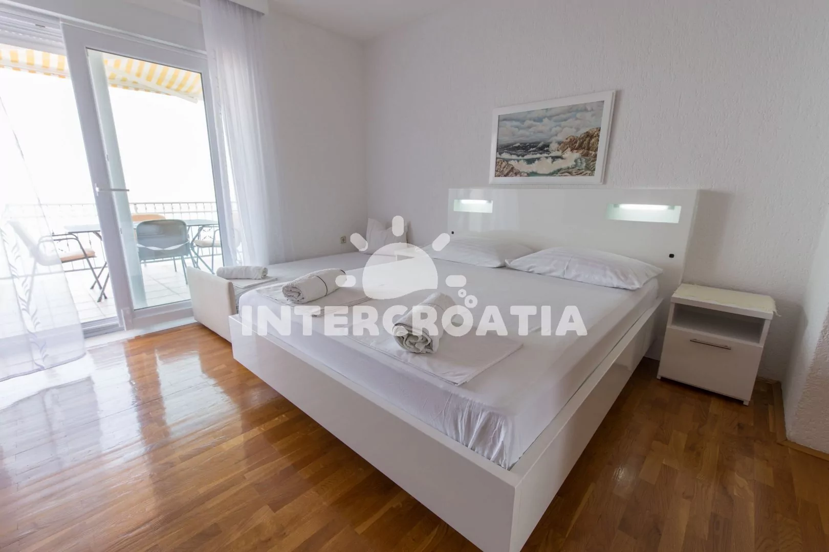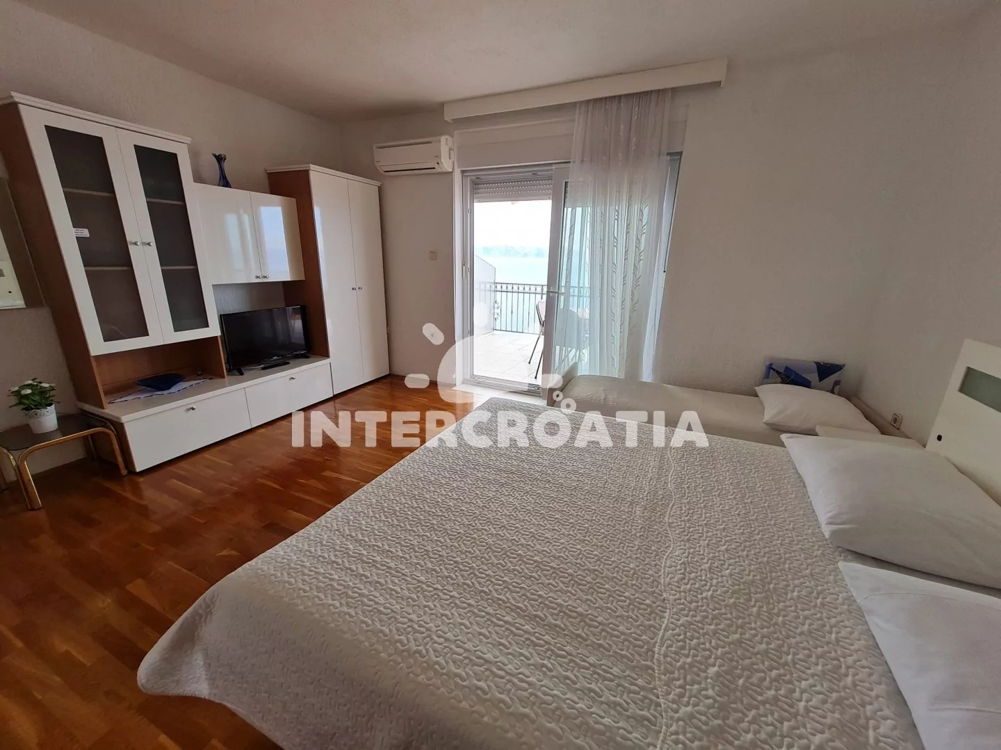 Apartmán (45 m2) s výhledem na moře se nachází ve druhém patře domu. Apartmán je vhodný maximálně pro 3 osoby v 1 ložnici. Kuchyňka s jídelním stolem, troubou, sklokeramickou deskou, mikrovlnou troubou, lednicí s mrazákem, toustovačem, kávovarem, rychlovarnou konvicí, myčkou na nádobí a základním kuchyňským vybavením. Ložnice s dvoulůžkem a jednolůžkem, TV se satelitem, klimatizací a vstupem na terasu (25 m2) s posezením. Koupelna se sprchou, umyvadlem, fénem na vlasy a toaletou. Parkování před objektem zdarma.