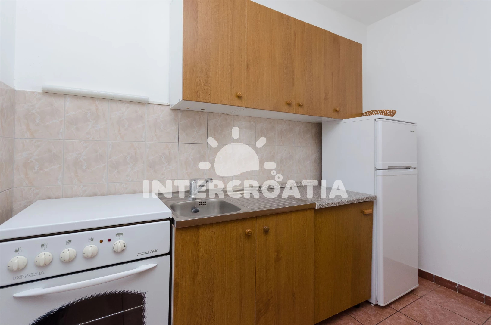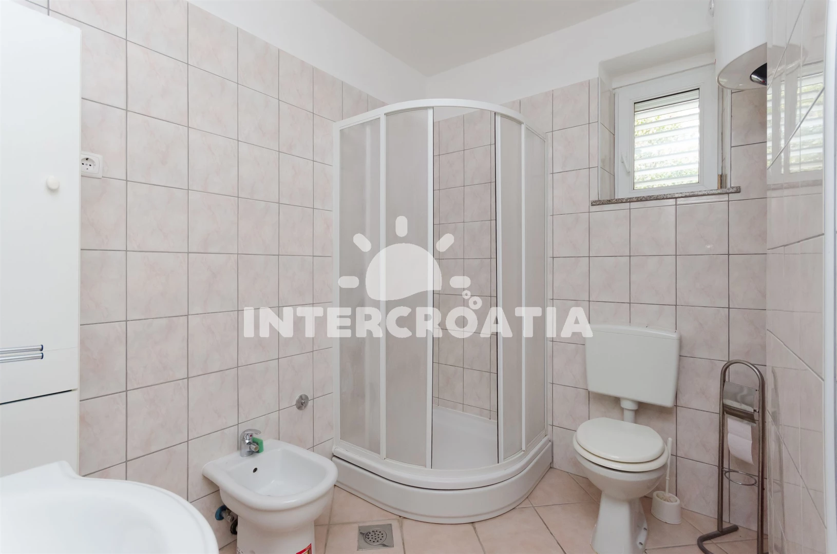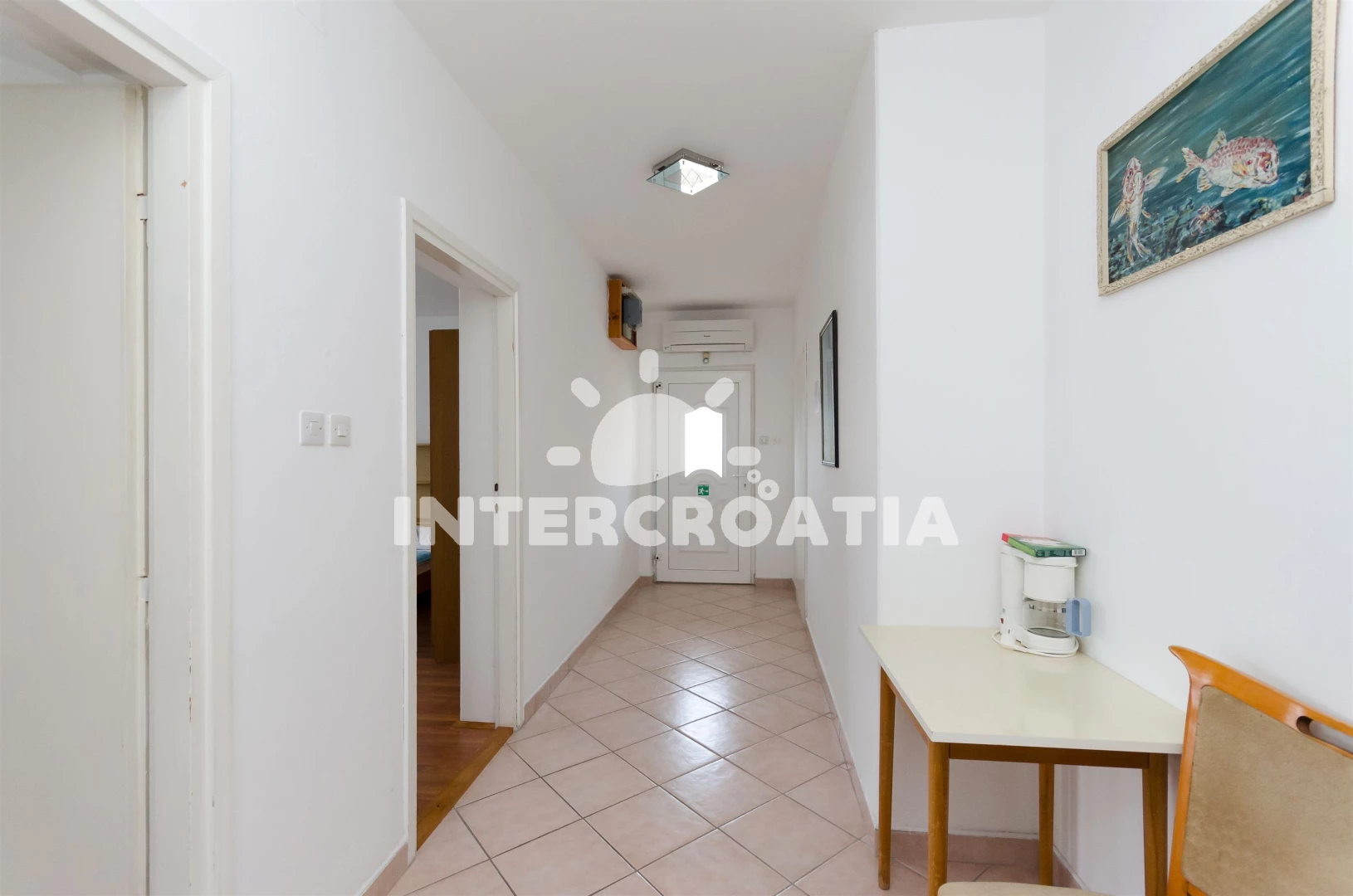 Apartmán se nachází 700 m od moře a pláže. Pláž je skalnatá, oblázková, větší kamení a betonové desky. U objektu je k dispozici společná zahrada s posezením a grilem. Parkování je před domem.