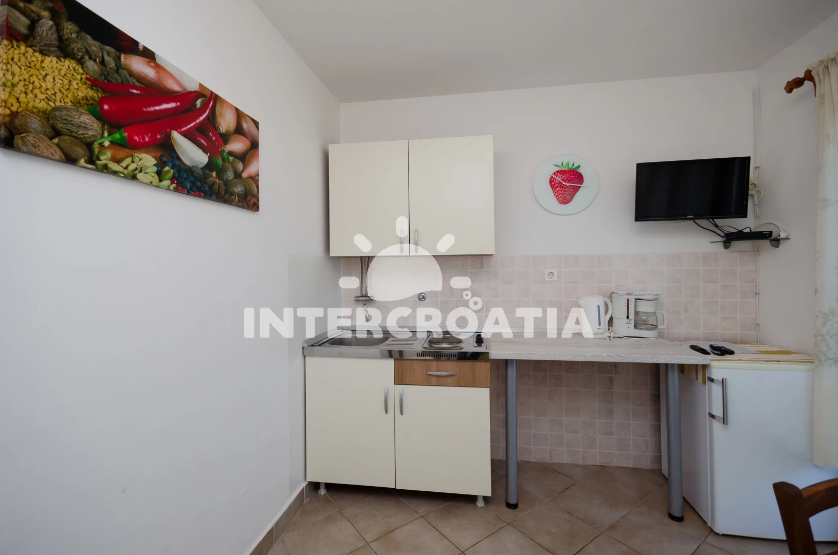 Die Küche verfügt über eine Kaffeemaschine, 2 Herdplatten, einen Kühlschrank mit Eisfach und einen Wasserkocher.