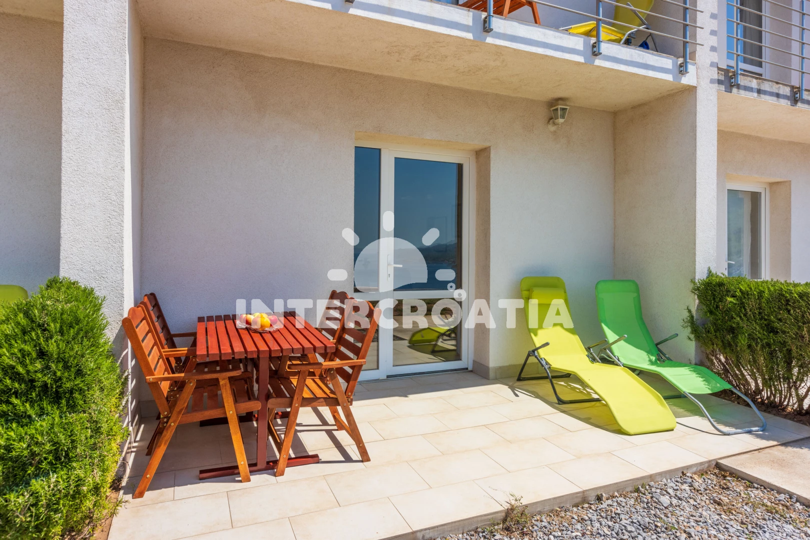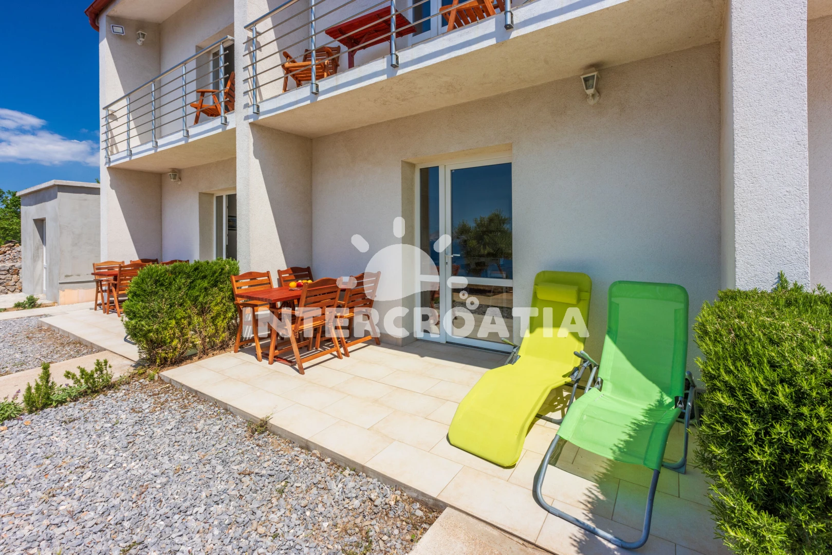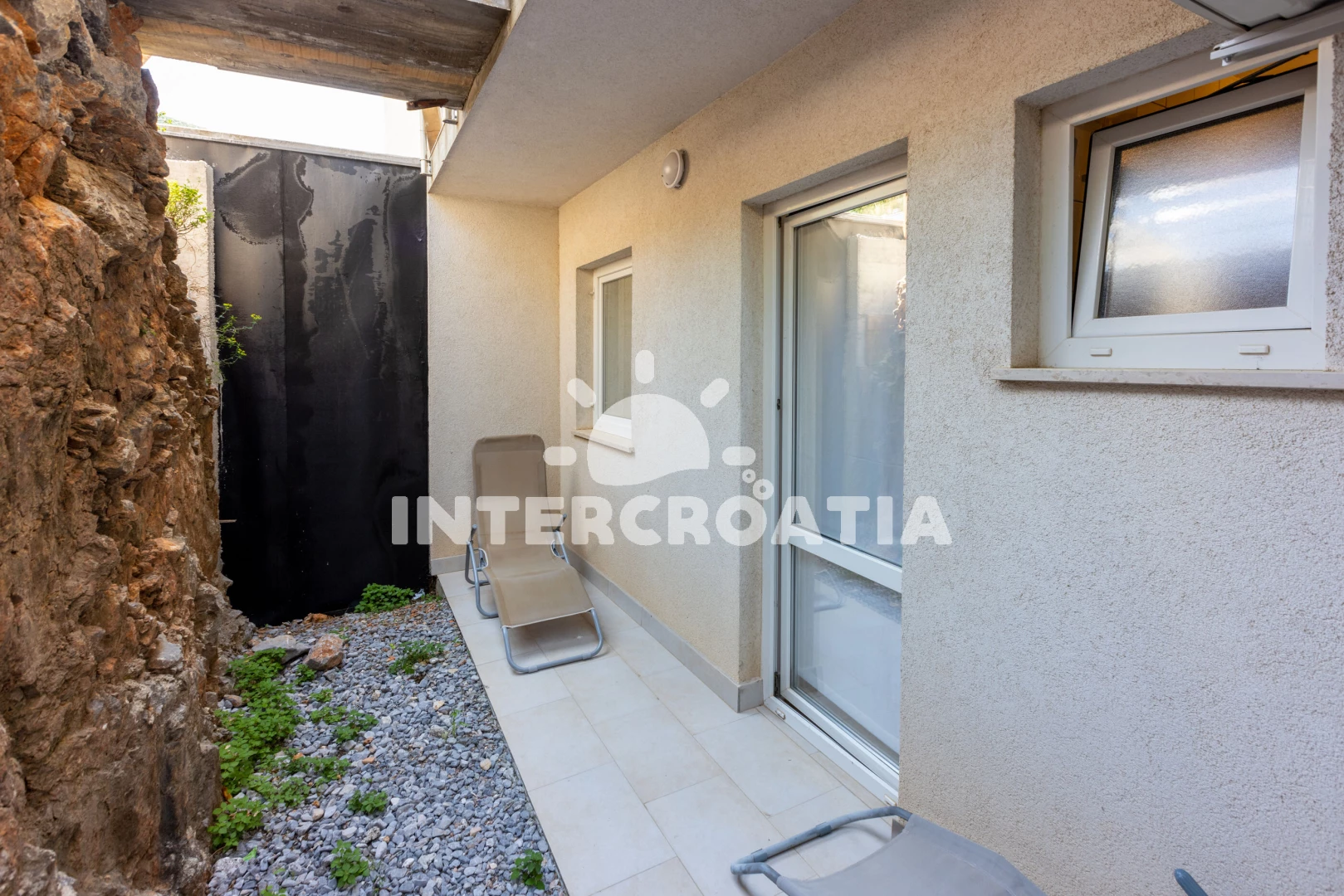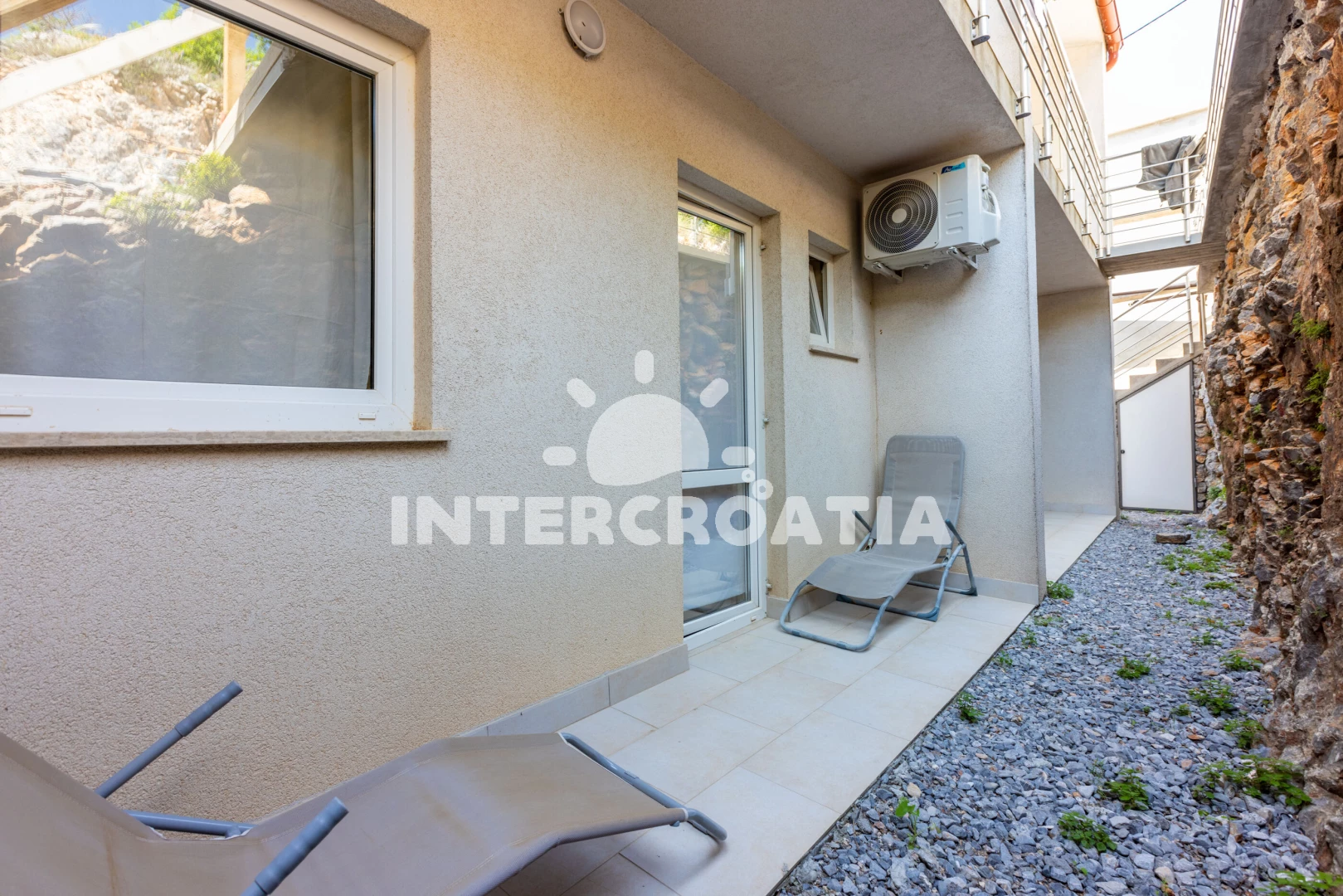 Apartmán se nachází 500 m od moře a pláže. Pláž je skalnatá, oblázková a větší kamení. U objektu je k dispozici společná zahrada s posezením a grilem. Parkování je před domem.
