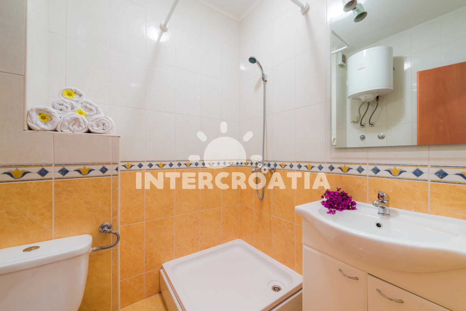 Apartmán (38 m2) s terasou, s balkonem, a výhledem na moře. Nachází se ve 2. patře objektu. Apartmán má 1 ložnici a je vhodný pro až 4 osoby. Kuchyňská linka je vybavena varnou deskou, kávovarem, myčkou na nádobí, rychlovarnou konvicí, nádobím, lednicí. V obývací místnosti je rozložitelná pohovka (extra lůžko pro 2 osoby). K dispozici televize, žehlička. Ložnice s dvoulůžkem. Koupelna se sprchovým koutem, umyvadlem, fénem a WC.