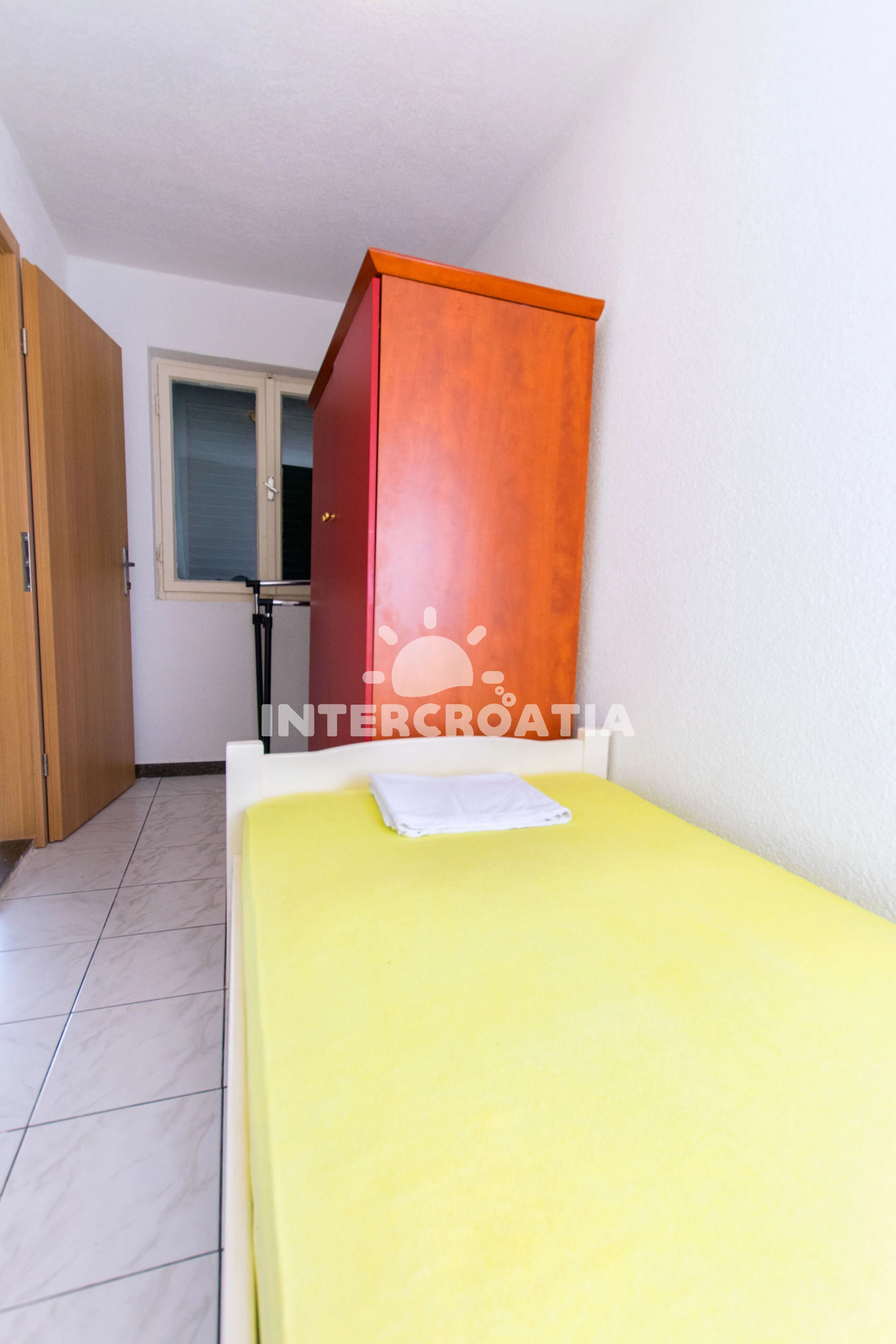 Dvoupatrový apartmán (80 m2) s terasou a venkovním posezením. Apartmán má 3 ložnice a je vhodný pro až 5 osob. Obývací pokoj je spojený s kuchyní. Kuchyňská linka je vybavena varnou deskou, vestavěnou troubou, myčkou na nádobí, rychlovarnou konvicí, kávovarem, toustovačem, nádobím a lednicí s mrazákem. Obývací pokoj s jídelním stolem, pohovkou a televizí se satelitním programem. Chodba s klimatizací, pračkou, vstupy do ložnic a na terasu. První i druhá ložnice je vybavena vždy s jedním dvoulůžkem. Třetí ložnice s jedním jednolůžkem. Koupelna se sprchovým koutem, umyvadlem, pračkou, fénem a wc. Dále je k dispozici žehlička a parkování u objektu zdarma.