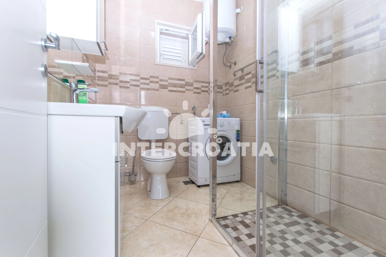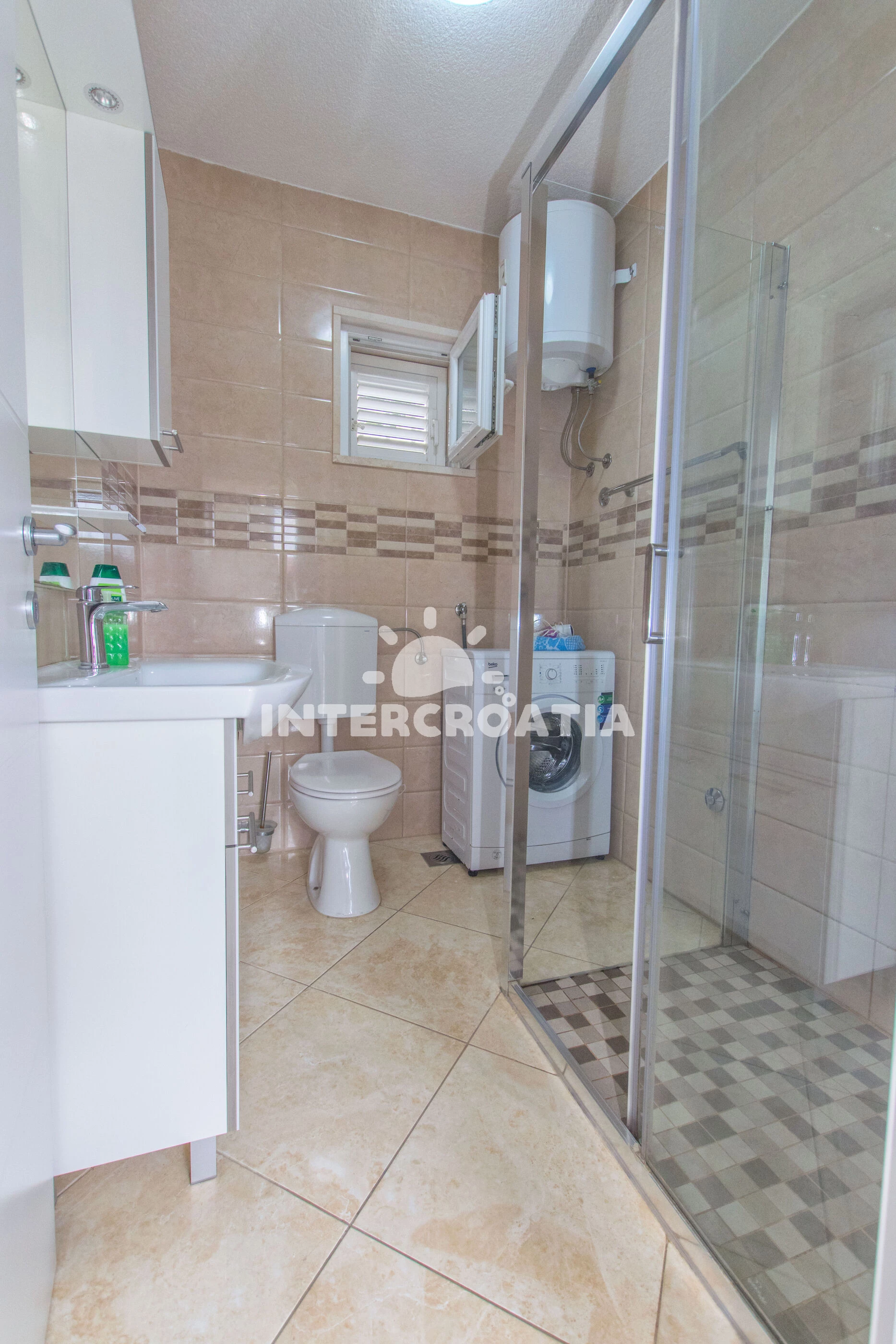 Apartmán (80 m2) s terasou a venkovním posezením se nachází v přízemí domu. Apartmán má 2 ložnice a je vhodný pro až 5 osob. Obývací pokoj je spojený s kuchyní. Kuchyňská linka je vybavena varnou deskou, digestoří, vestavěnou troubou, myčkou na nádobí, mikrovlnnou troubou, rychlovarnou konvicí, kávovarem, toustovačem, nádobím a lednicí s mrazákem. Obývací pokoj s jídelním stolem, pohovkou (rozložitelná na extra lůžko pro 1 osobu), televizí se satelitním programem, klimatizací a vstupem na terasu. První i druhá ložnice je vybavena vždy s jedním dvoulůžkem. Koupelna se sprchovým koutem, umyvadlem, pračkou, fénem a wc. Dále je k dispozici žehlička a parkování u objektu zdarma.
