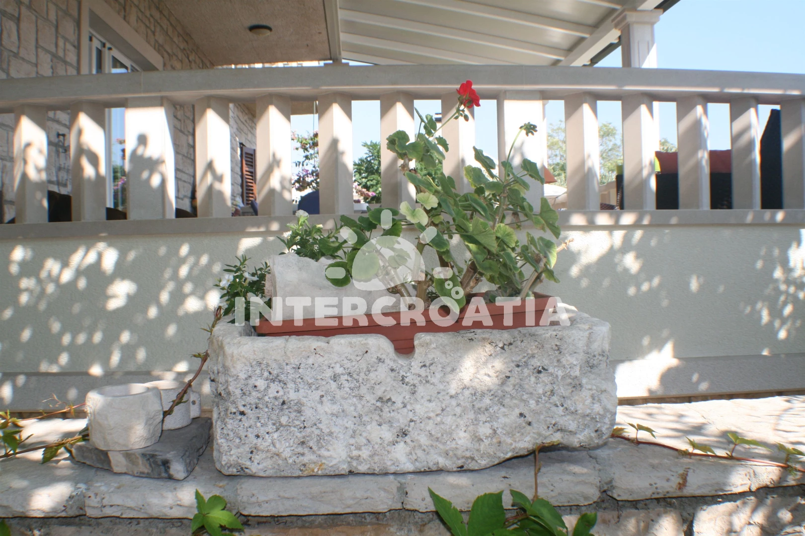 Apartmán se nachází 150 m od moře a pláže. Pláž je písčitá, skalnatá, oblázková, větší kamení a betonové desky. Apartmán disponuje bazénem s lehátky pro ubytované hosty. U objektu je k dispozici společná zahrada s posezením a grilem. Parkování je před domem.