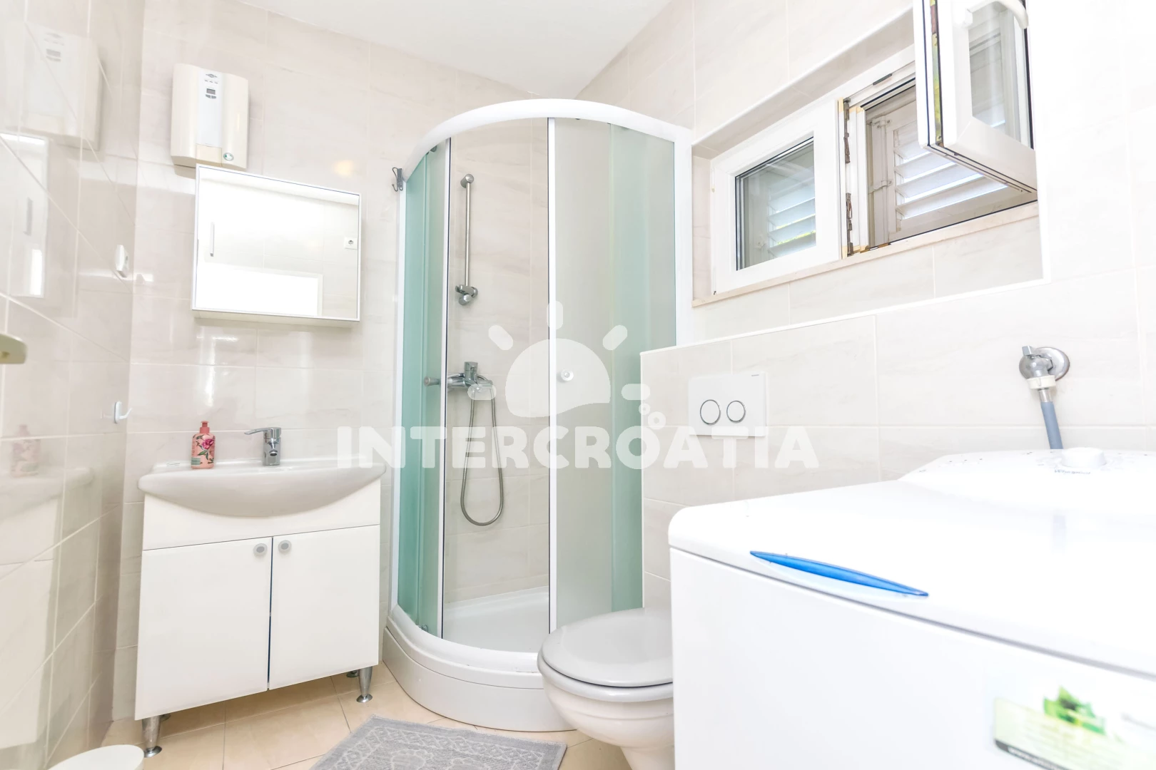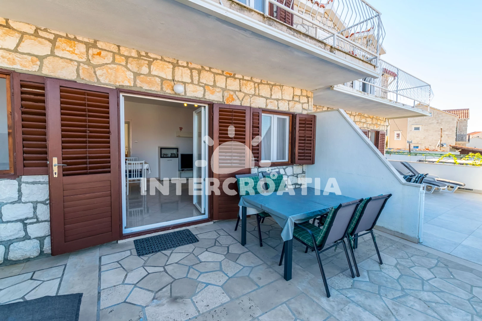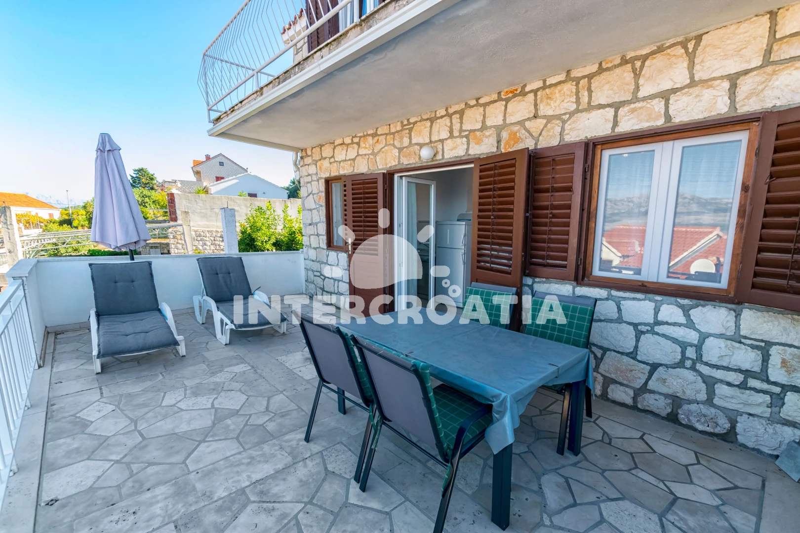 Vzdálenosti: Moře 160 m, pláž 350 m (oblázková a betonové desky), supermarket 250 m, bar 500 m, restaurace 500 m, centrum 850 m, lékárna 850 m, směnárna 850 m, veřejná doprava 1 km, marina 1 km, pošta 1 km, trajekt (Supetar) 11 km, banka 11 km, letiště (Split) 52 km,
