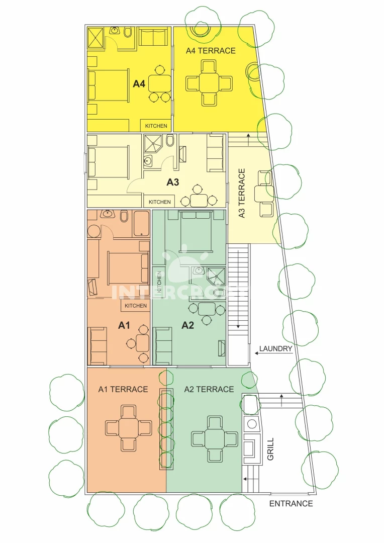 Apartmán (23 m2) s terasou. Nachází se v přízemí objektu. Apartmán má 1 ložnici a je vhodný pro až 3 osoby. Kuchyňská linka je vybavena varnou deskou, nádobím, lednicí. V obývací místnosti je rozložitelná pohovka (extra lůžko pro 1 osobu). K dispozici televize se satelitním programem. Ložnice s dvoulůžkem. Koupelna se sprchovým koutem, umyvadlem, WC.