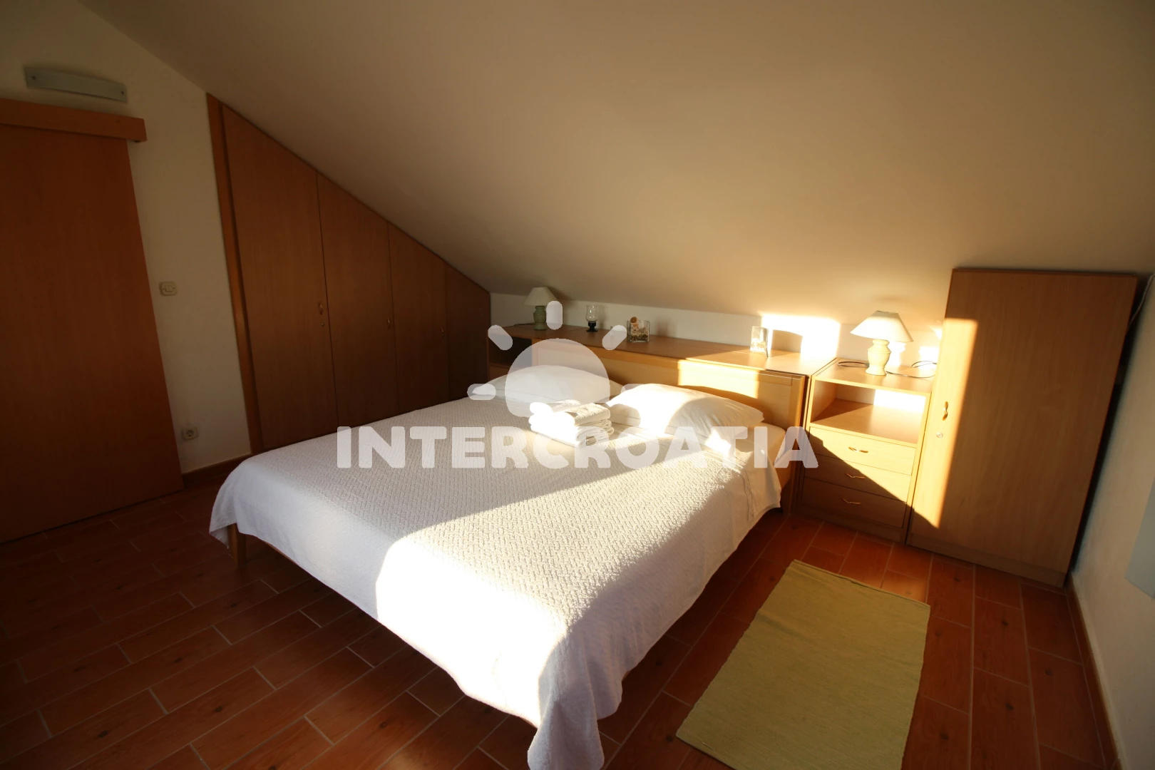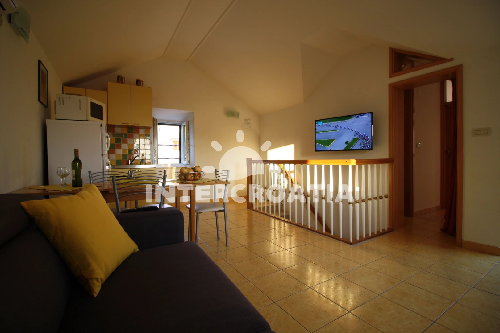 Apartmán (55 m2) s balkonem, a výhledem na moře. Nachází se v podkroví objektu. Apartmán má 1 ložnici a je vhodný pro až 4 osoby. Kuchyňská linka je vybavena varnou deskou, troubou, kávovarem, mikrovlnnou troubou, rychlovarnou konvicí, nádobím, lednicí. V obývací místnosti je rozložitelná pohovka (extra lůžko pro 2 osoby). K dispozici televize, žehlička. Ložnice s dvoulůžkem. Koupelna se sprchovým koutem, umyvadlem, fénem a WC.