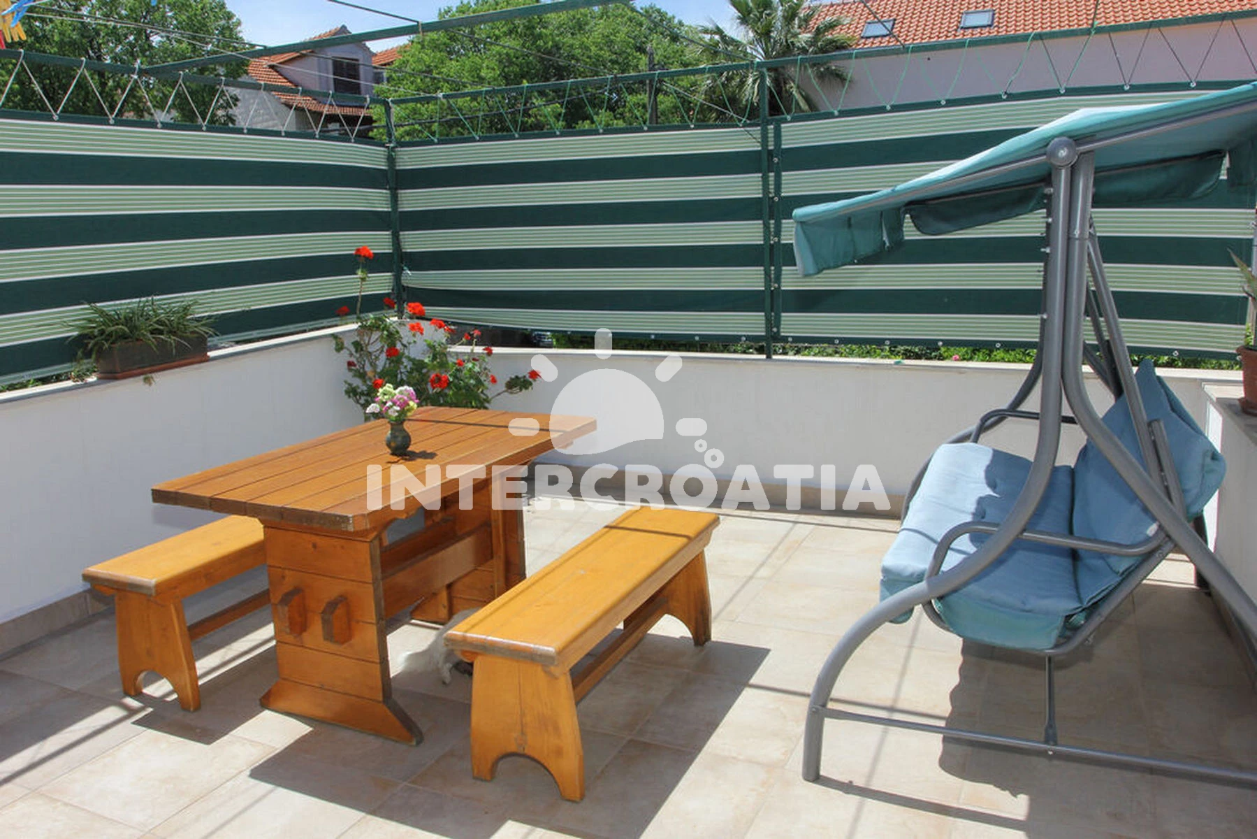 Apartmán (90 m2) s terasou, s balkonem, a výhledem na moře. Nachází se v 1. patře objektu. Apartmán má 3 ložnice a je vhodný pro až 6 osob. Kuchyňská linka je vybavena varnou deskou, troubou, toustovačem, kávovarem, myčkou na nádobí, mikrovlnnou troubou, rychlovarnou konvicí, nádobím, lednicí, mrazákem. V obývací místnosti je rozložitelná pohovka (extra lůžko pro 2 osoby). K dispozici televize se satelitním programem, žehlička. První ložnice s dvoulůžkem. Druhá ložnice s jednolůžkem. Třetí ložnice s jednolůžkem. První koupelna se sprchovým koutem, umyvadlem, fénem a WC. Druhá koupelna se sprchovým koutem, umyvadlem, fénem a WC.