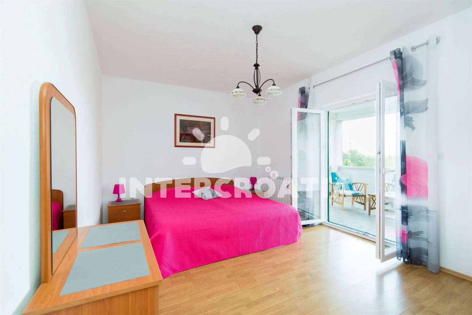 Velmi pěkně zařízený třípokojový apartmán se 2 ložnicemi, balkonem a terasou. Vstup, obývací pokoj spojený s kuchyní. Kuchyňská linka s varnou deskou (elektřina/plyn), lednicí s mrazákem a nádobím. V obývacím pokoji jídelní stůl pro 4 osoby, pohovka a LCD televize. Dvě ložnice, každá s dvoulůžkem. Z druhé ložnice je vstup na balkon. Koupelna s vanou, umyvadlem, wc a pračkou. Hosté mají k dispozici terasu s posezením. Parkování u objektu.