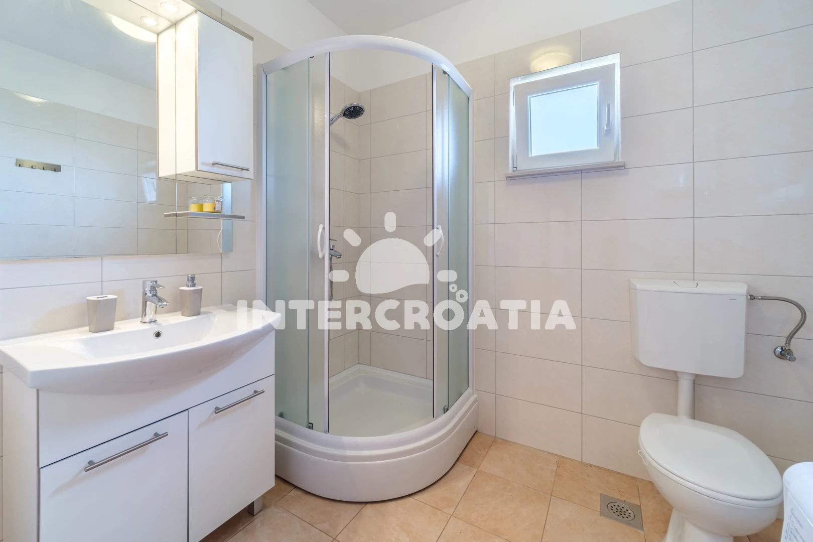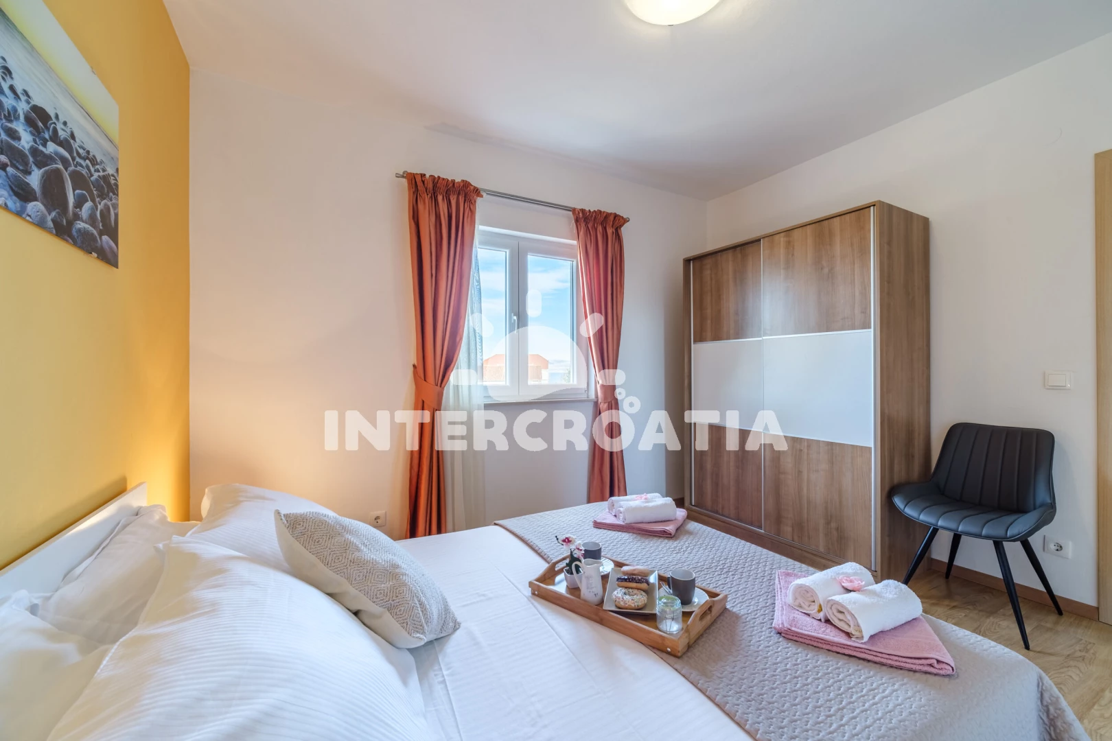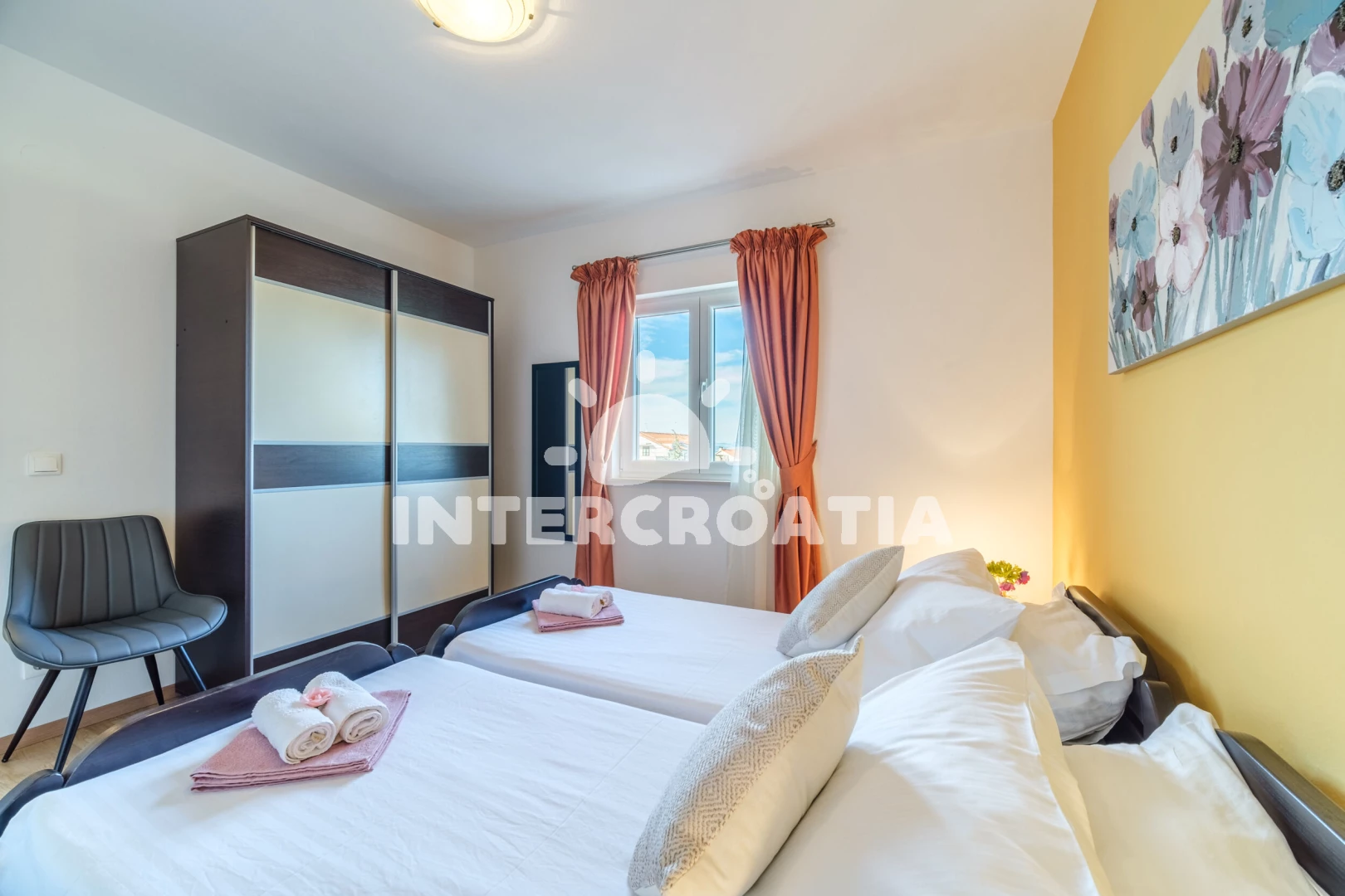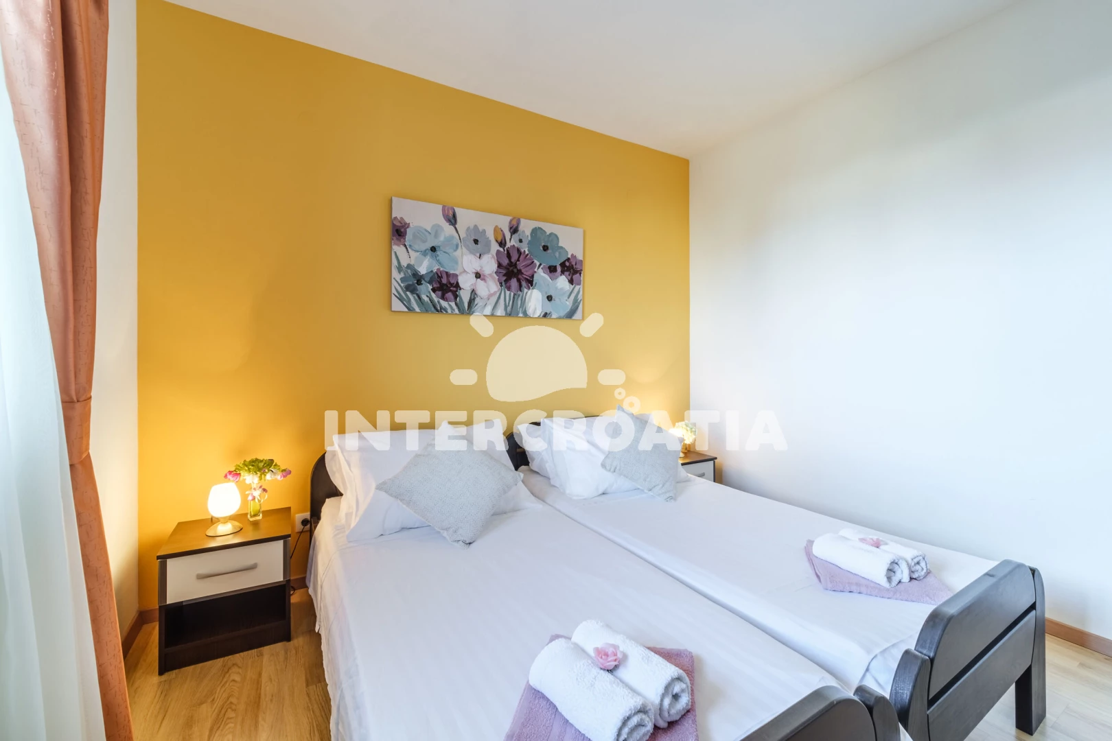 Apartmán (61 m2) s terasou, posezením a částečným výhledem na moře se nachází v přízemí domu. Apartmán má 2 ložnice a je vhodný pro až 5 osob. Obývací pokoj je spojený s kuchyní. Kuchyňská linka je vybavena varnou deskou, mikrovlnnou troubou, rychlovarnou konvicí, kávovarem, toustovačem, nádobím a lednicí s mrazákem. Obývací pokoj s jídelním stolem, pohovkou (rozložitelná na extra lůžko pro 1 osobu), televizí se satelitním programem, rádiem, klimatizací a vstupem na terasu. První ložnice s dvoulůžkem. Druhá ložnice se dvěma jednolůžky. Koupelna se sprchovým koutem, umyvadlem, fénem, pračkou a wc. Hostům je k dispozici parkování u objektu zdarma.